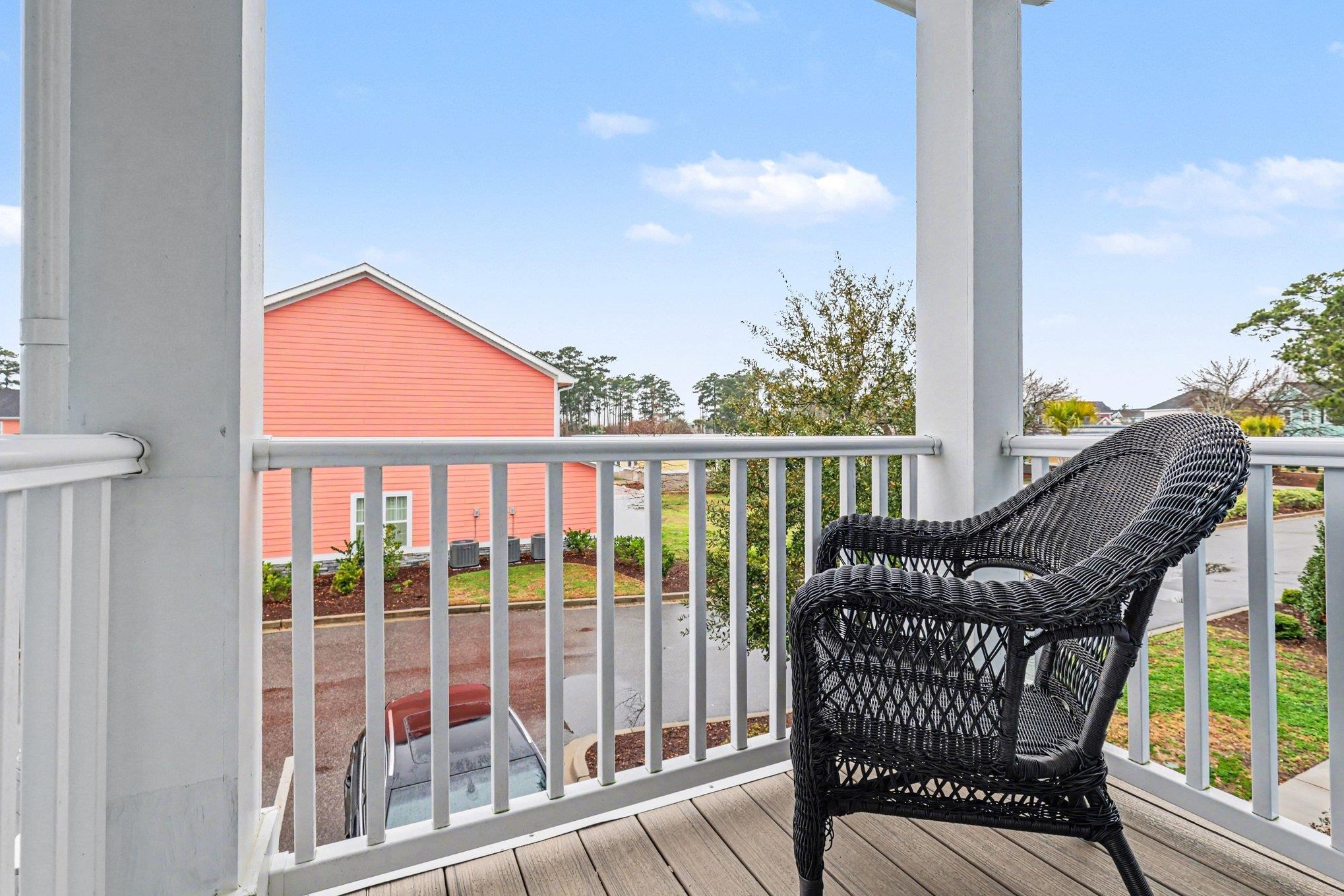 Welcome to effortless coastal living at 812 Moen Place, a beautifully maintained townhome in the highly sought-after High Market community of The Market Common. Located just over a mile from the beach, this move-in-ready 2-bedroom, 2.5-bath residence offers the perfect blend of style, comfort, and walkable convenience in one of Myrtle Beach’s most vibrant neighborhoods. Step inside to an inviting open-concept main level featuring tall ceilings, abundant natural light, and durable luxury vinyl plank flooring. The spacious living and dining areas flow seamlessly into a well-appointed kitchen complete with granite countertops, soft-close cabinetry, recessed lighting, stainless steel appliances, and a functional breakfast bar ideal for entertaining or everyday living. A convenient half bath on the main level adds comfort for guests. Upstairs, both bedrooms offer private en-suite bathrooms and generous closet space, creating an ideal layout for privacy and flexibility. The primary suite feels especially spacious with its elevated ceiling and direct access to a private balcony — a rare and highly desirable feature in this community — perfect for morning coffee or unwinding in the coastal breeze. Both bathrooms feature beautifully tiled showers for a refined, spa-like feel. Enjoy additional outdoor space with your private fenced patio, ideal for relaxing or grilling, along with an attached exterior storage room for bikes, beach gear, or seasonal items. HOA dues provide exceptional value and include cable, internet, water and sewer, trash pickup, lawn care, landscape maintenance, exterior maintenance, and exterior building insurance — allowing for truly low-maintenance living. Life at The Market Common means more than just owning a home. Walk to shops, restaurants, cafés, parks, walking trails, fitness centers, and year-round events. Spend afternoons along the scenic boardwalk or take a quick bike ride to the beach just minutes away. From open green spaces to year-round community events, The Market Common continues to set the standard for vibrant coastal living on the Grand Strand.