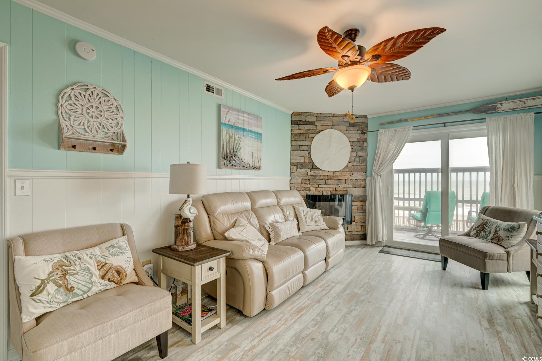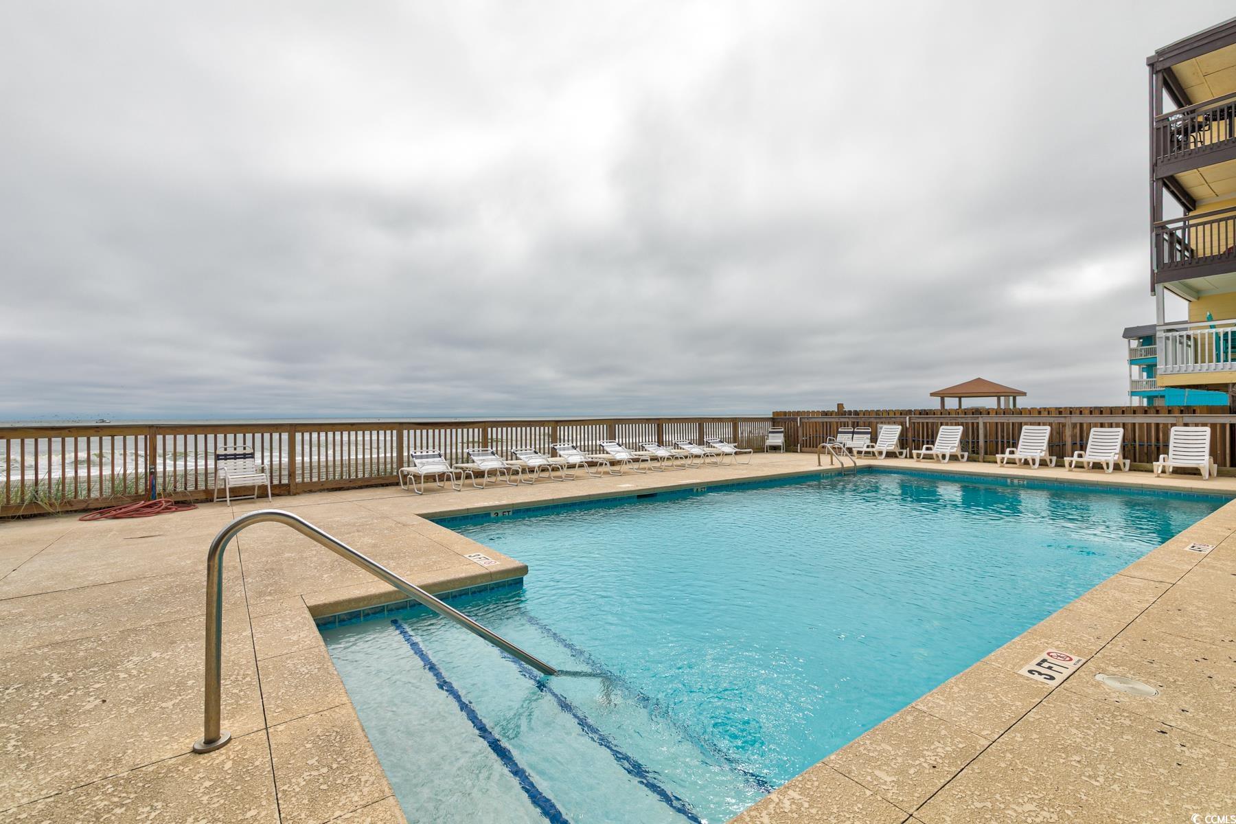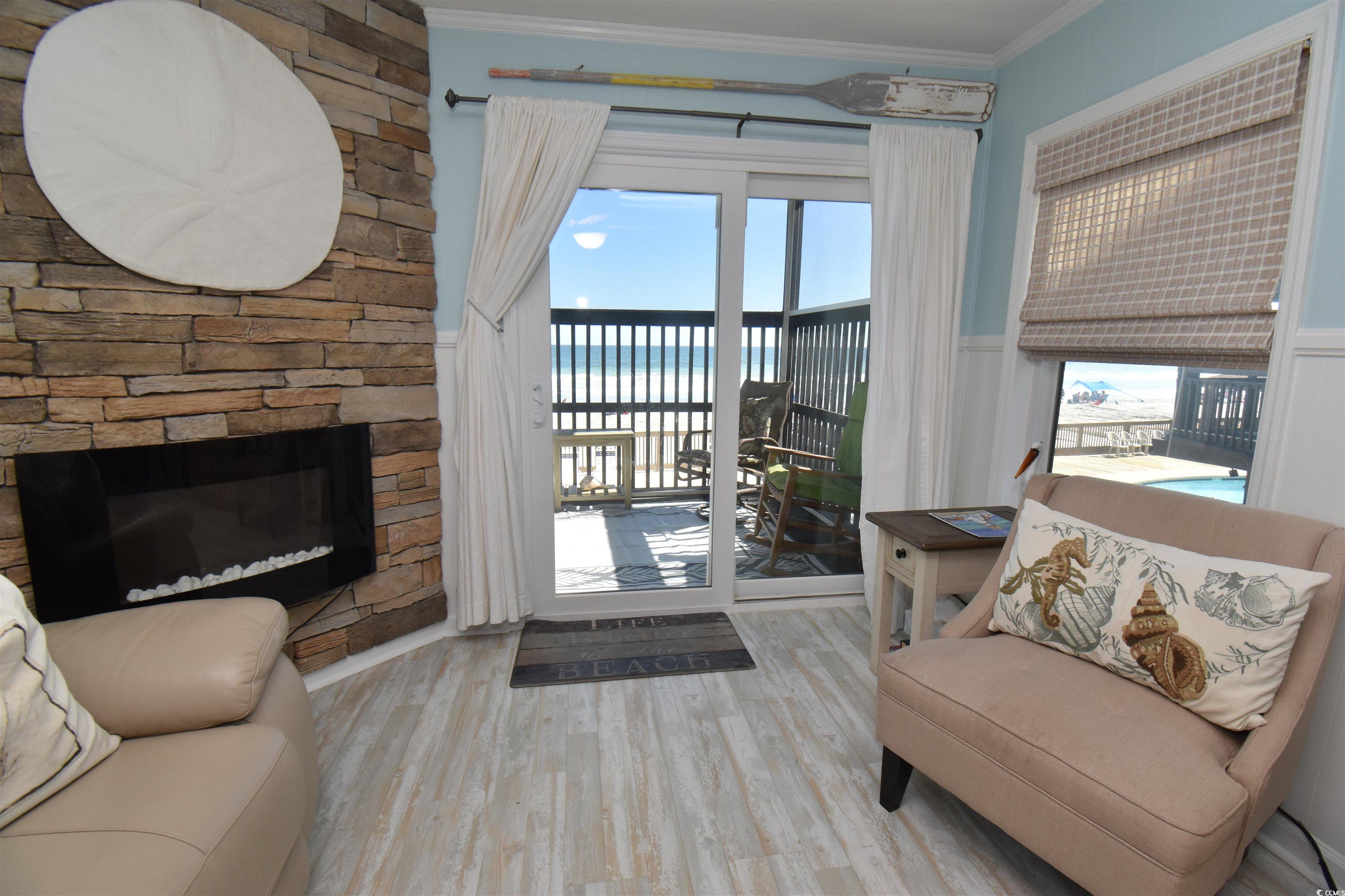 What a find! Sea Oaks is getting a facelift in 2026. Assessment for new roof, new exterior painting and updating will be paid in full by seller. Grab a rocking chair to relax on your oceanfront balcony while enjoying the sound of the waves and the endless view! The pool is your bonus view! Sea Oaks features an elevator, grilling area, picnic tables, gazebo and oceanfront deck area. This 2 bed/2 bath 1st floor end unit features a recently painted interior, well equipped kitchen including newer stainless appliances, granite counter tops, coffee maker, blender and more. The warm living room includes a corner fireplace, leather electric recliner sofa, 75"TV, breakfast bar and table for 4 and opens to the oceanfront balcony. Primary oceanfront bedroom has tempur-pedic, adjustable king bedroom suite and en-suite bath and second bedroom with queen bedroom suite (purchased in 2024). Newer TVs in both bedrooms. The electrical panel has been upgraded to accommodate the newer, stackable washer/dryer. This is a great primary, secondary and/or investment home. Conveniently located between the Garden City Pier and Surfside Pier, you are right in the heart of all that the beach has to offer. Great seafood restaurants are nearby or head to the Murrells Inlet Marshwalk, the "Seafood Capital of SC" for more dining options. Huntington Beach State Park and Brookgreen Gardens are just a few miles south. Plus it's and easy drive to the MB Airport, shopping and entertainment.