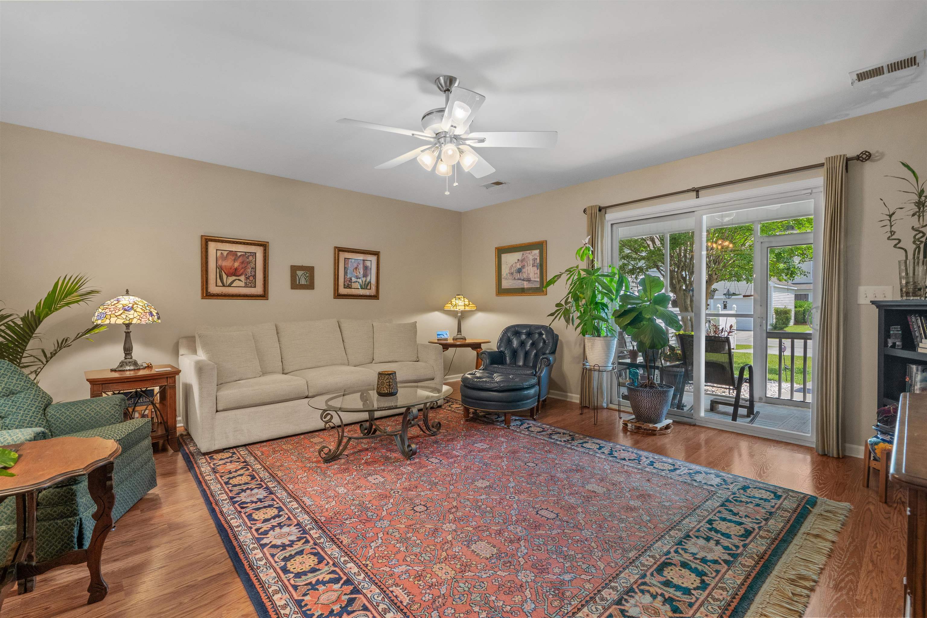 Welcome to your charming new townhome in The Orchards at Carolina Forest! This delightful two-story townhome features two spacious bedrooms and two and a half bathrooms. As you enter, you will discover a bright and airy formal dining room, where you can enjoy meals with a picturesque view of the green, lush landscaping that adorns the community. The dining area provides a serene atmosphere, allowing you to gaze onto the beautifully maintained greenery, complete with a sidewalk, perfect for a leisurely stroll. The thoughtfully designed first floor also includes the kitchen equipped with a range, dishwasher, refrigerator, built in microwave, pantry and bar stool seating area. A convenient half bathroom is also located downstairs. The large living area seats plenty, and a cheery screened in porch at the rear of the home is ideal for relaxing evenings or morning coffee. Attached to the porch, a handy storage room provides extra space for all your belongings. Upstairs, the well-appointed bedrooms each include their own full bathroom. The owner’s suite has vaulted ceilings, a ceiling fan and two closets. The primary bath includes a stand-up shower and garden tub. The laundry closet is conveniently located upstairs and separates the bedrooms. The guest bedroom also has a vaulted ceiling and includes a closet, ceiling fan, and a full bathroom with a tub/shower combo. Your new townhome also offers a private driveway for two cars, with additional parking in the front of the home, ensuring easy access for you and your guests. Conveniently located a short distance away from the community’s wonderful amenities, which include refreshing pools, fun playground, basketball courts, and a gym to keep you fit and active. The community also includes sidewalks throughout. If sandy beaches and ocean breezes are your style, you'll love being just a short 15-minute drive from the beautiful coastline. Enjoy the best of both worlds with peaceful suburban living and quick access to all the excitement and relaxation the beach has to offer. The neighborhood is conveniently located near grocery stores, medical facilities, schools, and area restaurants and shopping. Don't miss the chance to make this wonderful community your new home!
