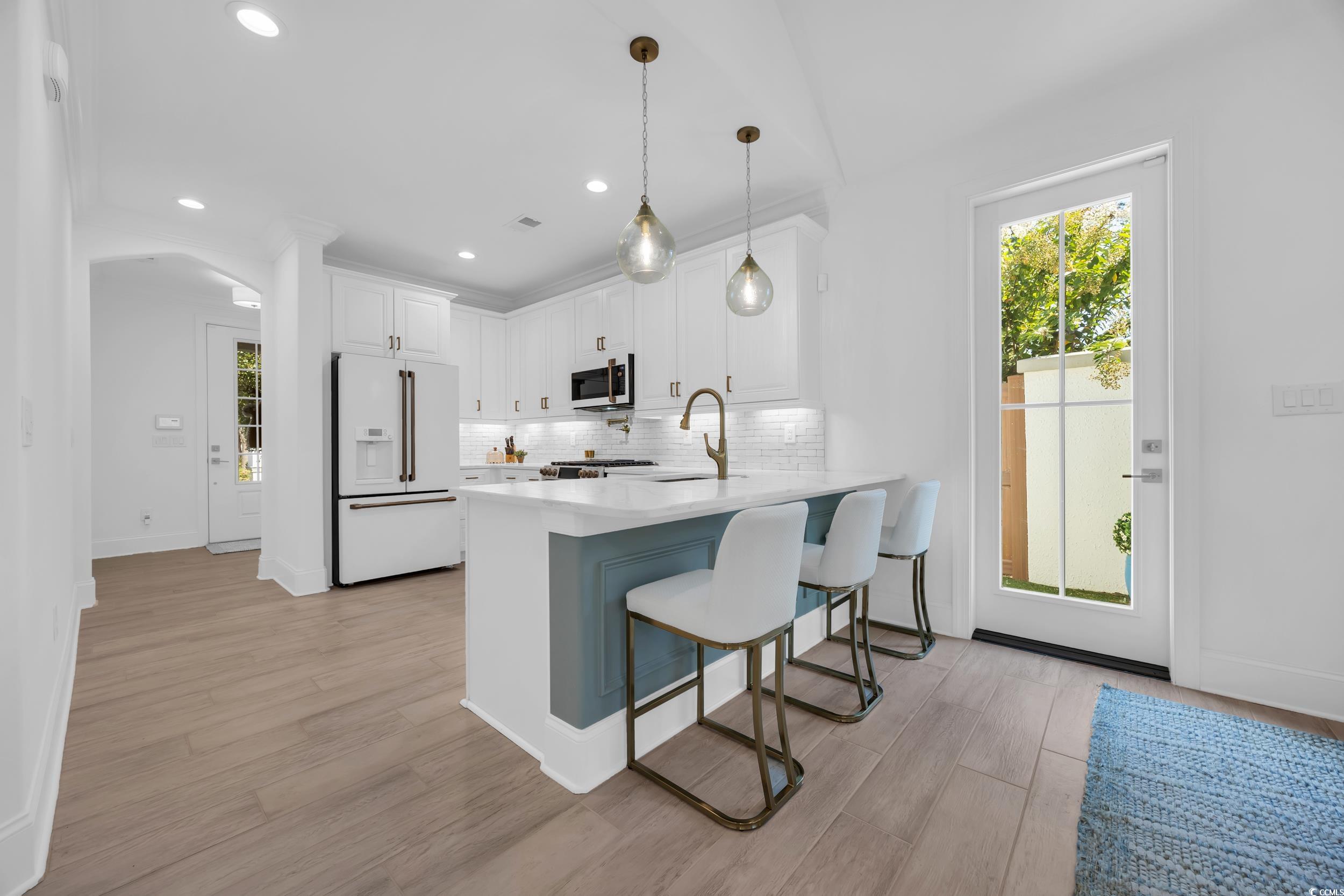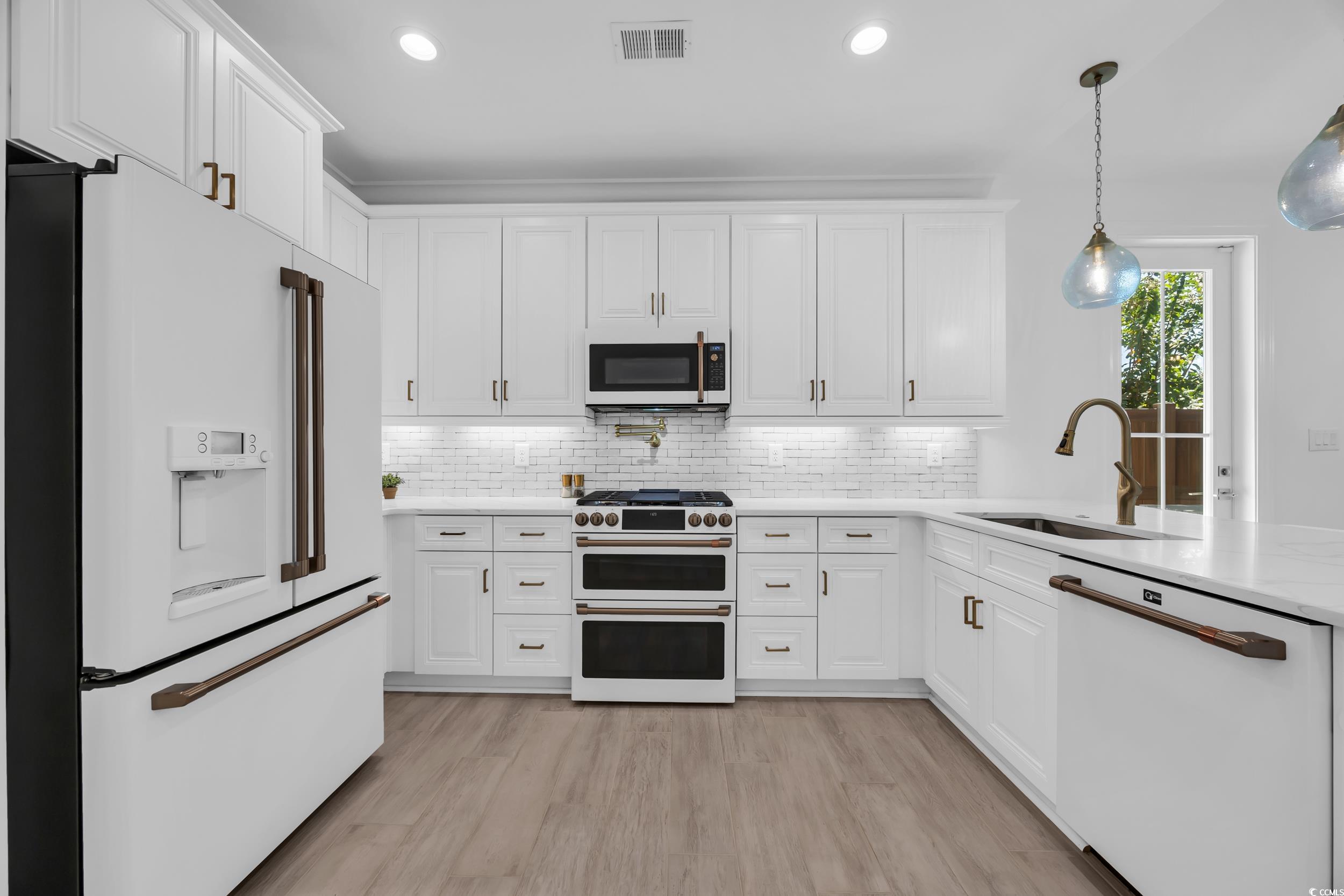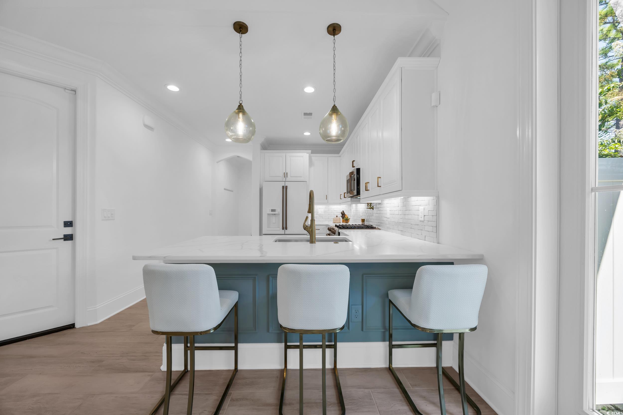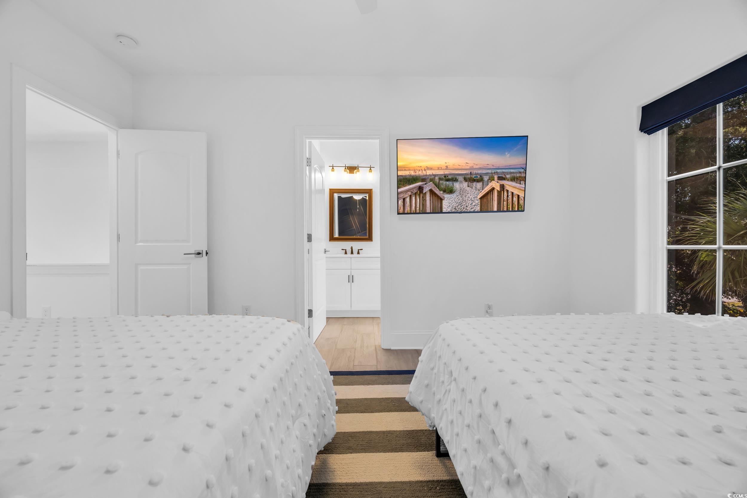 A rare opportunity awaits in 82 Dunes - This furnished home offers 3 spacious bedrooms, each with its own en suite bath, plus a loft and an additional half bath for convenience. Designed with both comfort and style in mind, the home showcases modern Dutch West Indies architecture and an open-concept layout with vaulted ceilings, abundant natural light, and a fireplace as the centerpiece. The kitchen is a true showpiece with quartz countertops, a large island, dual ovens, white stainless steel Café GE appliances, and soft-close cabinetry. A wet bar, recessed lighting, and porcelain wood-look tile flooring add to the upscale appeal. The primary suite is a private retreat featuring a spa-like bath with double vanities, soaking tub, walk-in shower, and custom melamine closet. Upstairs, the oversized loft provides flexibility for a media room, home office, or secondary living space, alongside two additional bedrooms with private baths. Step outside to a beautifully landscaped backyard with turf grass, a screened porch, paver patio, and an outdoor kitchen complete with gas grill—perfect for year-round entertaining. Additional upgrades include dual laundry, tankless water heater, rolled edge walls, and a large two-car garage. 82 Dunes is ideally located just a short walk or golf cart ride from the beach, golf, the marina, dining, shopping, and medical facilities. This home combines refined living with an unbeatable location—your personal coastal oasis at the heart of the Grand Strand.