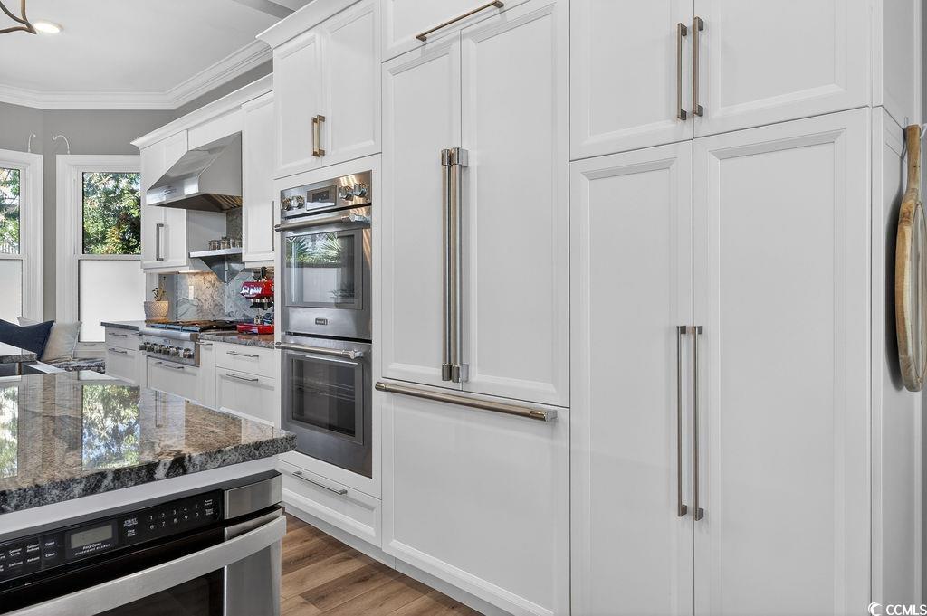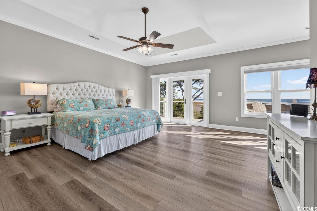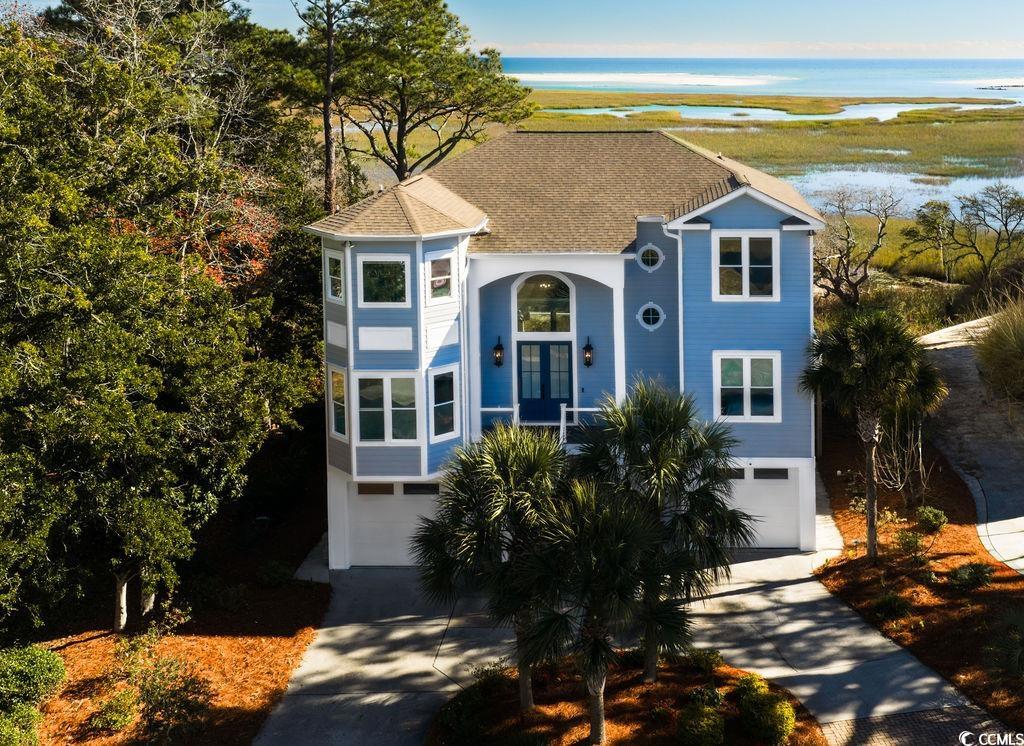 Beautifully updated, this gorgeous raised beach home in the coveted Sweet Grass community showcases sweeping views of the marsh, tidal creek, and Atlantic Ocean, all just moments from boutique shopping, renowned dining, and the unspoiled natural beauty of South Carolina’s Lowcountry coast. Expansive decking on multiple levels, along with a welcoming screened porch, create abundant outdoor living space ideal for relaxing or entertaining, while enjoying gentle sea breezes and panoramic vistas. Inside, the gourmet kitchen is a true chef's dream, featuring Thermador stainless steel double wall ovens, gas cooktop with hood, dishwasher, a custom-paneled French-door refrigerator, wine refrigerator, bay window with built-in bench seating, and an elegant glass-front butler’s pantry area that offers beautiful and convenient storage. The open-concept main level, accented by oversized windows that capture the remarkable views, accommodates a generous dining area, casual family seating and a lovely living area anchored by a gas fireplace. A guest bedroom and full bath on this floor provide convenient accommodations. Upstairs, the luxurious primary suite serves as a private retreat with large windows and access to the upper deck, perfect for savoring breathtaking sunrises. Complete with a spacious sitting area and dual walk-in closets flanking the entrance to a spa-inspired bath boasting a freestanding soaking tub, sleek modern vanities, and a custom-tiled walk-in shower. Two additional bedrooms share this level, including one with it's own access to the upper deck, as well as another beautifully updated full bath. On the ground level, an expansive garage offers parking for at least four vehicles and includes an insulated storage and workshop room. This area opens to both covered and open-air patios, along with a convenient outdoor shower—ideal after a day on the water or at the beach. This home seamlessly blends refined coastal design, modern comforts, and unparalleled views, embodying the very best of Pawleys Island living.