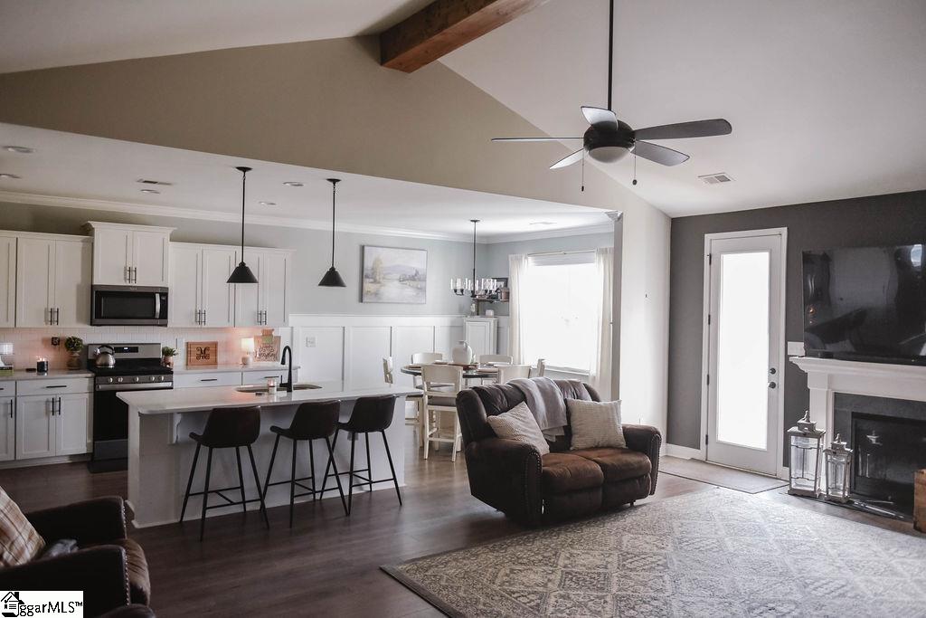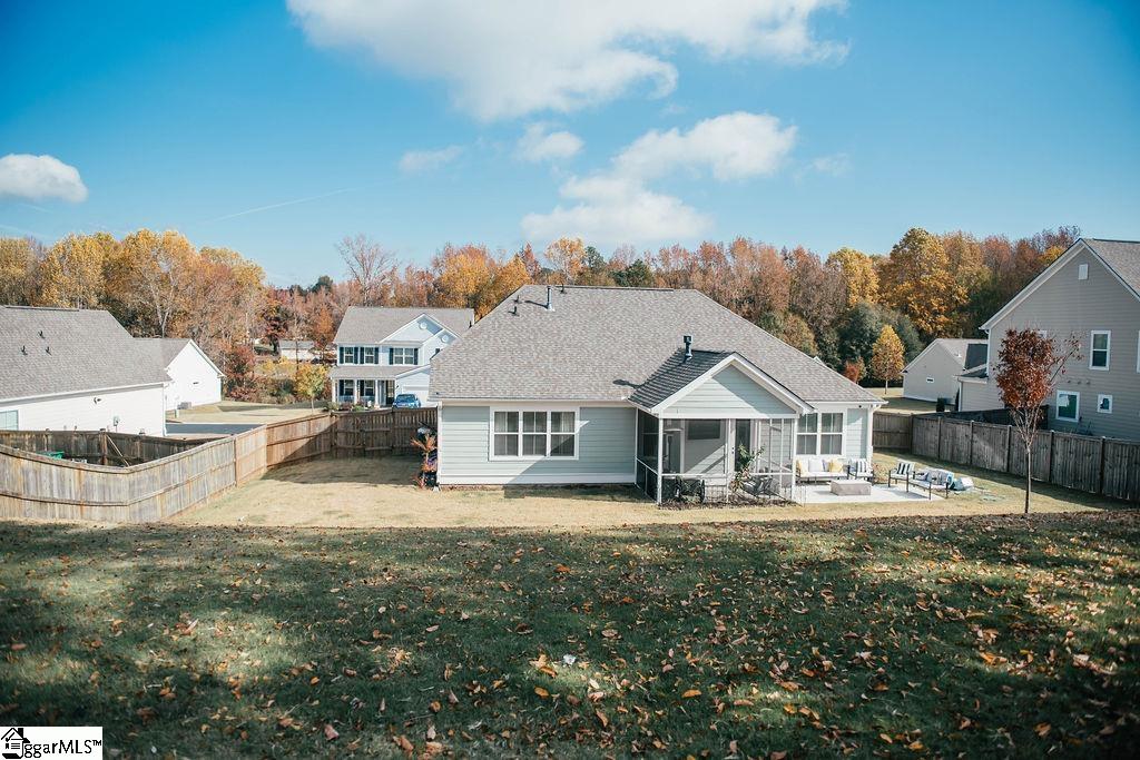 Gorgeous and spacious craftsman home is 3 years new. Owner has added wooden beams in great room, board and batten walls throughout and shiplap in bathroom. Trey ceiling in master has stunning wood insert. Great room has wood wall leading to kitchen. Farm sink and gas stove with griddle makes cooking a breeze. Clean and bright quartz countertops lighten the mood for cooking and breakfast bar. Dining room adjoins kitchen and overlooks patio and enormous back yard. Wood floors gleam and all rooms have custom ceiling fans. Master has two spacious closets and master bath has beautiful shower. Master ceiling also has customer bead board inset. Guest rooms have custom finishes and unbelievable closet space. Upstairs bedroom has private bath and a closet that spans to outside wall inside. Just walk in and look right! Screen porch has TV wiring. Patio outside screen porch is perfect for outdoor living. Yard has three levels with a football field lined at top level. Yard is completely sodded from curb to football field. Doll house custom built playhouse on second level is adorable. Huge oak tree might be perfect for a fort? LARGE FAMILIES WILL THRIVE HERE. Four bedrooms and three full baths give breathing room for all the family. Upstairs bedroom will be perfect retreat for adolescents or visiting family. Lots of house and yard for the money.