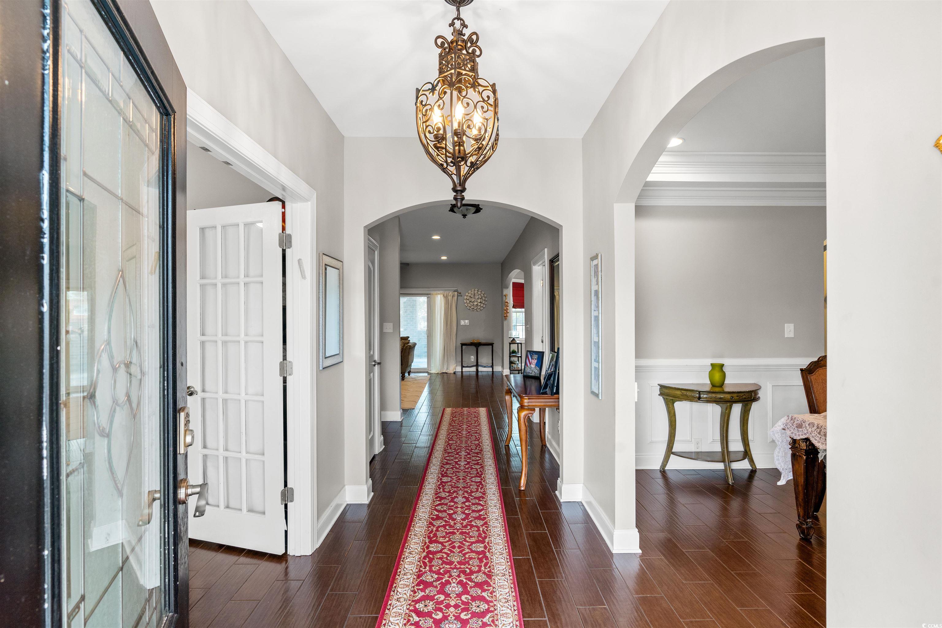 Welcome to 8491 Juxa Drive is an exceptional all brick luxury residence located in the highly desirable Plantation Lakes community of Myrtle Beach, South Carolina. This expansive custom home offers 5 extra large bedrooms, 3 full bathrooms, 1 powder room and an office/Den, providing generous space and flexibility for family living, guests, or multi generational needs. Designed with an open concept layout and high ceilings, the home features a custom kitchen with stainless steel appliances, Granite countertops, and beautiful flooring throughout. The oversized two car garage and spacious driveway offer ample parking and storage. Indoor living flows seamlessly to the outdoors, where a huge rear screened porch and patio creates the perfect setting for entertaining or relaxing. The exterior of the property has been thoughtfully upgraded with new professional landscaping, palm trees, magnolia trees, and fruit trees, creating a private and elegant setting. The backyard is a true resort style retreat, highlighted by a private in ground concrete saltwater swimming pool installed in 2023. The full size pool measures approximately 16 by 32 and is complemented by a surrounding deck ideal for outdoor living. As part of the pool installation, a brand new irrigation system was added along with premium Zoysia grass, widely regarded as one of the most attractive and durable grasses available. An underground drainage system was also installed in the back yard, providing long term functionality and peace of mind. The home offers direct access to the lakes right from your back yard. Enjoy a relaxing paddle boat ride through the lakes and canals, surrounded by stunning preserve scenery. Plantation Lakes is known for its upscale lifestyle and outstanding community amenities, including a resort style swimming pool, clubhouse, fitness center, tennis courts, pickleball, playgrounds, walking trails, and beautifully maintained lakes and common areas throughout the neighborhood. The location offers excellent convenience, with close proximity to major grocery stores, shopping centers, restaurants, medical facilities, and everyday services. Easy access to Highway 501, Carolina Forest Boulevard, and International Drive and Hwy 31 provides quick connections to Myrtle Beach, Conway, and the Grand Strand beaches. The home is located within the highly regarded Blue Ribbon Carolina Forest school district, known for strong academic performance and sought after schools. This impressive Plantation Lakes residence combines luxury construction, modern upgrades, exceptional outdoor living, and a prime location, making it a standout opportunity in one of Myrtle Beach’s most desirable communities.