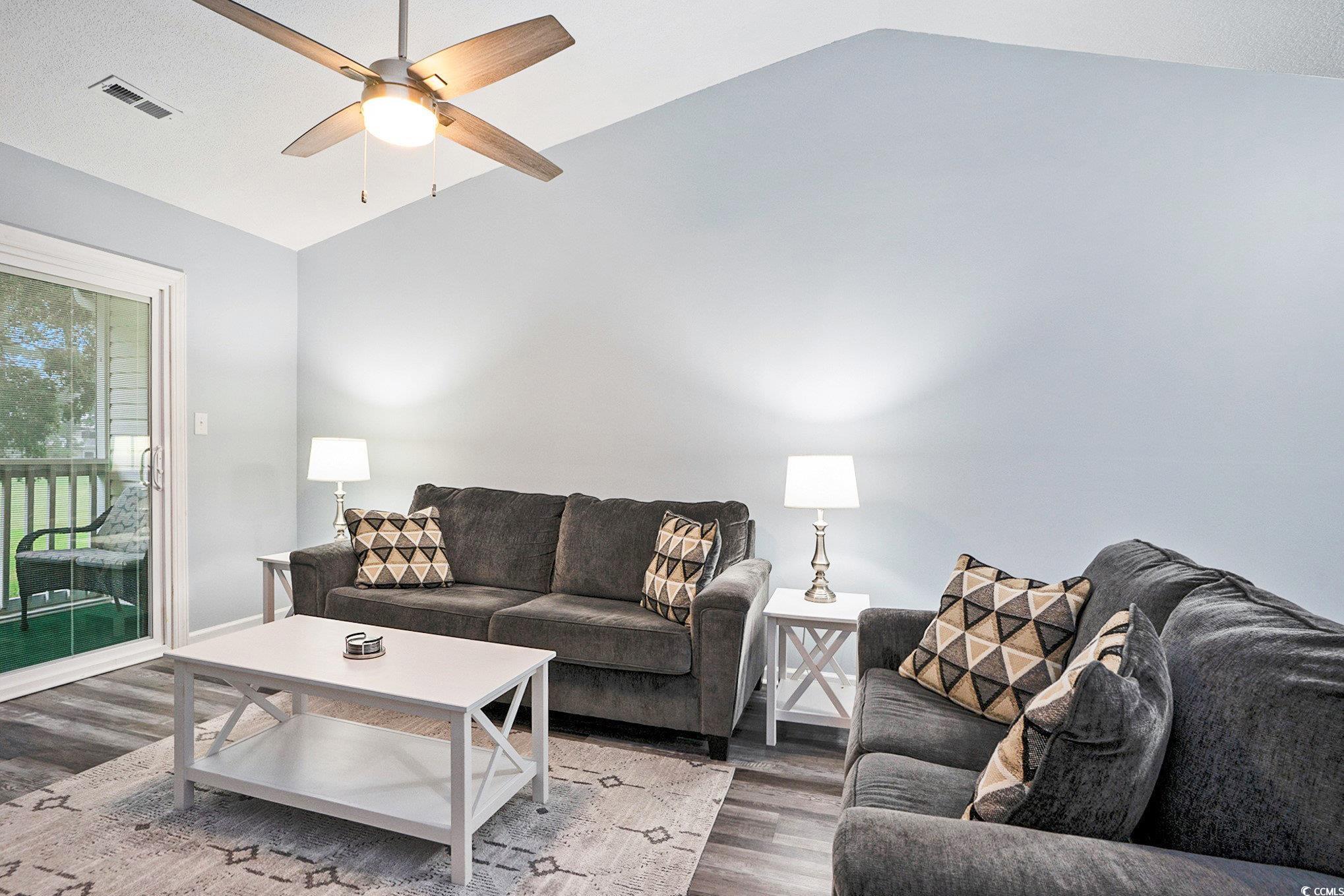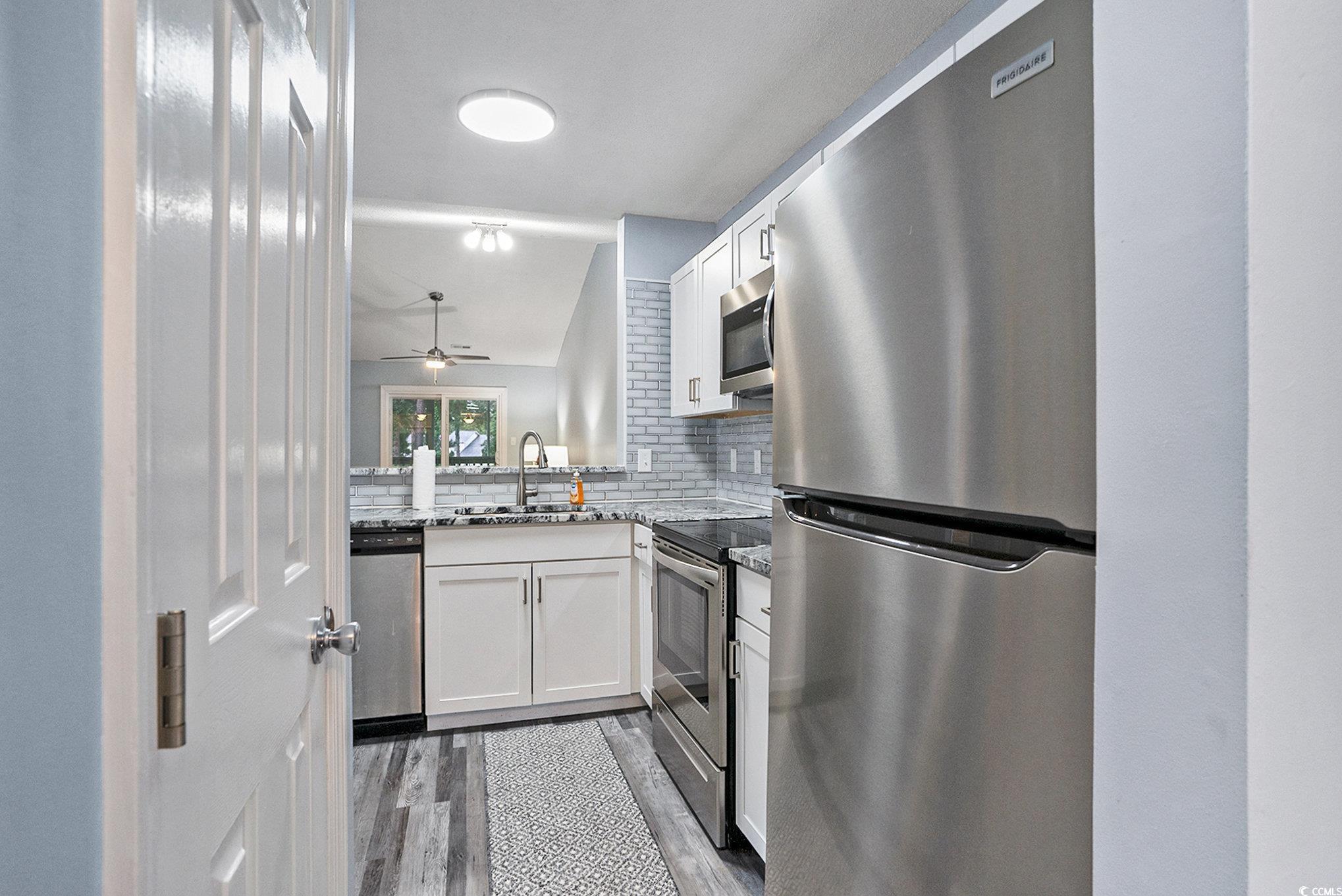 This beautifully updated 2 bedroom and 2 bath, second-floor condo features LVP flooring throughout, granite countertops, tiled backsplash, solid wood cabinets, and all-new stainless steel appliances. Two new sliding glass doors with built-in blinds open to a screened porch from the master and great room. Freshly painted throughout with new brushed nickel hardware, updated electrical, and new indoor/outdoor carpet at entry and porch. The laundry room includes a washer, dryer, and custom shelving. The master suite offers a walk-in shower, double vanity, comfort-height toilet, spacious walk-in closet with custom shelving, and a large linen closet. Perfect as a primary home, vacation getaway, or investment. Colonial Creek is a well-maintained community with easy access to beaches, shopping, dining, and healthcare along the Grand Strand.