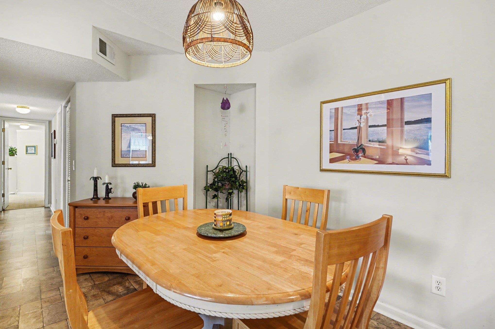This second-floor condominium offers three bedrooms and two bathrooms. The galley-style kitchen provides ample cabinet and counter space, a breakfast bar, and an adjacent dining area. The spacious primary bedroom includes a walk-in closet and an ensuite bathroom with a tub and shower combination. The home features a large living area and a Carolina room filled with natural light. Residents enjoy amenities such as a swimming pool, walking trails, and beautifully maintained grounds. The community is located near beaches, shopping, dining, and entertainment options of the Grand Strand. This property an excellent option for a primary residence, vacation retreat, or investment property.