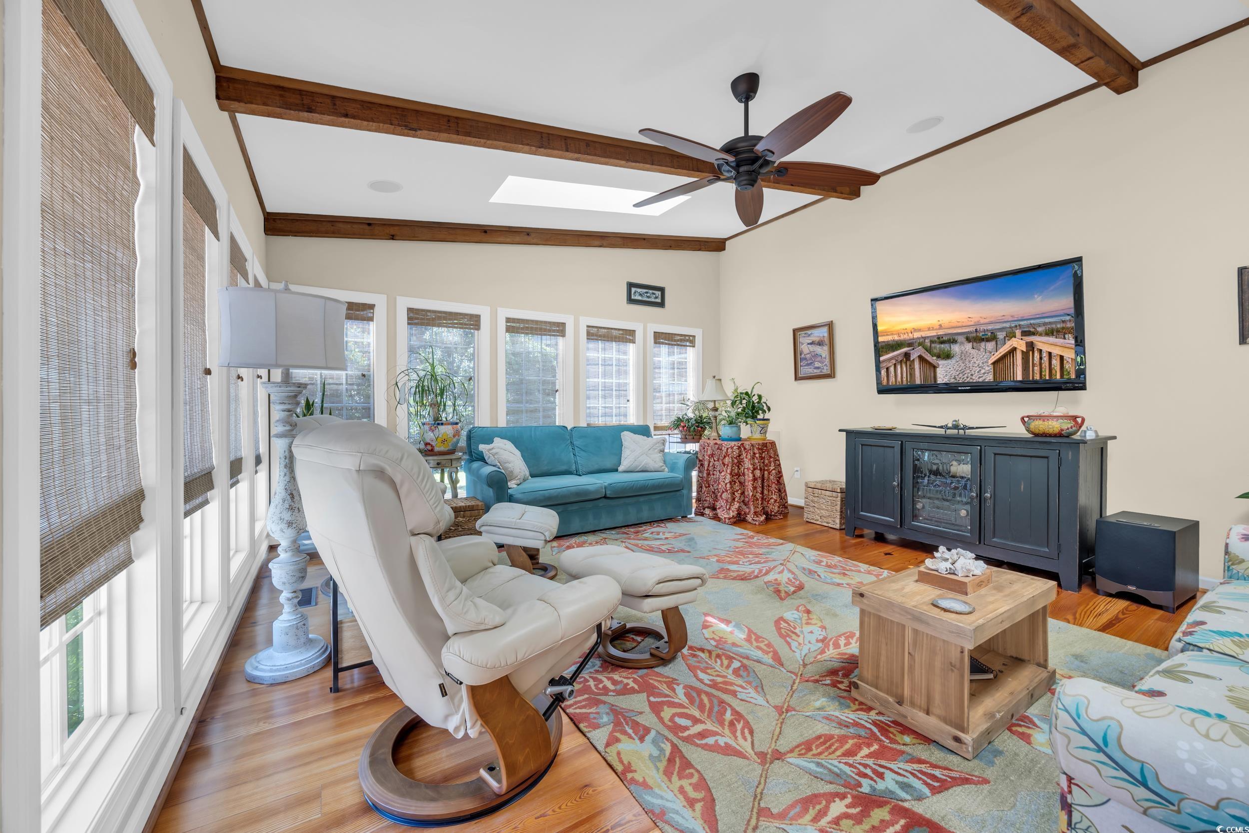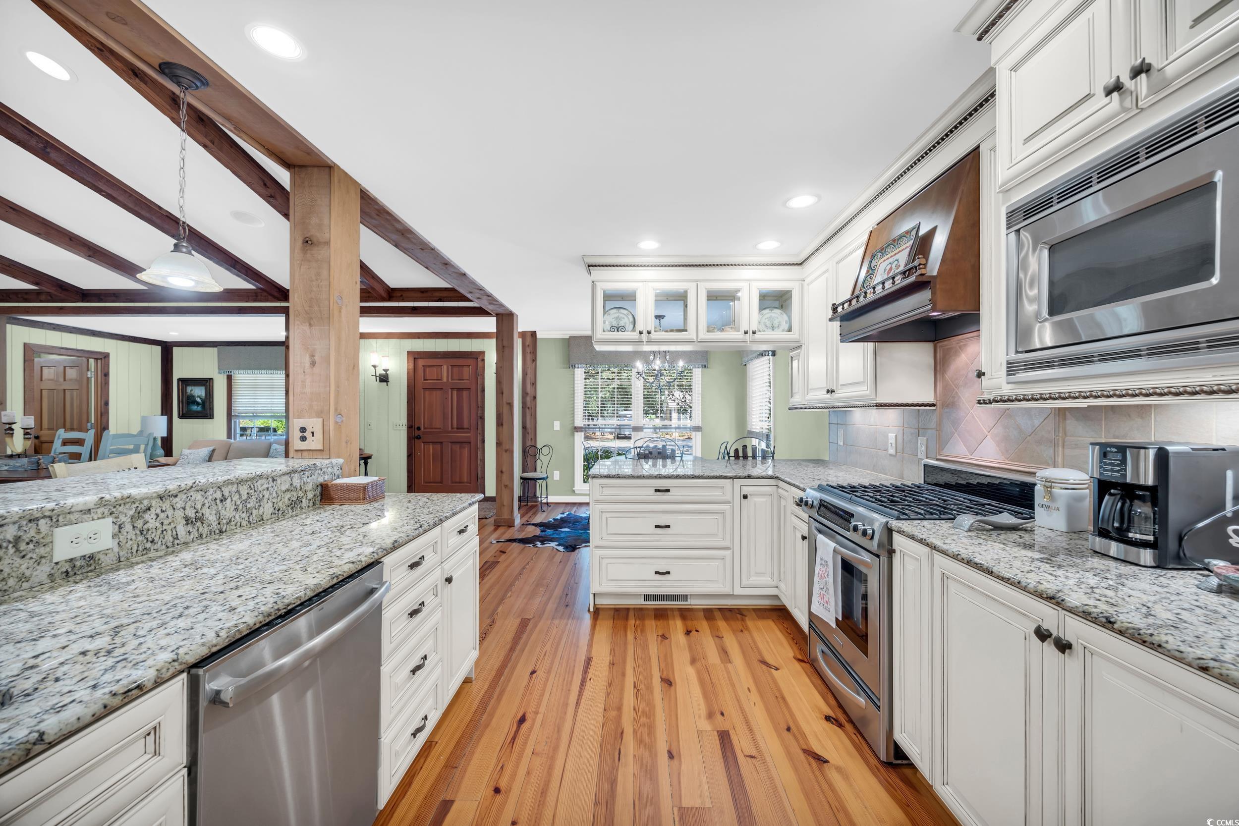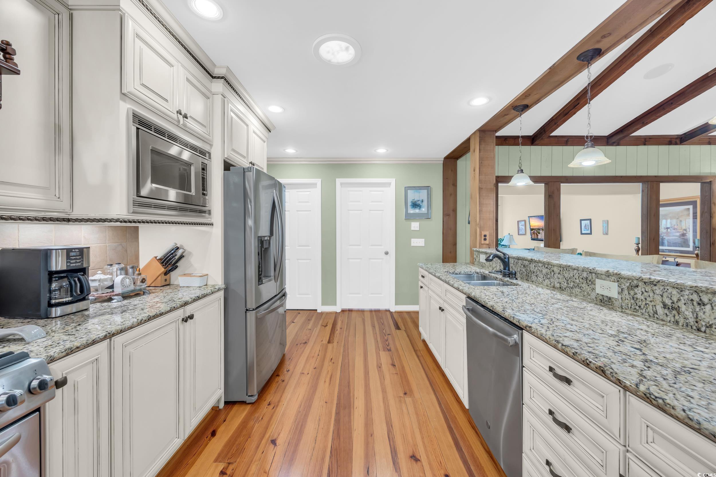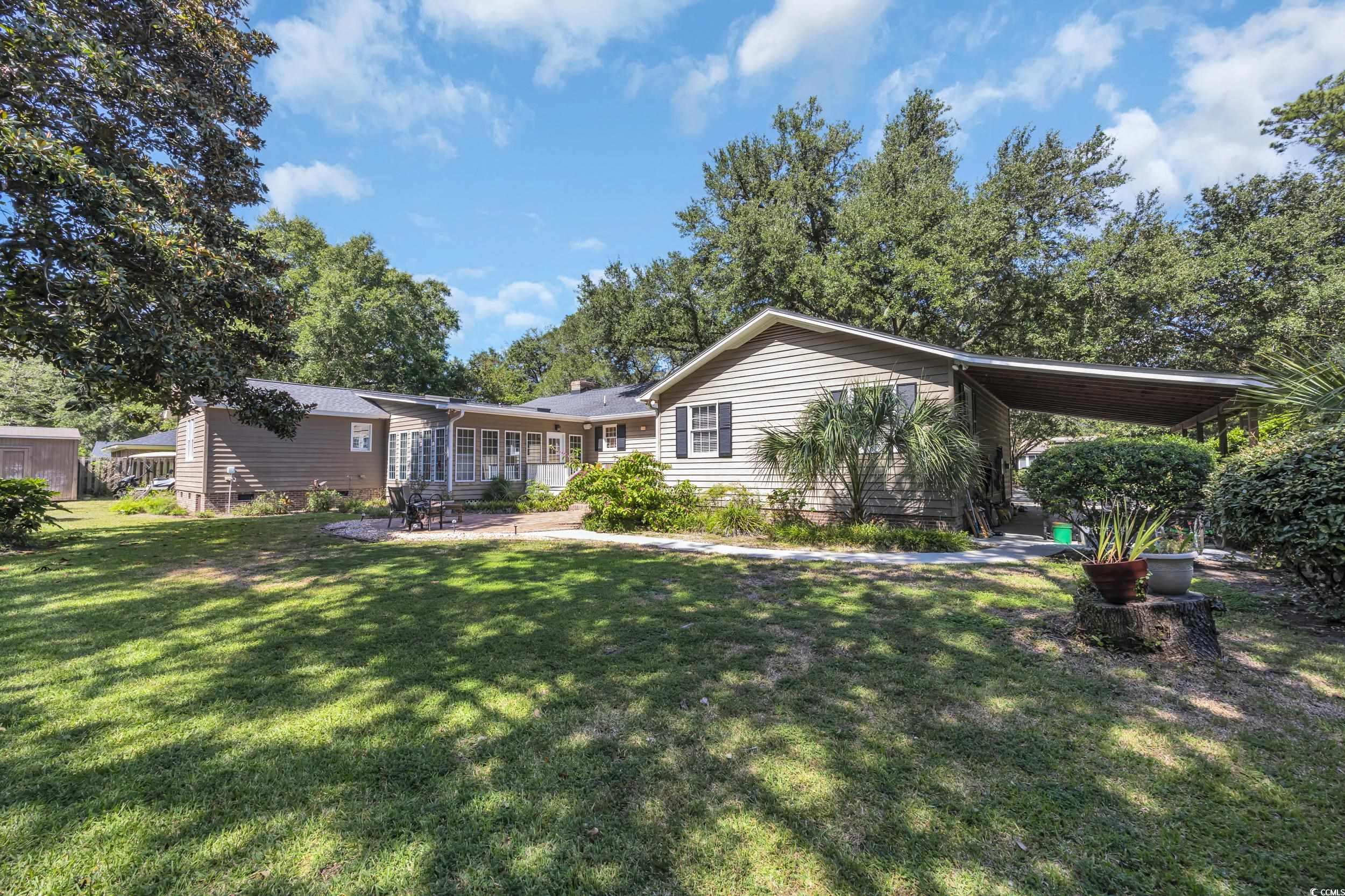Welcome to your coastal retreat in Murrells Inlet! This charming 4-bedroom, 3.5-bath home offers a unique blend of Southern charm and modern convenience, all without the restrictions of an HOA. Step inside and be captivated by the warmth of the original heart pine flooring that flows throughout the entire home. The open and airy floor plan is perfect for first-floor living, featuring a cozy living room with a fireplace, ideal for relaxing evenings. The kitchen is a chef's delight, boasting stainless steel appliances and ample counter space. A truly unique feature of this home is the converted garage, which has been transformed into a second master bedroom, providing a private and spacious sanctuary. The home also includes a Carolina room, a perfect space for enjoying your morning coffee or unwinding with a good book while overlooking the serene backyard. Outside, you'll find an inviting brick patio, perfect for entertaining or enjoying the beautiful Murrells Inlet weather. The outdoor shower is a thoughtful addition, making it easy to rinse off after a day at the beach. Speaking of which, this home is just a short golf cart ride away from the beach and the famous Murrells Inlet Marshwalk, offering a variety of dining, shopping, and entertainment options. Additional features include a new roof installed in 2023, ensuring peace of mind for years to come. Located in the highly sought-after Horry County School District, this home provides the perfect setting for families. Don't miss this opportunity to own a piece of paradise in Murrells Inlet!
