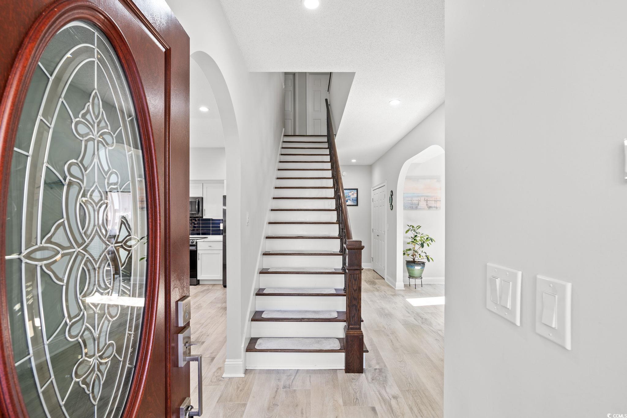 Discover this beautifully renovated 4-bedroom, 3.5-bath home in the sought-after Windy Hill Woods community of North Myrtle Beach, just a short walk to the sandy shoreline. Featuring hardwood, porcelain tile, and LVP flooring throughout, the home offers elegant arched entryways, a formal dining room, a guest powder room, and a bright, spacious living area. The updated kitchen boasts black stainless steel appliances, quartz countertops, a farmhouse sink, breakfast bar, pantry, and plenty of cabinet space. The first-floor primary suite includes a gas fireplace, custom built-ins, ceiling fan, walk-in closet, and a luxurious en-suite with dual vanities, a large step-in shower, linen closet, and private water closet. Upstairs, you'll find a second primary suite with a private bath, plus two additional bedrooms sharing a full guest bath. A cozy Carolina room with heated floors and a fireplace adds year-round comfort. Additional highlights include a laundry closet with gas/electric washer and dryer, new roof (2023), new windows, outdoor shower, paver patio, storage shed, and a 2-car garage with epoxy flooring. Enjoy easy access to the beach, golf, restaurants, entertainment, shopping, and everyday essentials. Take advantage of this top of the line updated home! Schedule your showing now!