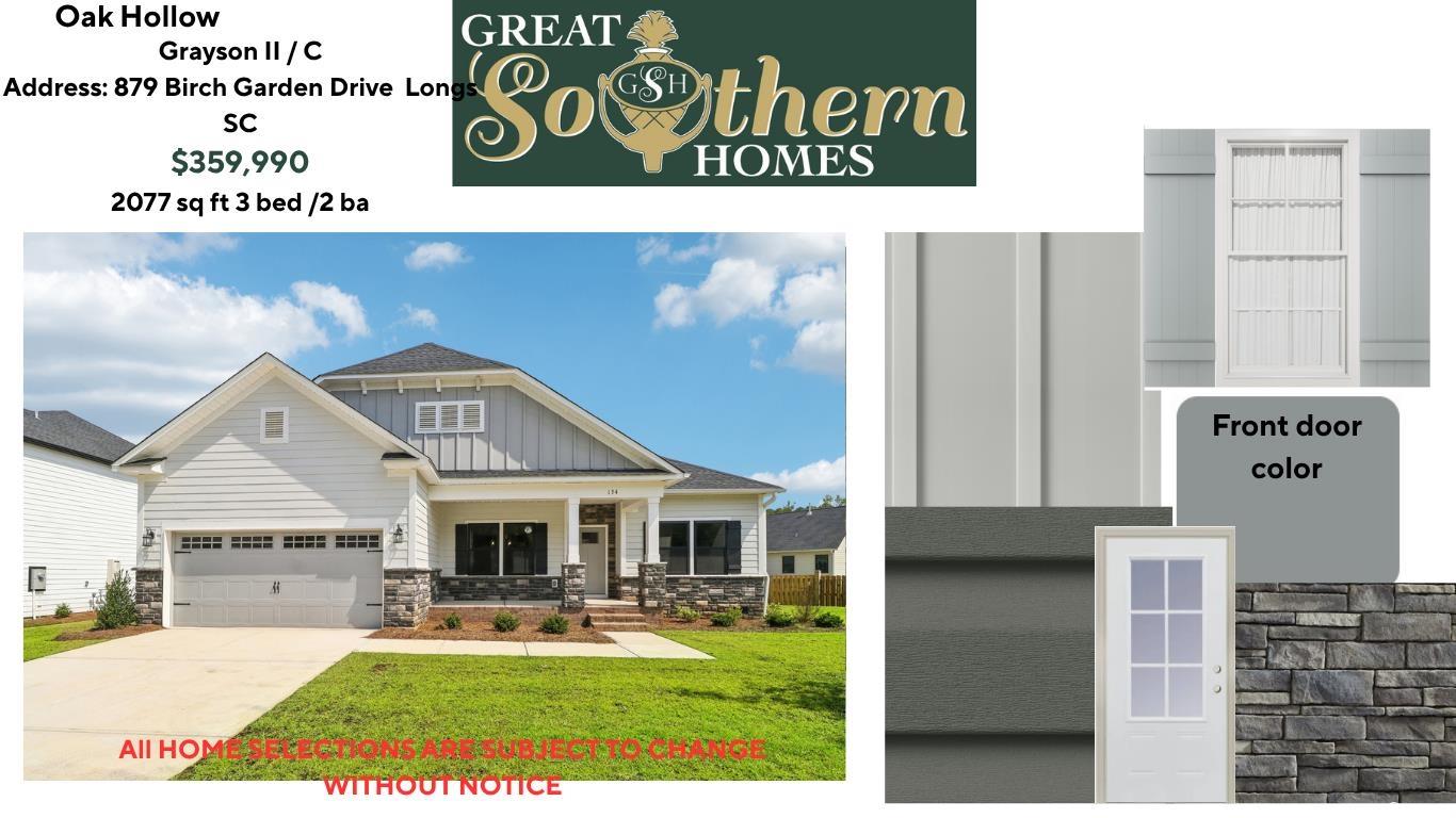 [] Welcome to Oak Hollow, a natural gas community 20 mins. to N. Mytle Beach. The GRAYSON II is the NEWEST Great Southern Homes Craftman designed floorplan. A large 2077 1 story home featuring, Large Dining Room, Foyer, Mudroom and Laundry off the garage hall. Open Large Great room with a Tray Ceiling flows into the Kitchen with large central island. Primary Bedroom boasts Tray Ceilings and a Walk in closet, the Primary bath has double sinks, Garden Tub and full Tiled Shower walls and tile shower floor. In the rear of the home a French door leads out to the Covered patio. Fully sodded yard and irrigated lawns, tankless water heater are just a few of the lux features added to this home. Square footage is approximate and not guaranteed. Buyers/Buyers agent is responsible for verification. Some Photos are for illustrative purposes only and may be of a similar home built elsewhere.