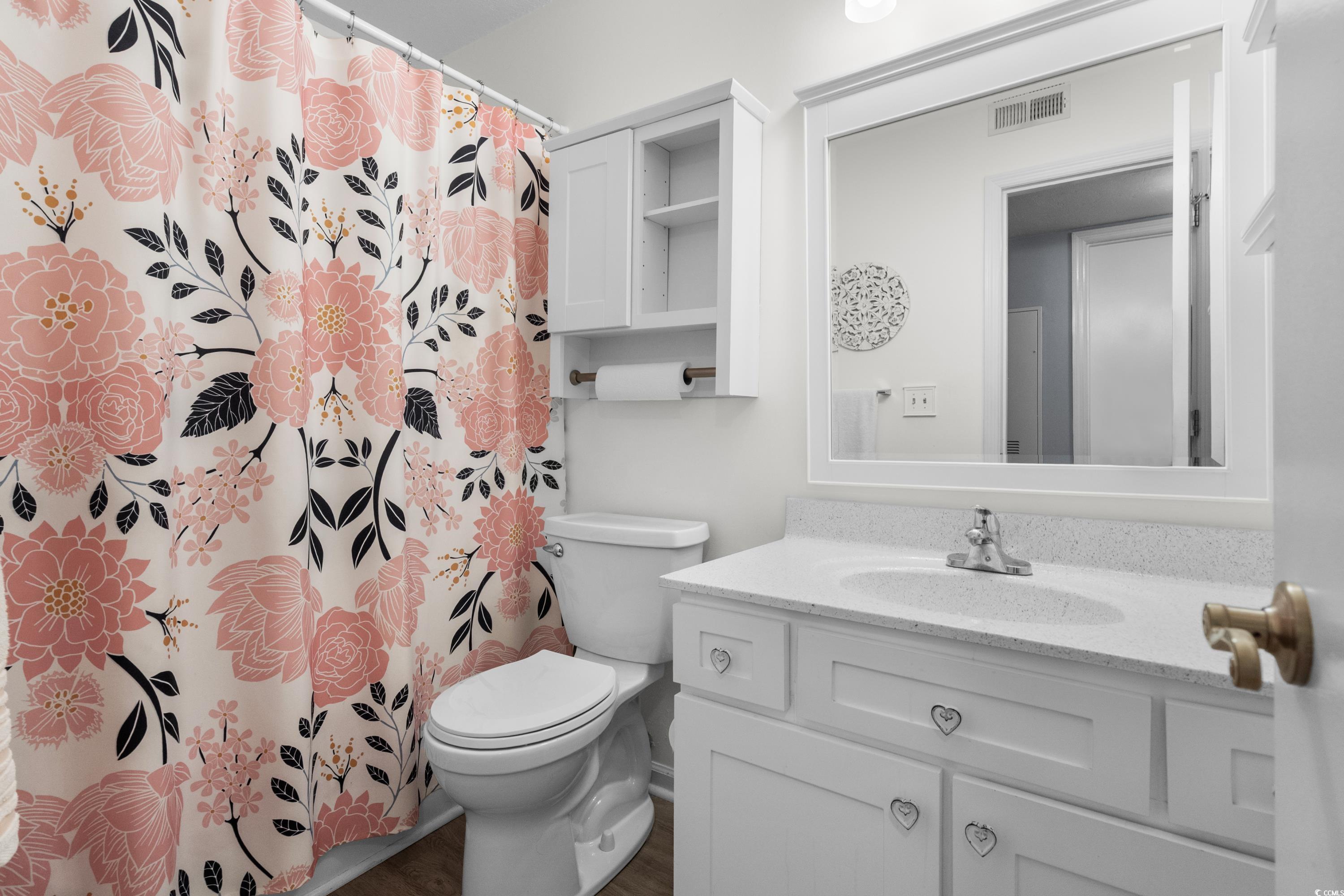 Welcome to this fully upgraded 3 bedroom, 2 bath condo only 4 minutes to Surfside Beach! This move-in ready home features brand-new luxury vinyl plank flooring throughout, freshly smoothed ceilings (no popcorn here!) and updated lighting throughout the home. The sizable kitchen includes Corian countertops and sink, recessed lighting, pull out drawers in the pantry, a water filtration system and a new stainless steel refrigerator! Both the secondary bedrooms are sizable with upgraded ceiling fans. The secondary bathroom has been refreshed with new cabinetry, a refinished tub, and a refaced vanity. In the spacious primary suite, enjoy two closets-including one walk-in-and a fully updated bathroom with upgraded cabinetry, linen storage and a newly installed cultured marble walk-in shower. Step outside to relax on your screened-in composite porch with tile floors, ceiling fan, and private storage closet. Peace of mind comes easy with a newer HVAC system and water heater (both less than 3 years old), plus a lifetime window warranty. The building is situated on a tranquil lake and just a short stroll to the community pool. This condo offers low-maintenance coastal living at its finest. Don't miss your chance to make it yours!