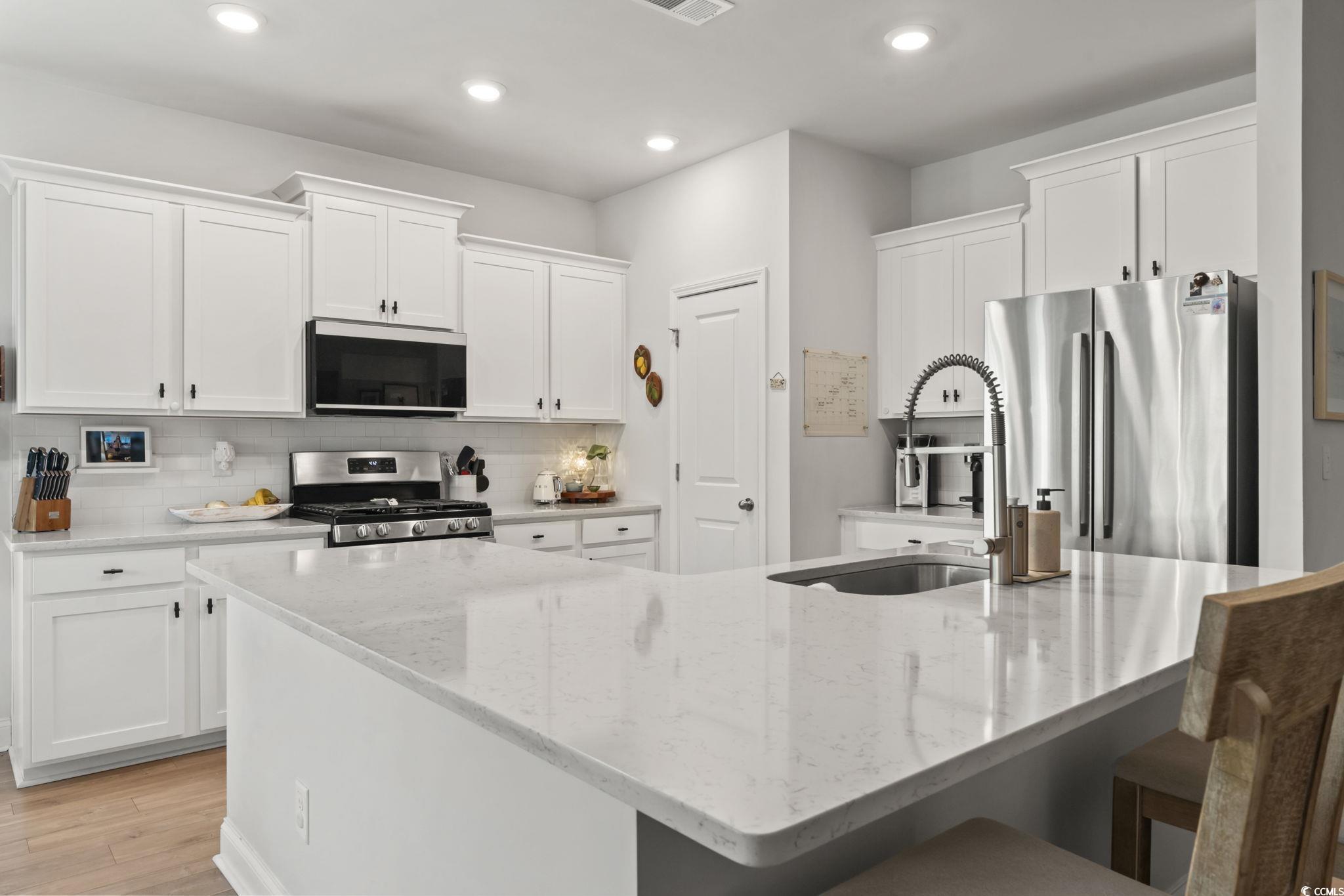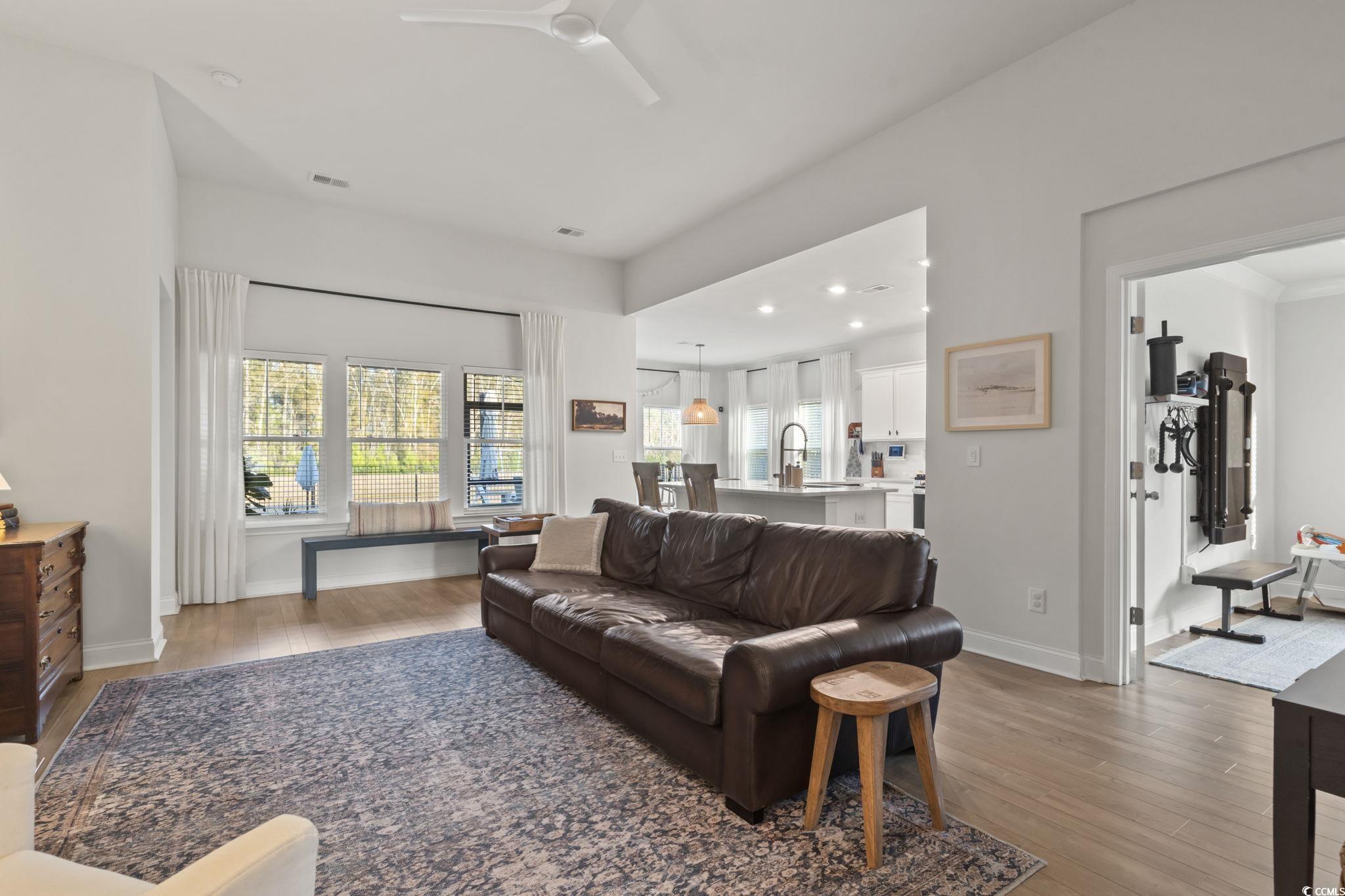 PRIME LOT IN BELLE HARBOR - MARKET COMMON!! Discover a rare opportunity in Belle Harbor—one of the few homes offering true privacy on a prime lot in the heart of Market Common. This beautifully upgraded home blends comfort, style, and seclusion in a way that’s nearly impossible to find in this community. Inside, the open-concept layout is filled with natural light and enhanced with thoughtful upgrades throughout: quartz countertops, custom pantry and closet shelving, new stainless appliances, French doors on the flex room, tiled master shower, and a cozy fireplace. Every detail, from fans in all rooms to plantation shutters and blinds, adds to the home’s warmth and livability. Step outside and you’ll immediately feel the difference this lot offers. Enjoy peaceful mornings and private evenings on your screened-in porch, or entertain around the patio and natural-gas firepit. The fenced yard, professional landscaping, irrigation, widened paver driveway, and exterior lighting create a polished, inviting outdoor space that feels like your own retreat. This WiFi Smart Home also includes garage ceiling storage, attic pull-down access, and a gas line for grill hookup. Belle Harbor residents enjoy resort-style amenities and a short golf cart ride to Market Common dining, shopping, parks, and the beach. Homes with this level of privacy rarely hit the market - and never last long. This is your chance to own one of Belle Harbor’s most desirable lots.