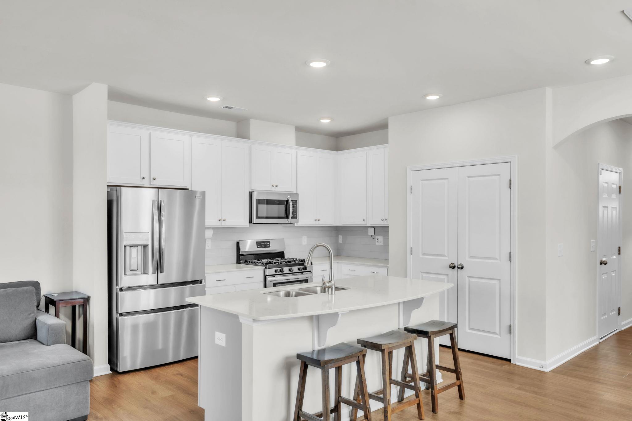 Welcome home to this meticulously maintained 3-bedroom, 2.5-bath end-unit townhome, pet-free and smoke-free, in the highly sought-after Travelers Rest community. From the moment you step inside, you’ll love the light-filled, open feel and thoughtfully designed layout. The spacious open-concept kitchen is the heart of the home, featuring beautiful quartz countertops, a stylish tile backsplash, abundant cabinetry, and an oversized pantry. The large island offers additional storage and seating, perfect for entertaining or casual meals. The inviting living room centers around a cozy ventless gas fireplace, creating the perfect space to relax and unwind. Step through the rear door with built-in blinds between the glass for added privacy and easy maintenance onto your private patio. Where peaceful tree-lined views and open common space provide a serene backdrop. Upstairs, the spacious primary suite is a true retreat, complete with elegant tray ceilings, room for a sitting area or desk, a large walk-in closet, dual vanities, and a beautifully tiled shower. Two additional bedrooms and a well-appointed shared bath complete the upper level. This home is packed with smart features, including an HVAC smart system integrated with Ring (doorbell included), MyQ-controlled garage doors, AT&T Fiber installation, and a Flo by Moen water monitoring system for added peace of mind. Best of all, this home has never been rented. Located in thriving Travelers Rest, you’ll enjoy a charming downtown filled with local dining, shopping, and entertainment plus easy access to the popular Swamp Rabbit Trail.