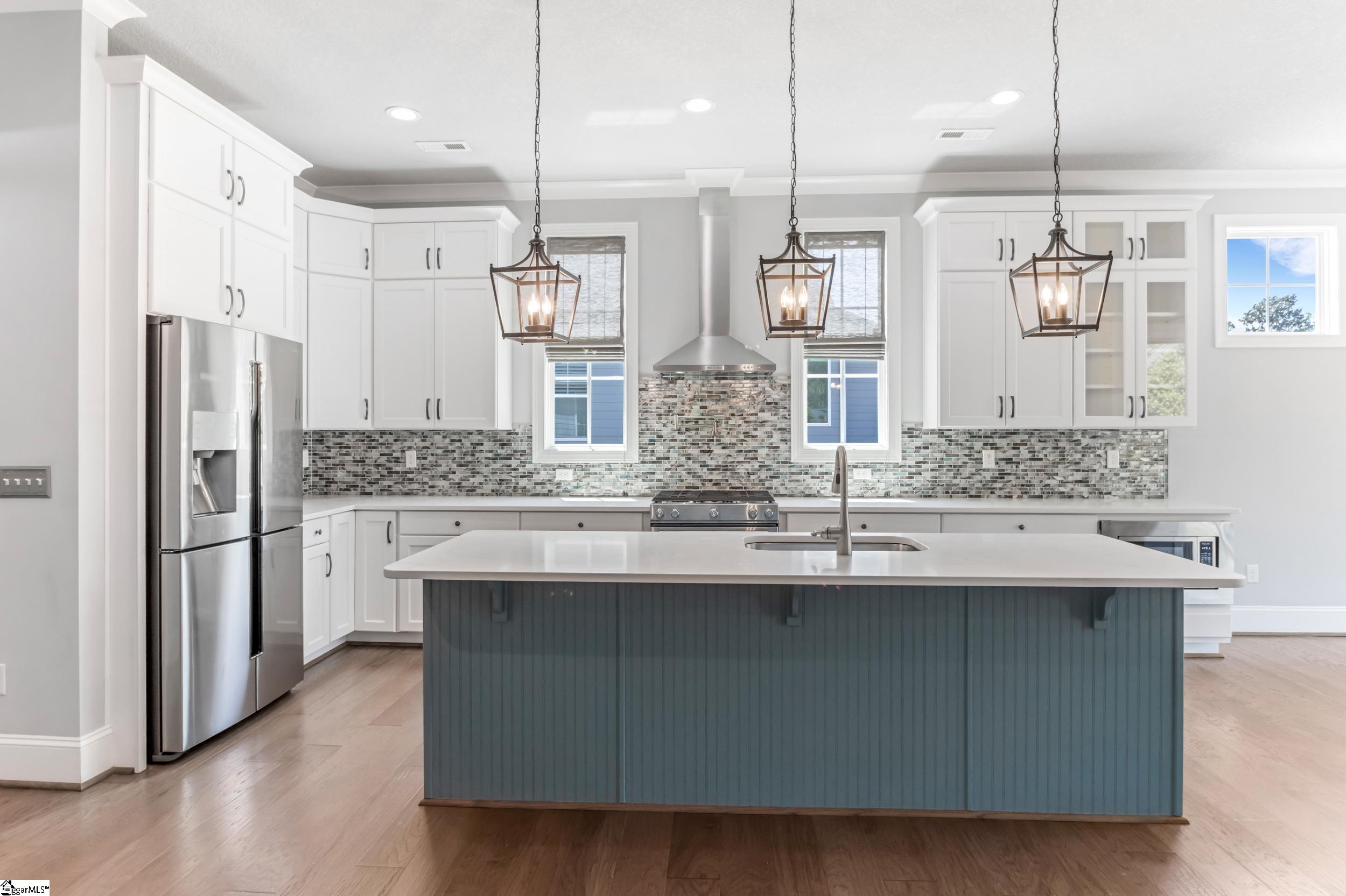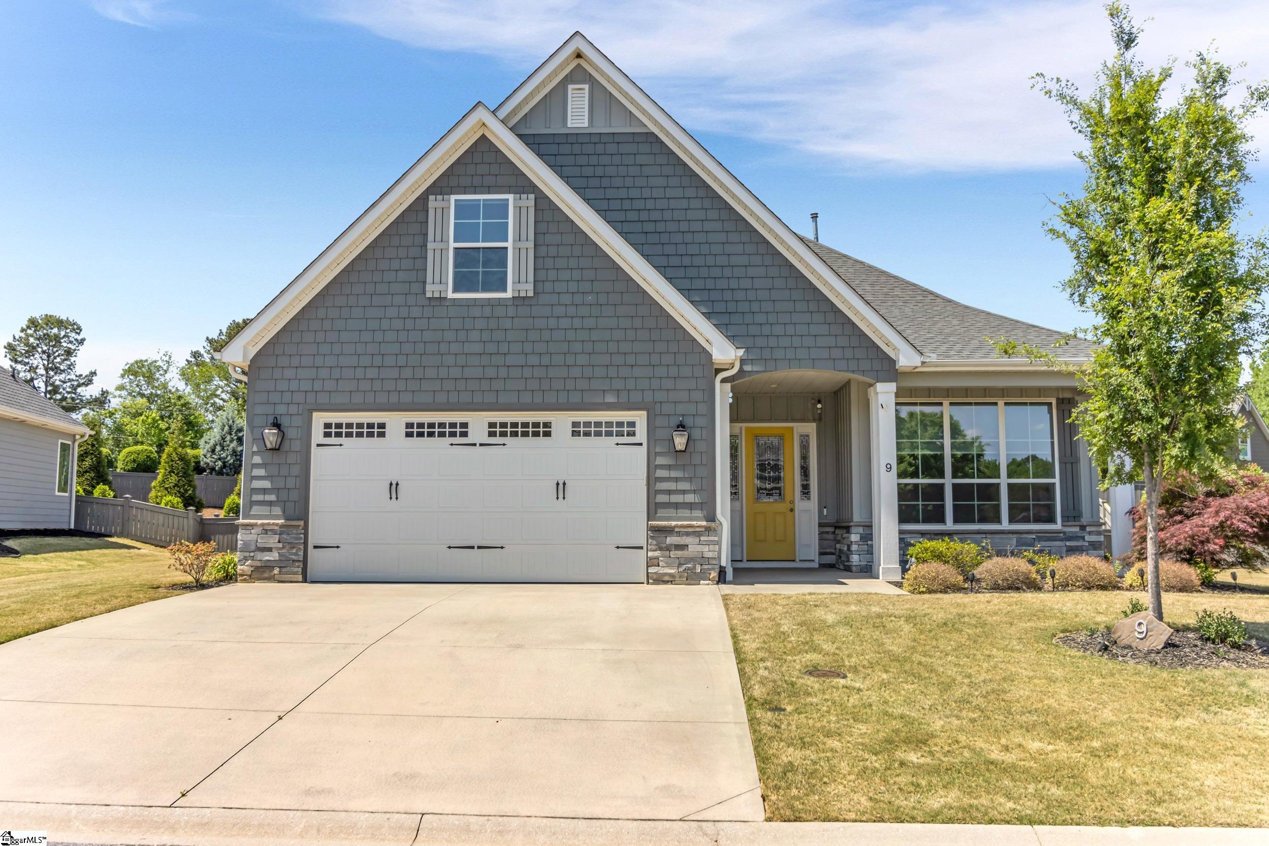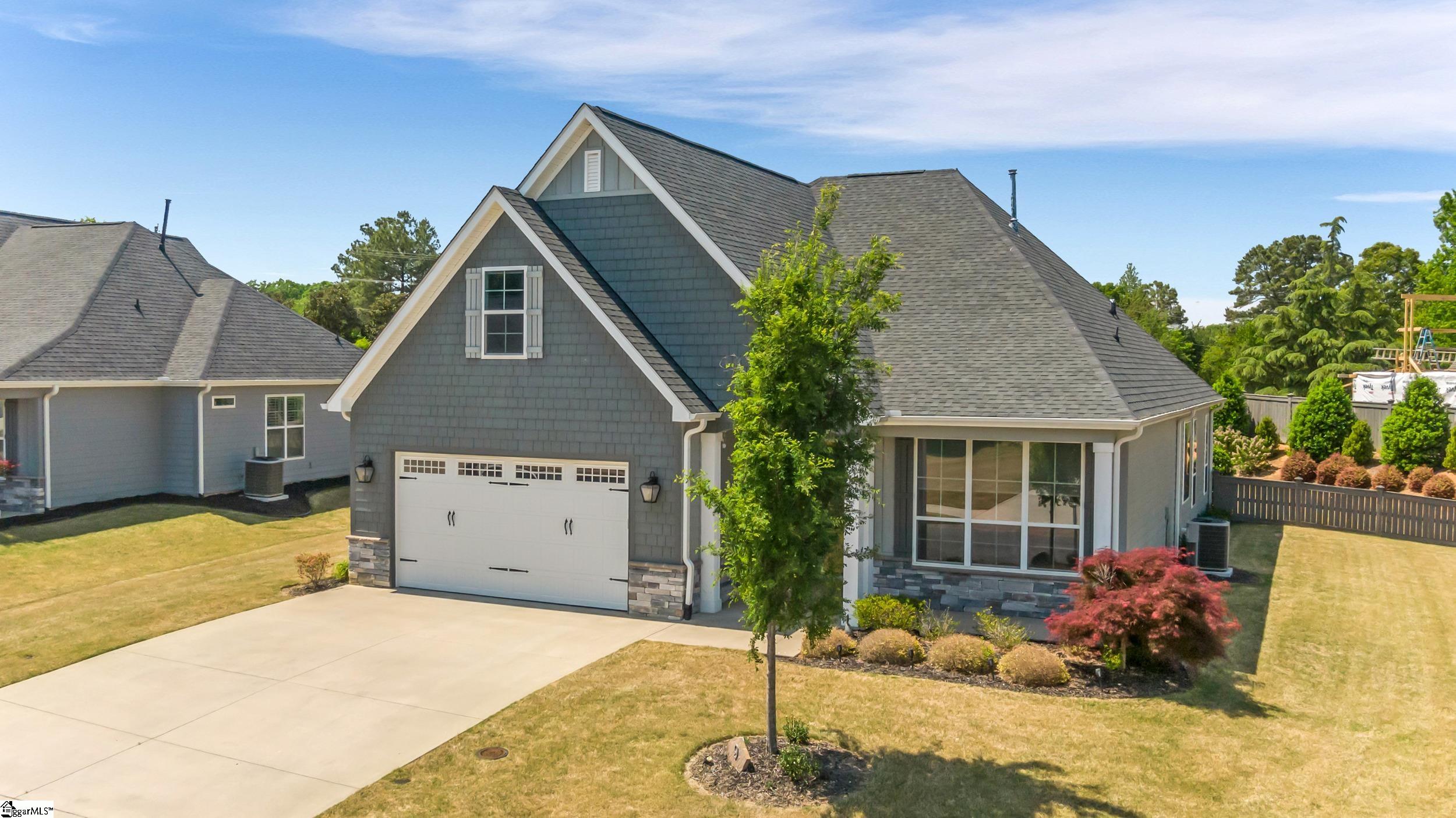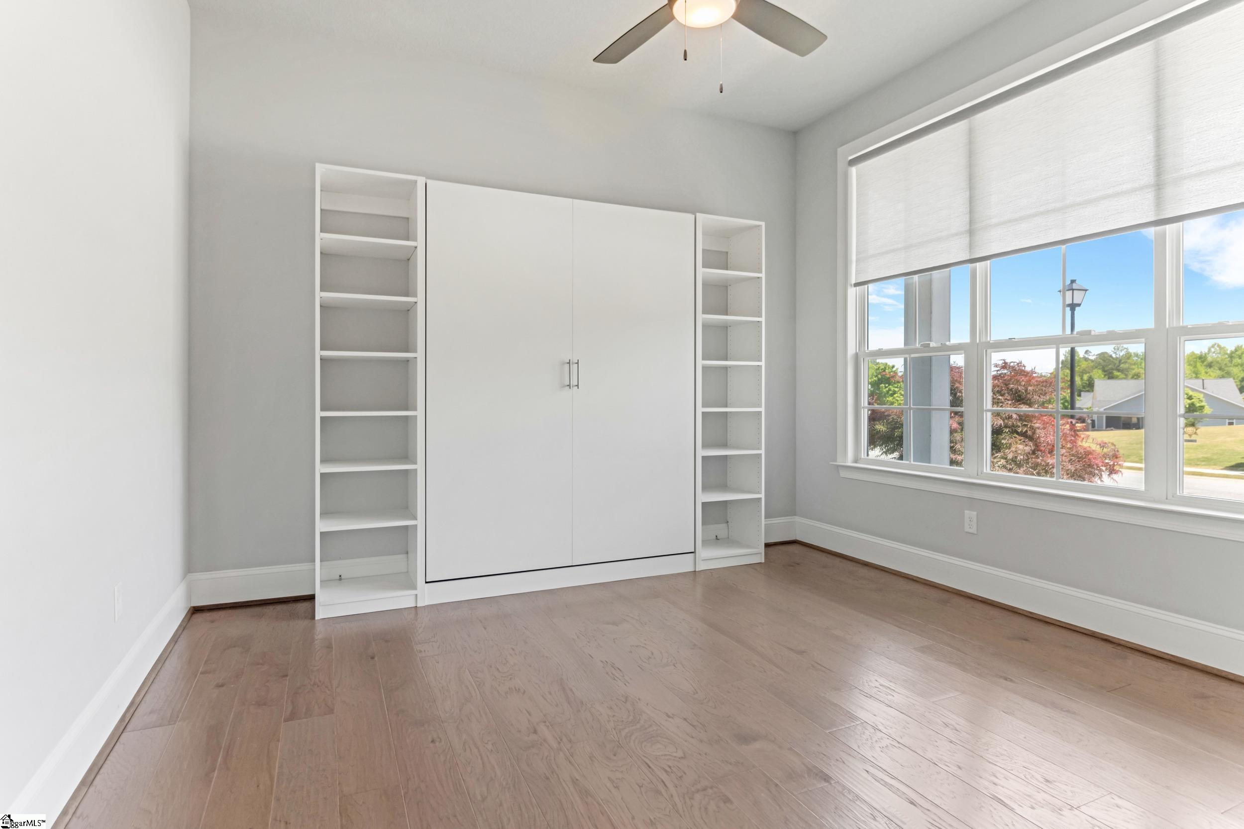 The screened porch alone will make you want to move in. Wood ceiling, stone tile, window shades, and a double-sided gas fireplace with the living room. The extended screened-in porch is the kind of feature that becomes your favorite room. It connects to a fully fenced backyard with a patio and extra landscaping, sitting on one of the largest lots in Ridgestone Cottages.Inside, the main level offers 2 bedrooms and 2 full baths. Ten-foot ceilings, hardwood floors throughout the main living areas, upgraded lighting and plumbing fixtures, and tall windows make the open floor plan feel larger than its footprint. Upstairs, a large versatile space with a walk-in closet and walk-in attic storage works beautifully as a third bedroom, home office, or flex space. The kitchen is sharp and functional: quartz countertops, gas stove, soft-close cabinetry, tiled backsplash, and an oversized island that handles both prep and conversation. The main-level primary suite includes a tiled shower, soaking tub, double vanities, and a generous walk-in closet. A second bedroom and full bath on the main level already included a custom murphy bed to maximize space. Low-maintenance living in a location that puts shopping, dining, and Downtown Greenville within easy reach.