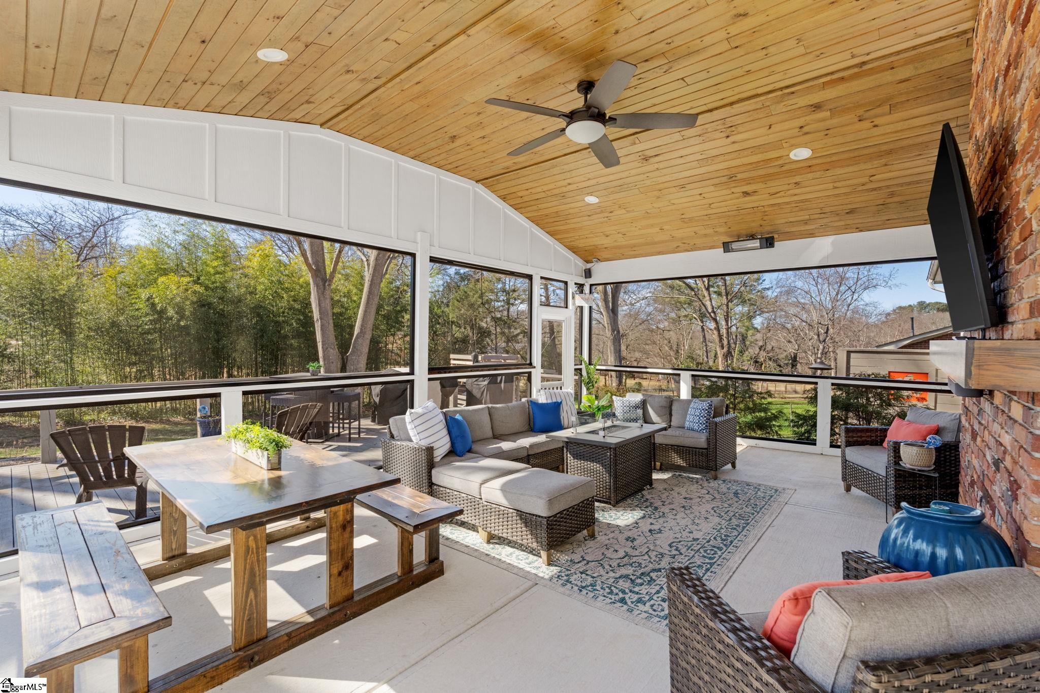 Welcome to 9 New Castle Way — a fully renovated, move-in-ready home perfectly positioned in one of Greenville’s most convenient and desirable locations. This beautifully updated home offers nearly 2400sqft, 4 bedrooms, 3 full bathrooms, and sits on a spacious .43-acre lot with no HOA! The open-concept main living area of the home features refinished hardwood flooring throughout, wood burning fireplace, and a beautifully remodeled kitchen with updated cabinetry, countertops, gas stove, and a refrigerator that will convey at closing. Natural light fills the home through all new windows (2018), while new carpet in the living room adds warmth and comfort. The layout flows effortlessly into the dining and living areas—ideal for everyday living and entertaining. All four bedrooms are spacious in size, and the three full bathrooms have been updated flawlessly with each now showcasing beautiful tile, new vanities, and quartz countertops. One of the true highlights of this home is the expansive outdoor living space. The screened-in porch offers the perfect spot to relax year-round, while the additional patio decking provides ample room for multiple seating arrangements, along with a variety of grilling and outdoor cooking options. This thoughtfully designed outdoor area overlooks the partially fenced backyard with freshly graded land and lush fescue sod, creating an ideal setting for outdoor lovers, entertainers, and anyone who enjoys hosting family and friends in a private, peaceful setting. The home offers functional features throughout, including a walk-in laundry room with a unique laundry chute from the upstairs hallway bath, a 2-car attached garage with workshop, original medicine cabinets in all three full bathrooms to keep a little Southern charm in the home, an active termite bond, and Emerald Zoysia sod in the front yard with beautiful landscaping that boast colorful flower arrangements for that perfect curbside appeal. Additional extensive upgrades include a new 200-amp electrical panel (2018), new kitchen plumbing (2018), new electric upstairs HVAC unit added (2018), architectural shingles (2023), and a new driveway (2022). Enjoy the benefits of no HOA, with the option of a neighborhood pool membership. Other community amenities include walking/biking trail, green space recreational field, updated pool area that includes bathrooms and outdoor cabana space that can be rented out for parties if you wish to opt into the pool membership, and a location that puts you minutes from endless shopping, dining, groceries, Downtown Greenville, Hwy 385, and I-85— All of this offers unmatched convenience for daily living and commuting. This is a rare opportunity to own a fully renovated home on a large lot in an established neighborhood with modern upgrades, timeless charm, and an unbeatable location.