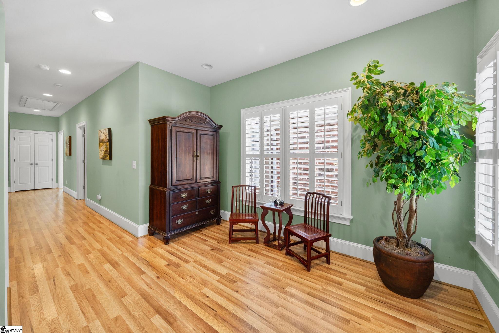 Welcome to this beautifully maintained home offering 5 bedrooms or 4 bedrooms plus a spacious office and second living area, with 3.5 bathrooms and a primary suite on the main level. Designed for comfortable living and easy maintenance, this home features luxury vinyl plank flooring throughout with no carpet, elegant crown molding, and classic craftsman-style finishes. The main-level primary suite includes a garden-style soaking tub, separate shower, and a large walk-in closet, along with a convenient powder room for guests. Upstairs you’ll find four additional bedrooms connected by Jack-and-Jill style bathrooms, providing flexible space for family, guests, or work-from-home needs. The kitchen features granite countertops, stainless steel appliances, 42” cabinets, and a large pantry, opening to spacious living areas with soaring ceilings and abundant natural light. A walk-in laundry room and ample storage in the attic and garage add everyday convenience. Outdoor spaces include a covered front porch and private gated courtyard patio, perfect for relaxing or entertaining. A rear-entry two-car garage allows easy access while maintaining charming curb appeal. Located in a private gated community with HOA-maintained landscaping and exterior maintenance, this home offers a convenient lock-and-leave lifestyle. Residents also enjoy access to the community clubhouse for gatherings and events. Ideally positioned just minutes from Downtown Greenville, Haywood Road shopping, I-385, and Patewood Medical Campus, this home combines location, space, and low-maintenance living in one exceptional opportunity.