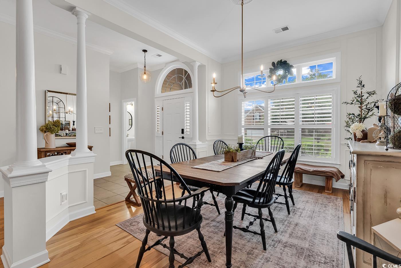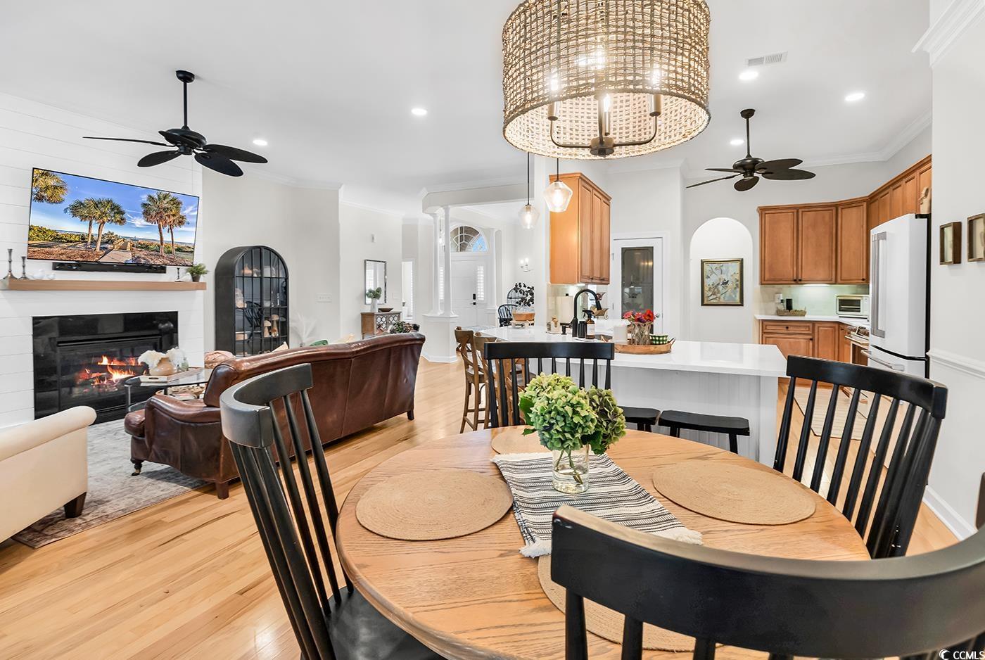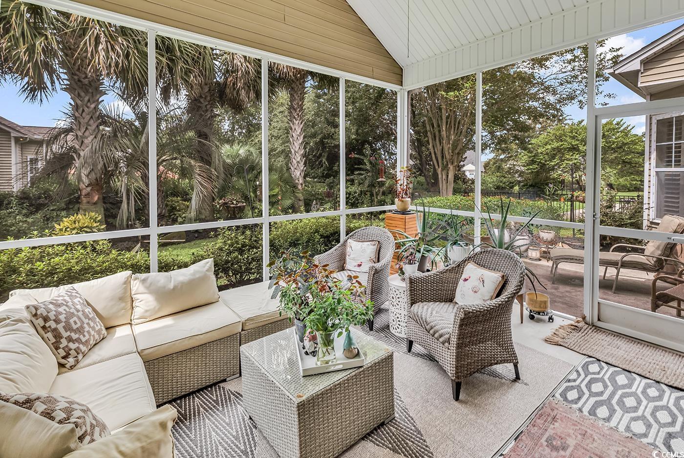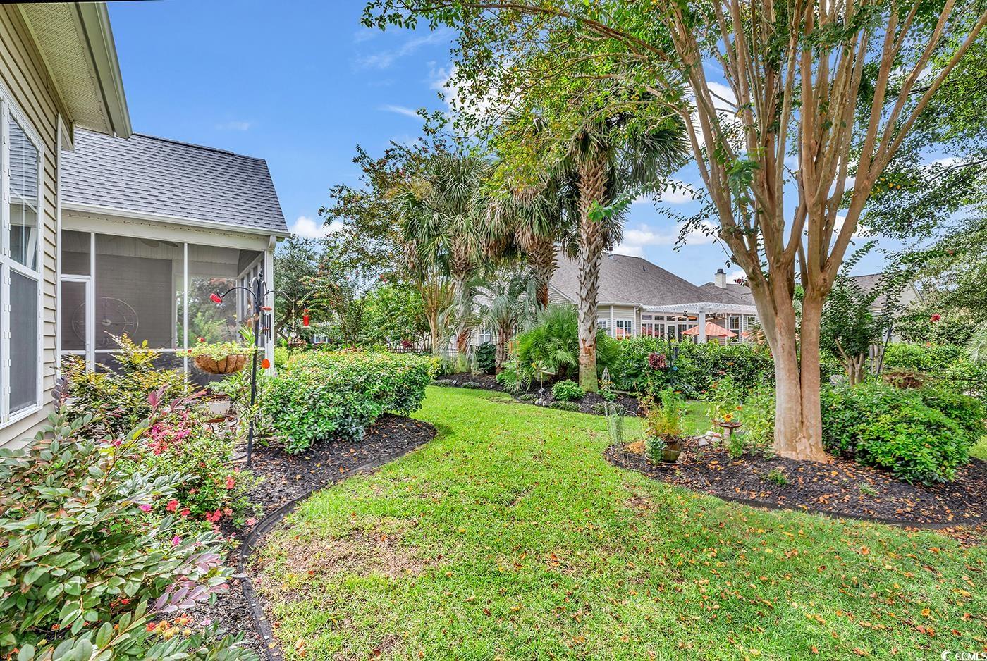 Fall in love with this beautifully upgraded, move-in-ready home offering modern amenities and elegant single-level living. From the impressive entryway, the open floor plan seamlessly connects the great room, formal dining room, and kitchen—perfect for entertaining and hosting the upcoming holidays. The great room features a cozy fireplace, plantation shutters, and abundant natural light, creating a warm, inviting atmosphere. A convenient half bath is located nearby for guests. Step outside to a screened porch and private patio, surrounded by beautifully landscaped gardens, offering the perfect setting to relax and unwind. The spacious owner’s retreat (13.5’ x 23’) provides a private sanctuary with a comfortable seating area. The luxurious owner’s bath features a doorless, zero-entry tiled shower, quartz countertops, and refined finishes. A split floor plan ensures privacy for all, with three guest suites and an additional full bath. One of these rooms is perfect for a home office. Throughout the home, real hardwood flooring adds timeless beauty and ease of maintenance—no carpet anywhere. The modern kitchen is a chef’s delight, featuring new quartz countertops, new white GE Café appliances, a large single stainless-steel sink, new garbage disposal, and custom cabinetry with rollouts. A beveled glass pantry door, updated lighting fixtures and ceiling fans, and a bright eat-in area make the space both functional and inviting. This impressive brick-front home offers a courtyard-entry garage with an additional 4 feet of space, perfect for storage or a workshop. With numerous updates, including a new roof (2020), new HVAC system (2021), new water heater (2022), and freshly painted walls, trim, and ceilings, this home is truly move-in ready. Elegant crown molding, wainscoting, beadboard, and plantation shutters throughout elevate its classic appeal. Community & Location: This vibrant community promotes an active and social lifestyle with amenities including a walk-in style pool, hot tub, tennis and pickleball courts, a fitness-equipped clubhouse, picnic area, and organized neighborhood events. Enjoy a morning stroll or bike ride through scenic surroundings. Conveniently located near restaurants, grocery stores, pharmacies, and the renowned Murrells Inlet Marsh Walk, residents also enjoy easy access to marinas, golf courses, Huntington Beach State Park, and Brookgreen Gardens—all within minutes. Medical offices and hospitals are just a short drive away.