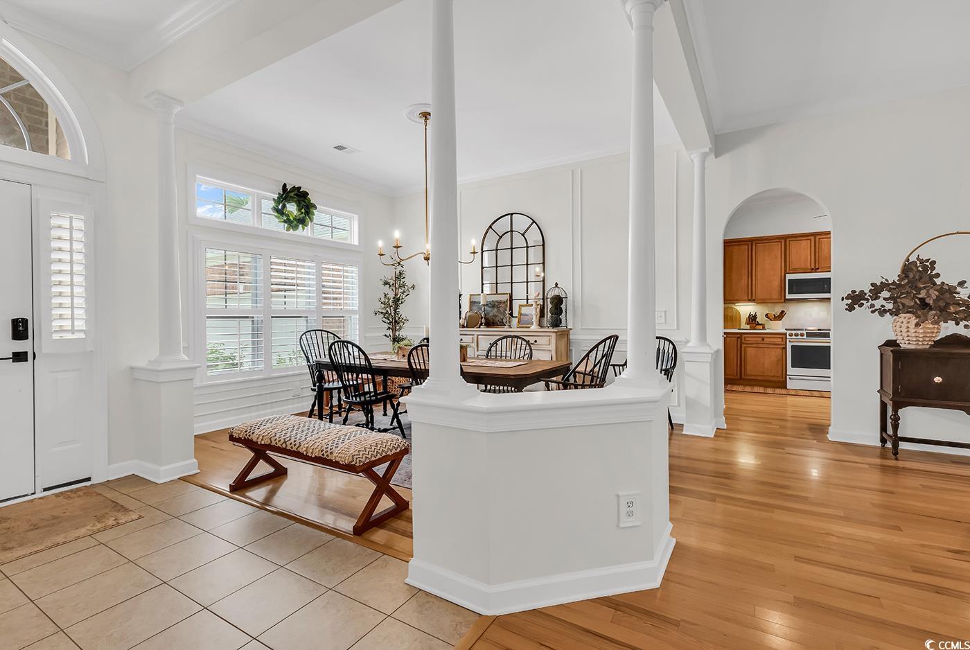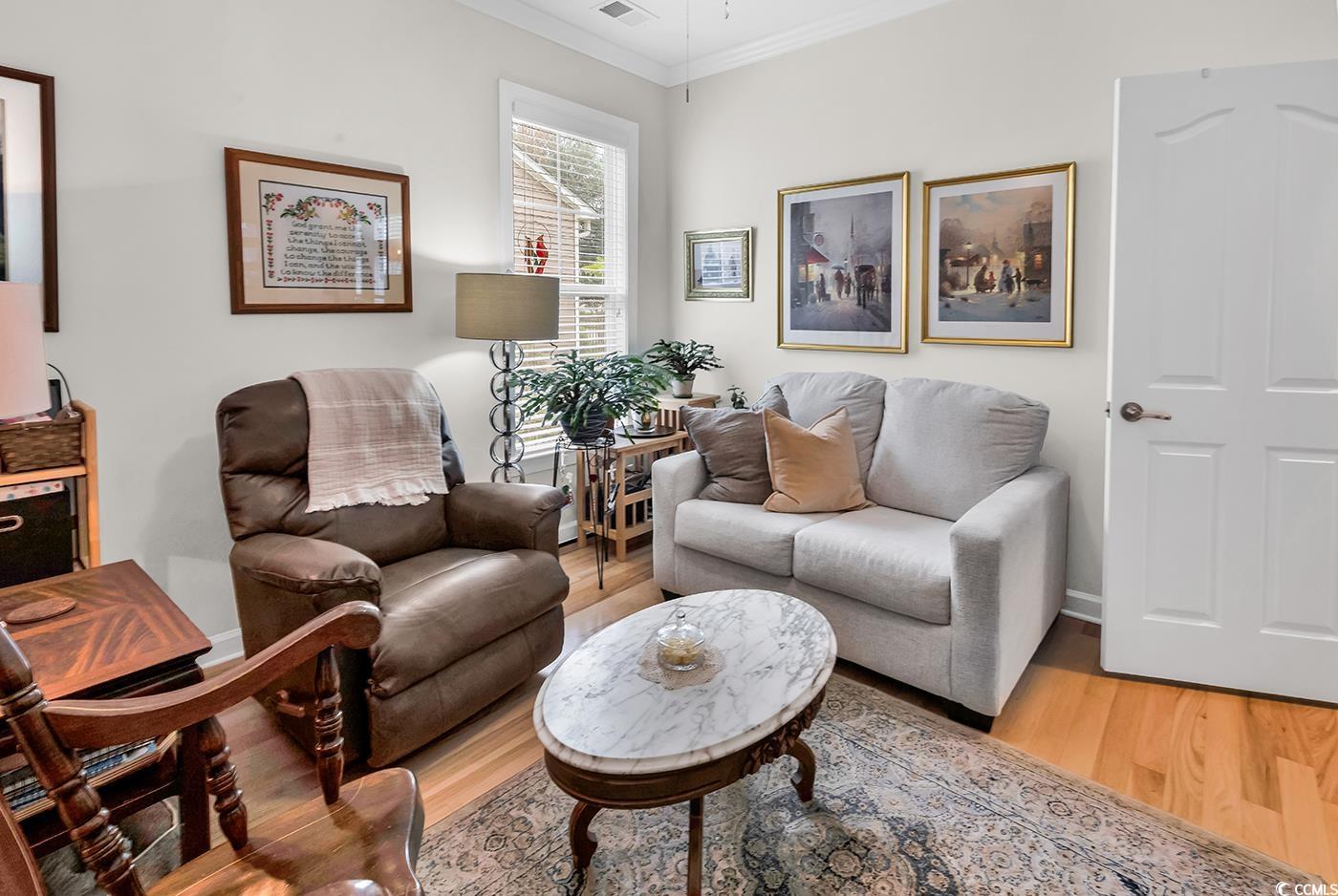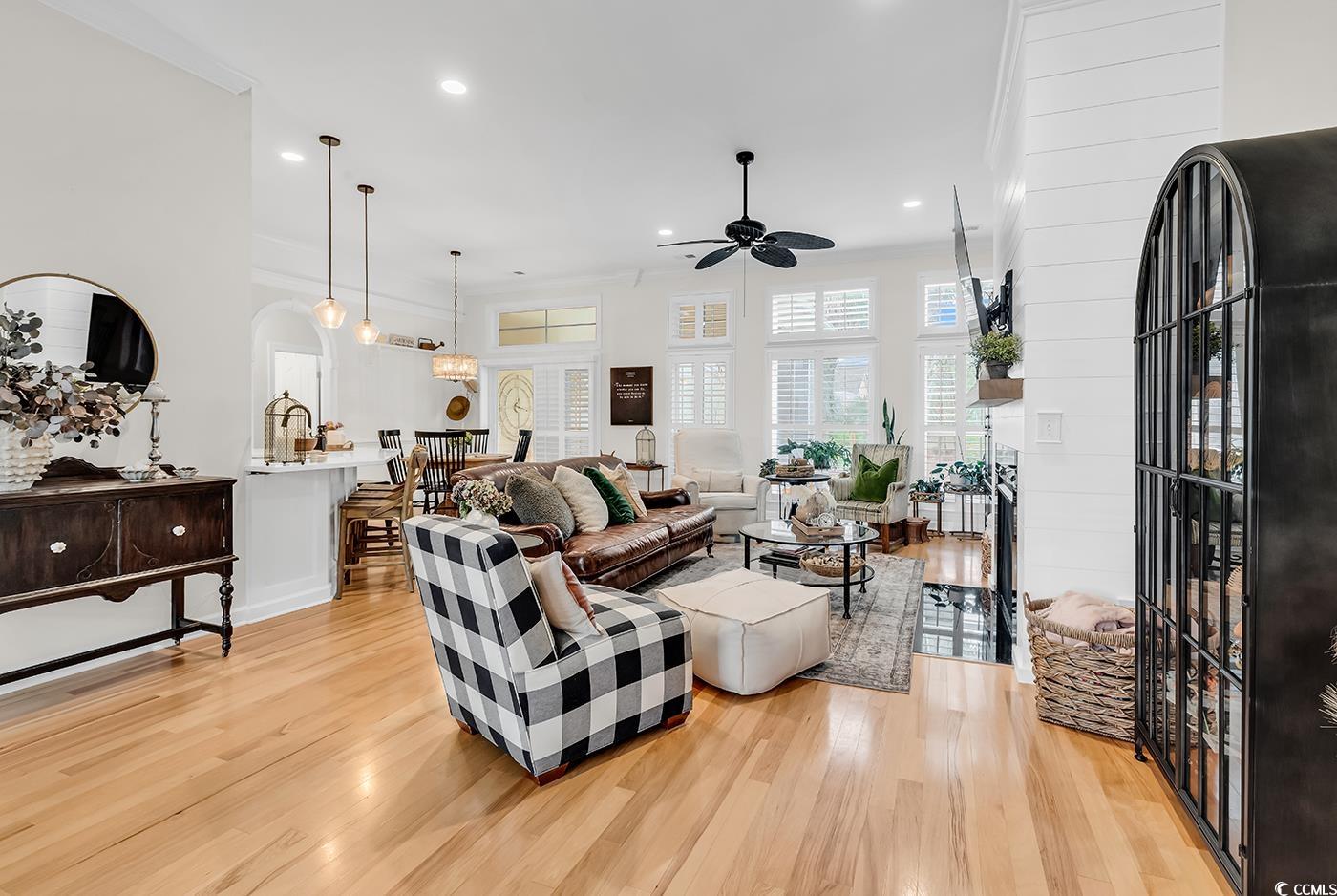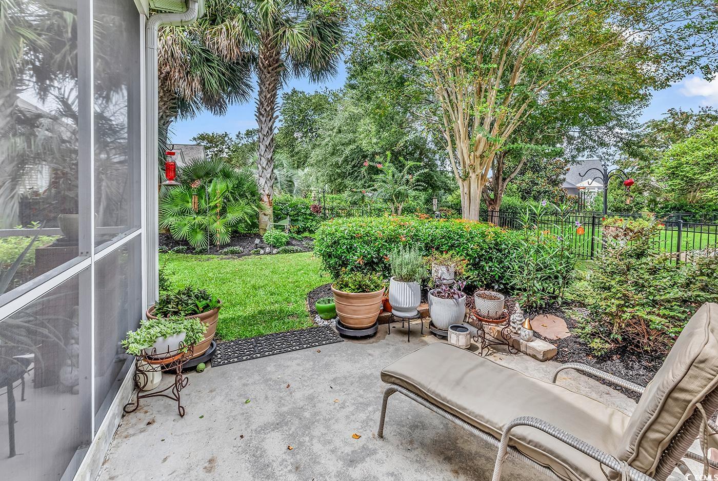 Fall in love with this beautifully upgraded, move-in-ready home offering modern amenities and elegant single-level living. From the impressive entryway, the open floor plan seamlessly connects the great room, formal dining room, and kitchen—perfect for entertaining and hosting the upcoming holidays. The great room features a cozy fireplace, plantation shutters, and abundant natural light, creating a warm, inviting atmosphere. A convenient half bath is located nearby for guests. Step outside to a screened porch and private patio, surrounded by beautifully landscaped gardens, offering the perfect setting to relax and unwind. The spacious owner’s retreat (13.5’ x 23’) provides a private sanctuary with a comfortable seating area. The luxurious owner’s bath features a doorless, zero-entry tiled shower, quartz countertops, and refined finishes. A split floor plan ensures privacy for all, with three guest suites and an additional full bath. One of these rooms is perfect for a home office. Throughout the home, real hardwood flooring adds timeless beauty and ease of maintenance—no carpet anywhere. The modern kitchen is a chef’s delight, featuring new quartz countertops, new white GE Café appliances, a large single stainless-steel sink, new garbage disposal, and custom cabinetry with rollouts. A beveled glass pantry door, updated lighting fixtures and ceiling fans, and a bright eat-in area make the space both functional and inviting. This impressive brick-front home offers a courtyard-entry garage with an additional 4 feet of space, perfect for storage or a workshop. With numerous updates, including a new roof (2020), new HVAC system (2021), new water heater (2022), and freshly painted walls, trim, and ceilings, this home is truly move-in ready. Elegant crown molding, wainscoting, beadboard, and plantation shutters throughout elevate its classic appeal. Community & Location: This vibrant community promotes an active and social lifestyle with amenities including a walk-in style pool, hot tub, tennis and pickleball courts, a fitness-equipped clubhouse, picnic area, and organized neighborhood events. Enjoy a morning stroll or bike ride through scenic surroundings. Conveniently located near restaurants, grocery stores, pharmacies, and the renowned Murrells Inlet Marsh Walk, residents also enjoy easy access to marinas, golf courses, Huntington Beach State Park, and Brookgreen Gardens—all within minutes. Medical offices and hospitals are just a short drive away.