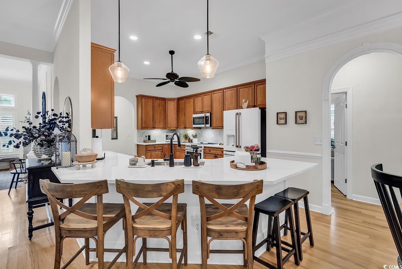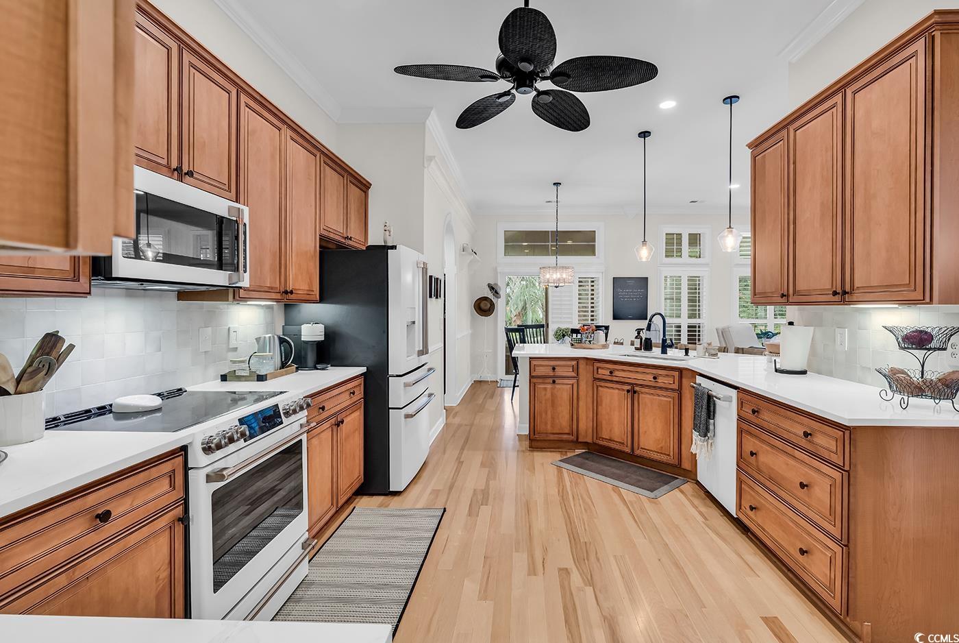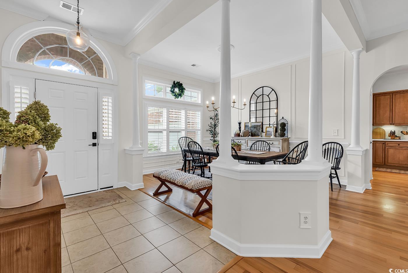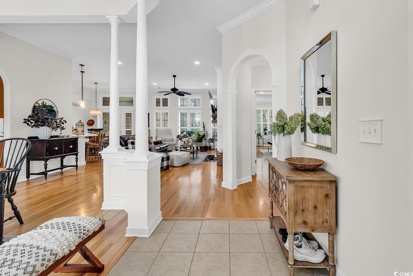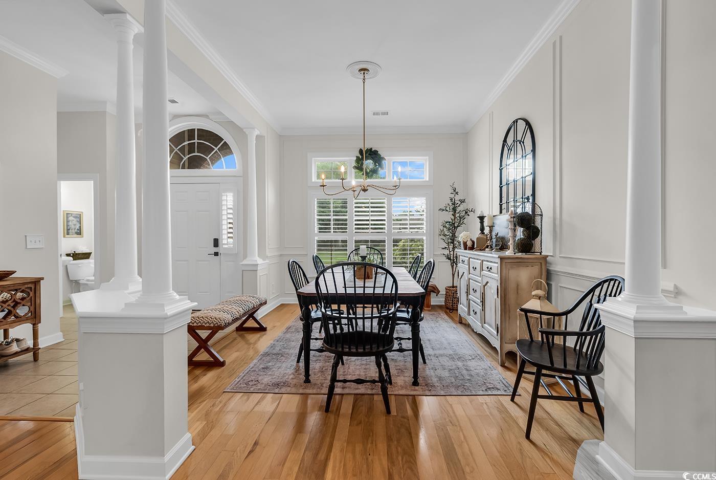 Fall in love with this beautifully upgraded, move-in-ready home offering modern amenities and elegant single-level living. From the impressive entryway, the open floor plan seamlessly connects the great room, formal dining room, and kitchen—perfect for entertaining and hosting the upcoming holidays. The great room features a cozy fireplace, plantation shutters, and abundant natural light, creating a warm, inviting atmosphere. A convenient half bath is located nearby for guests. Step outside to a screened porch and private patio, surrounded by beautifully landscaped gardens, offering the perfect setting to relax and unwind. The spacious owner’s retreat (13.5’ x 23’) provides a private sanctuary with a comfortable seating area. The luxurious owner’s bath features a doorless, zero-entry tiled shower, quartz countertops, and refined finishes. A split floor plan ensures privacy for all, with three guest suites and an additional full bath. One of these rooms is perfect for a home office. Throughout the home, real hardwood flooring adds timeless beauty and ease of maintenance—no carpet anywhere. The modern kitchen is a chef’s delight, featuring new quartz countertops, new white GE Café appliances, a large single stainless-steel sink, new garbage disposal, and custom cabinetry with rollouts. A beveled glass pantry door, updated lighting fixtures and ceiling fans, and a bright eat-in area make the space both functional and inviting. This impressive brick-front home offers a courtyard-entry garage with an additional 4 feet of space, perfect for storage or a workshop. With numerous updates, including a new roof (2020), new HVAC system (2021), new water heater (2022), and freshly painted walls, trim, and ceilings, this home is truly move-in ready. Elegant crown molding, wainscoting, beadboard, and plantation shutters throughout elevate its classic appeal. Community & Location: This vibrant community promotes an active and social lifestyle with amenities including a walk-in style pool, hot tub, tennis and pickleball courts, a fitness-equipped clubhouse, picnic area, and organized neighborhood events. Enjoy a morning stroll or bike ride through scenic surroundings. Conveniently located near restaurants, grocery stores, pharmacies, and the renowned Murrells Inlet Marsh Walk, residents also enjoy easy access to marinas, golf courses, Huntington Beach State Park, and Brookgreen Gardens—all within minutes. Medical offices and hospitals are just a short drive away.