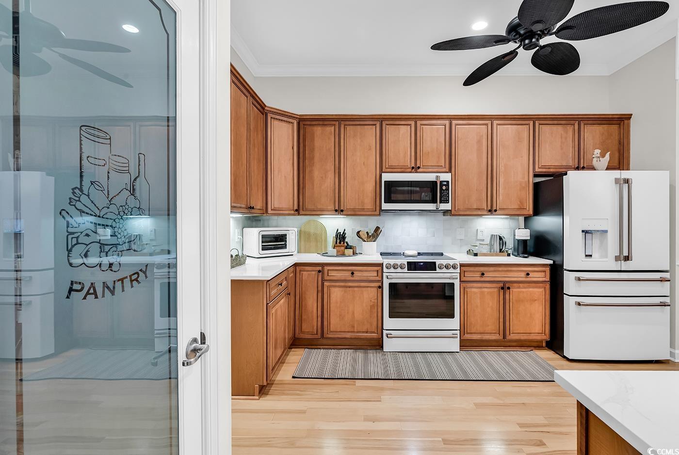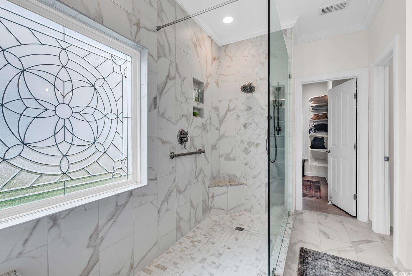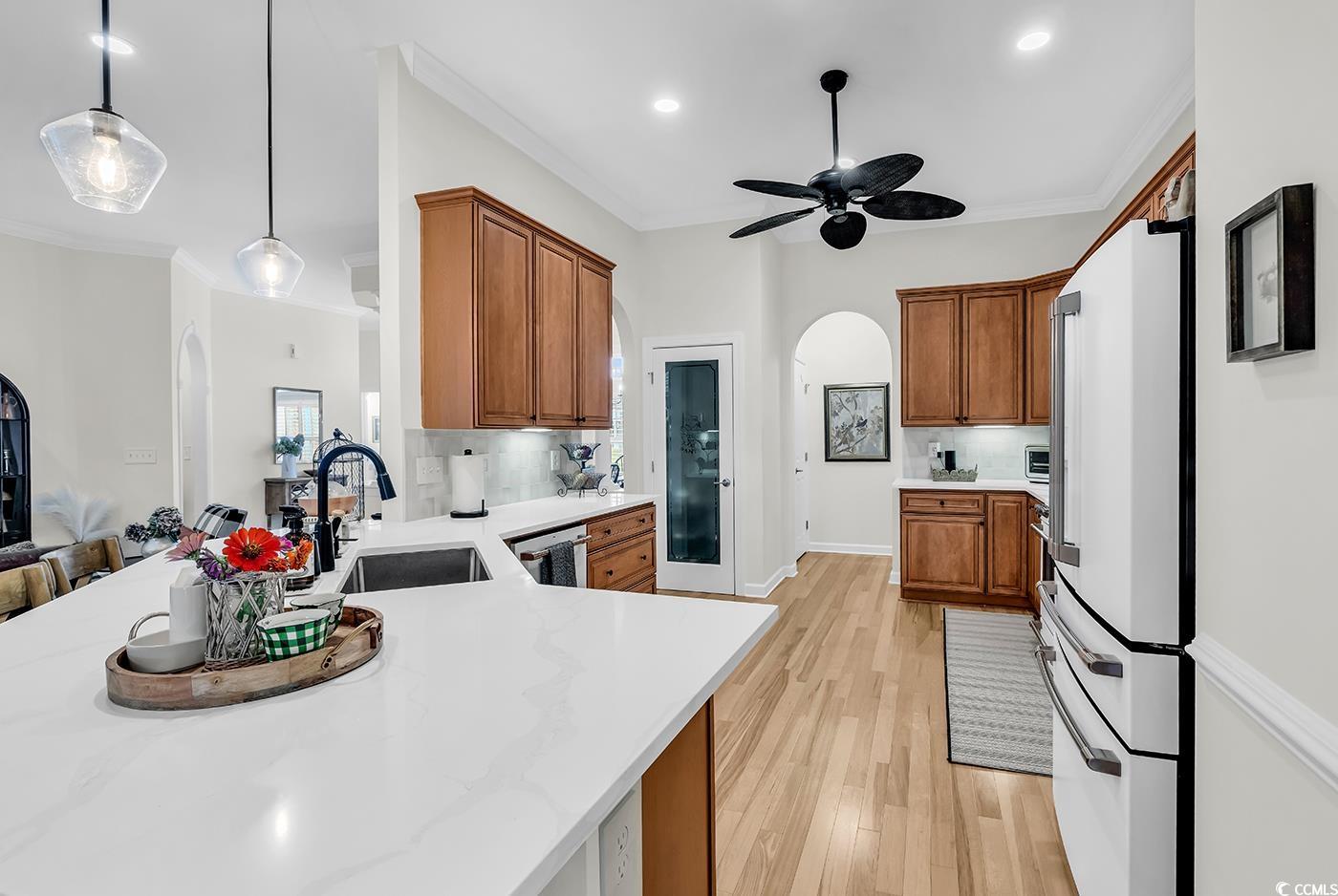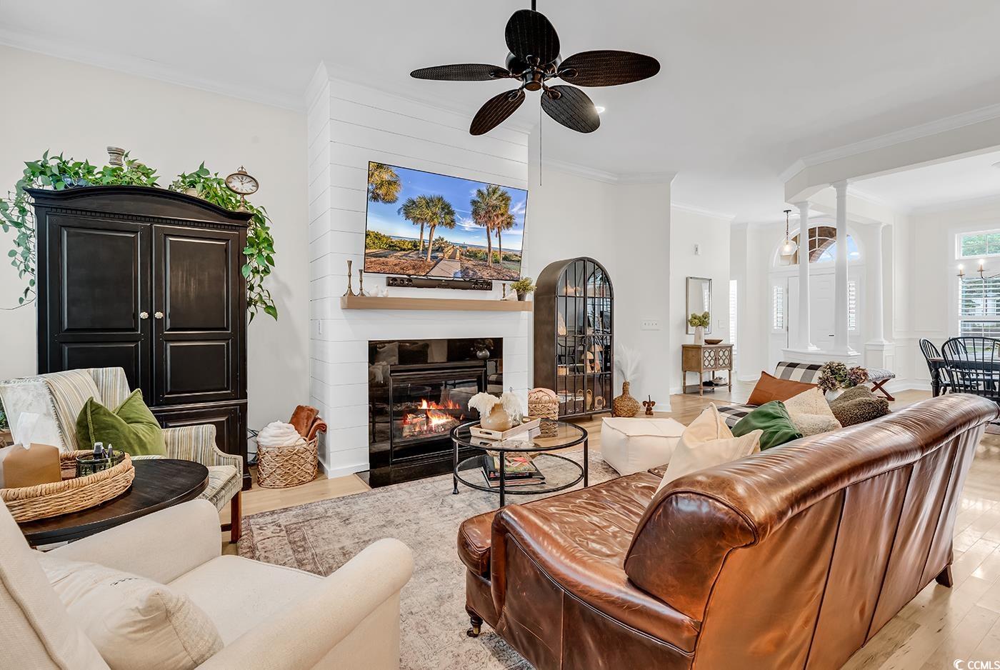 Fall in love with this beautifully upgraded, move-in-ready home offering modern amenities and elegant single-level living. From the impressive entryway, the open floor plan seamlessly connects the great room, formal dining room, and kitchen—perfect for entertaining and hosting the upcoming holidays. The great room features a cozy fireplace, plantation shutters, and abundant natural light, creating a warm, inviting atmosphere. A convenient half bath is located nearby for guests. Step outside to a screened porch and private patio, surrounded by beautifully landscaped gardens, offering the perfect setting to relax and unwind. The spacious owner’s retreat (13.5’ x 23’) provides a private sanctuary with a comfortable seating area. The luxurious owner’s bath features a doorless, zero-entry tiled shower, quartz countertops, and refined finishes. A split floor plan ensures privacy for all, with three guest suites and an additional full bath. One of these rooms is perfect for a home office. Throughout the home, real hardwood flooring adds timeless beauty and ease of maintenance—no carpet anywhere. The modern kitchen is a chef’s delight, featuring new quartz countertops, new white GE Café appliances, a large single stainless-steel sink, new garbage disposal, and custom cabinetry with rollouts. A beveled glass pantry door, updated lighting fixtures and ceiling fans, and a bright eat-in area make the space both functional and inviting. This impressive brick-front home offers a courtyard-entry garage with an additional 4 feet of space, perfect for storage or a workshop. With numerous updates, including a new roof (2020), new HVAC system (2021), new water heater (2022), and freshly painted walls, trim, and ceilings, this home is truly move-in ready. Elegant crown molding, wainscoting, beadboard, and plantation shutters throughout elevate its classic appeal. Community & Location: This vibrant community promotes an active and social lifestyle with amenities including a walk-in style pool, hot tub, tennis and pickleball courts, a fitness-equipped clubhouse, picnic area, and organized neighborhood events. Enjoy a morning stroll or bike ride through scenic surroundings. Conveniently located near restaurants, grocery stores, pharmacies, and the renowned Murrells Inlet Marsh Walk, residents also enjoy easy access to marinas, golf courses, Huntington Beach State Park, and Brookgreen Gardens—all within minutes. Medical offices and hospitals are just a short drive away.