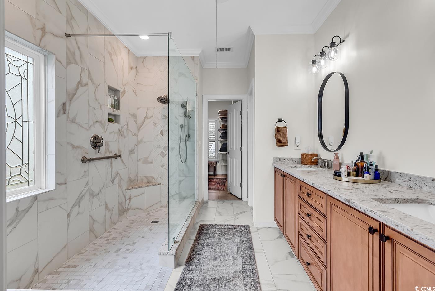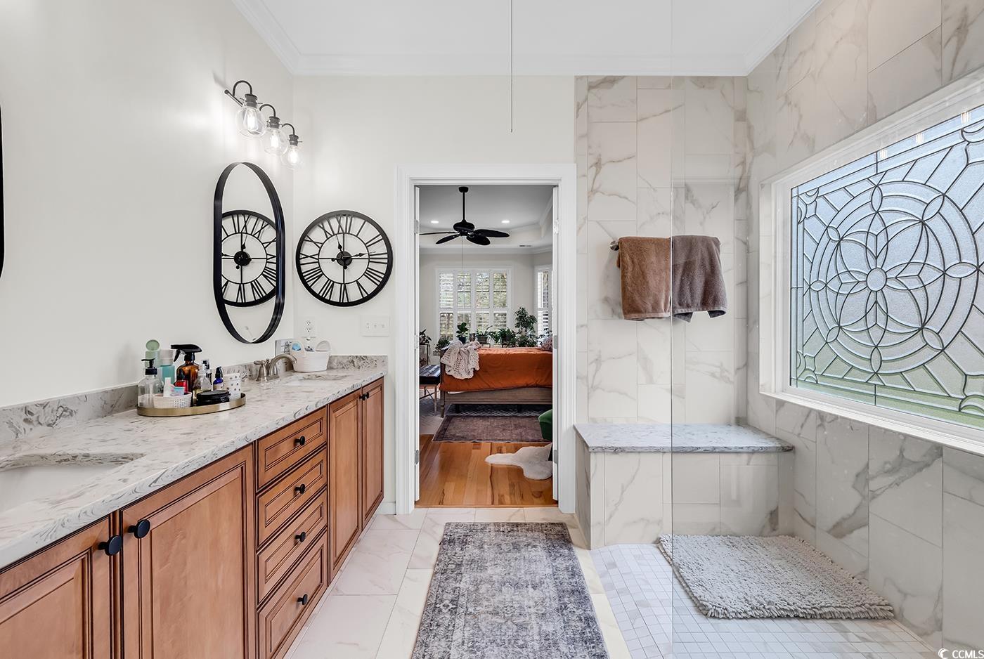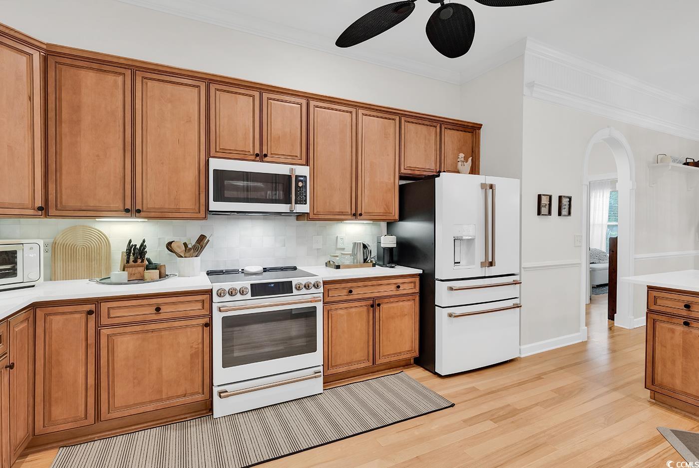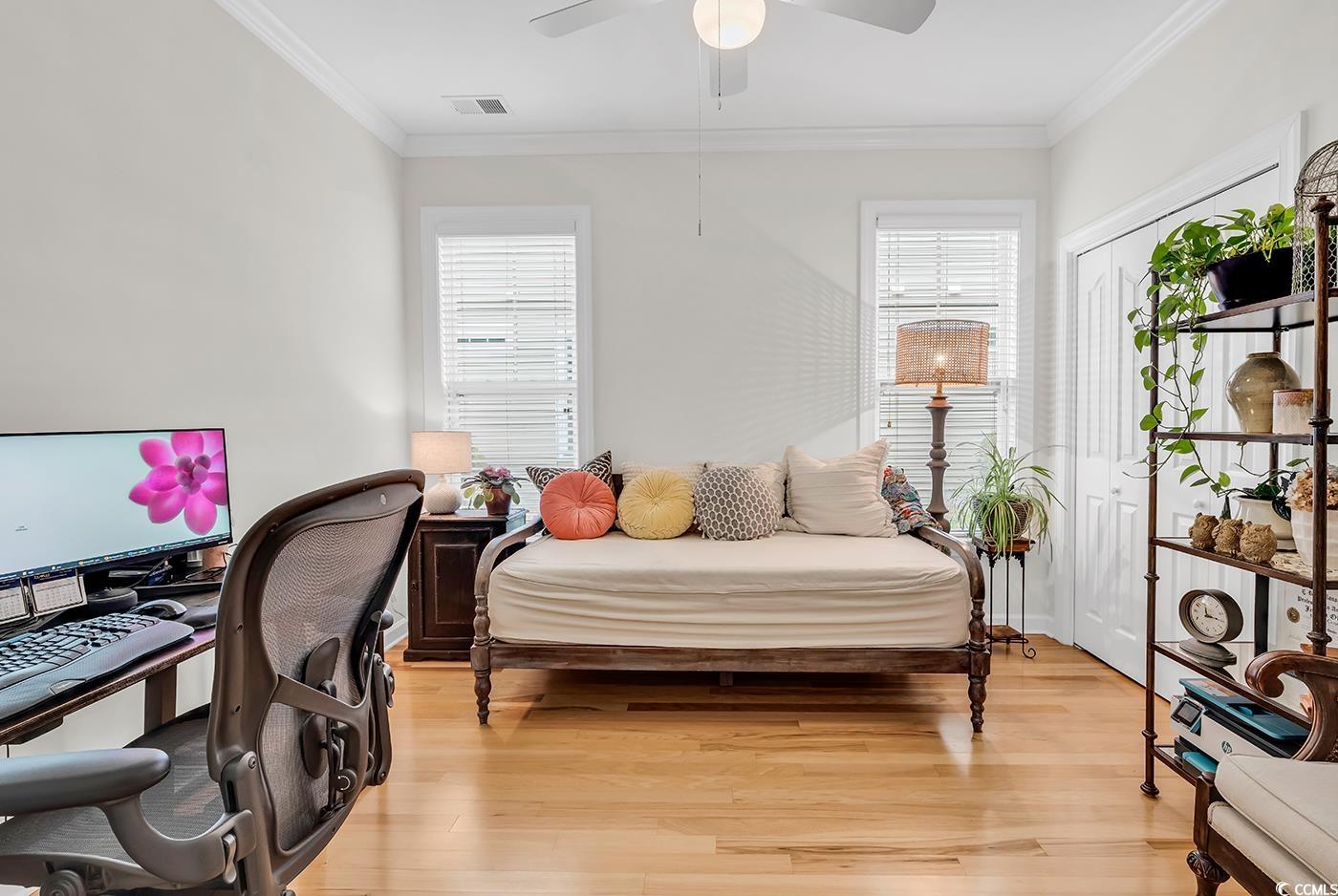 Fall in love with this beautifully upgraded, move-in-ready home offering modern amenities and elegant single-level living. From the impressive entryway, the open floor plan seamlessly connects the great room, formal dining room, and kitchen—perfect for entertaining and hosting the upcoming holidays. The great room features a cozy fireplace, plantation shutters, and abundant natural light, creating a warm, inviting atmosphere. A convenient half bath is located nearby for guests. Step outside to a screened porch and private patio, surrounded by beautifully landscaped gardens, offering the perfect setting to relax and unwind. The spacious owner’s retreat (13.5’ x 23’) provides a private sanctuary with a comfortable seating area. The luxurious owner’s bath features a doorless, zero-entry tiled shower, quartz countertops, and refined finishes. A split floor plan ensures privacy for all, with three guest suites and an additional full bath. One of these rooms is perfect for a home office. Throughout the home, real hardwood flooring adds timeless beauty and ease of maintenance—no carpet anywhere. The modern kitchen is a chef’s delight, featuring new quartz countertops, new white GE Café appliances, a large single stainless-steel sink, new garbage disposal, and custom cabinetry with rollouts. A beveled glass pantry door, updated lighting fixtures and ceiling fans, and a bright eat-in area make the space both functional and inviting. This impressive brick-front home offers a courtyard-entry garage with an additional 4 feet of space, perfect for storage or a workshop. With numerous updates, including a new roof (2020), new HVAC system (2021), new water heater (2022), and freshly painted walls, trim, and ceilings, this home is truly move-in ready. Elegant crown molding, wainscoting, beadboard, and plantation shutters throughout elevate its classic appeal. Community & Location: This vibrant community promotes an active and social lifestyle with amenities including a walk-in style pool, hot tub, tennis and pickleball courts, a fitness-equipped clubhouse, picnic area, and organized neighborhood events. Enjoy a morning stroll or bike ride through scenic surroundings. Conveniently located near restaurants, grocery stores, pharmacies, and the renowned Murrells Inlet Marsh Walk, residents also enjoy easy access to marinas, golf courses, Huntington Beach State Park, and Brookgreen Gardens—all within minutes. Medical offices and hospitals are just a short drive away.