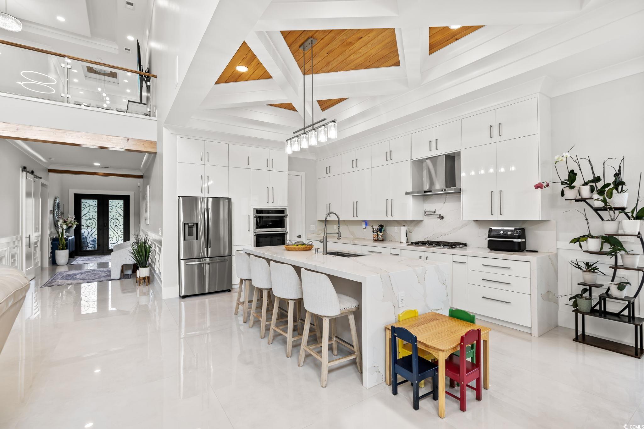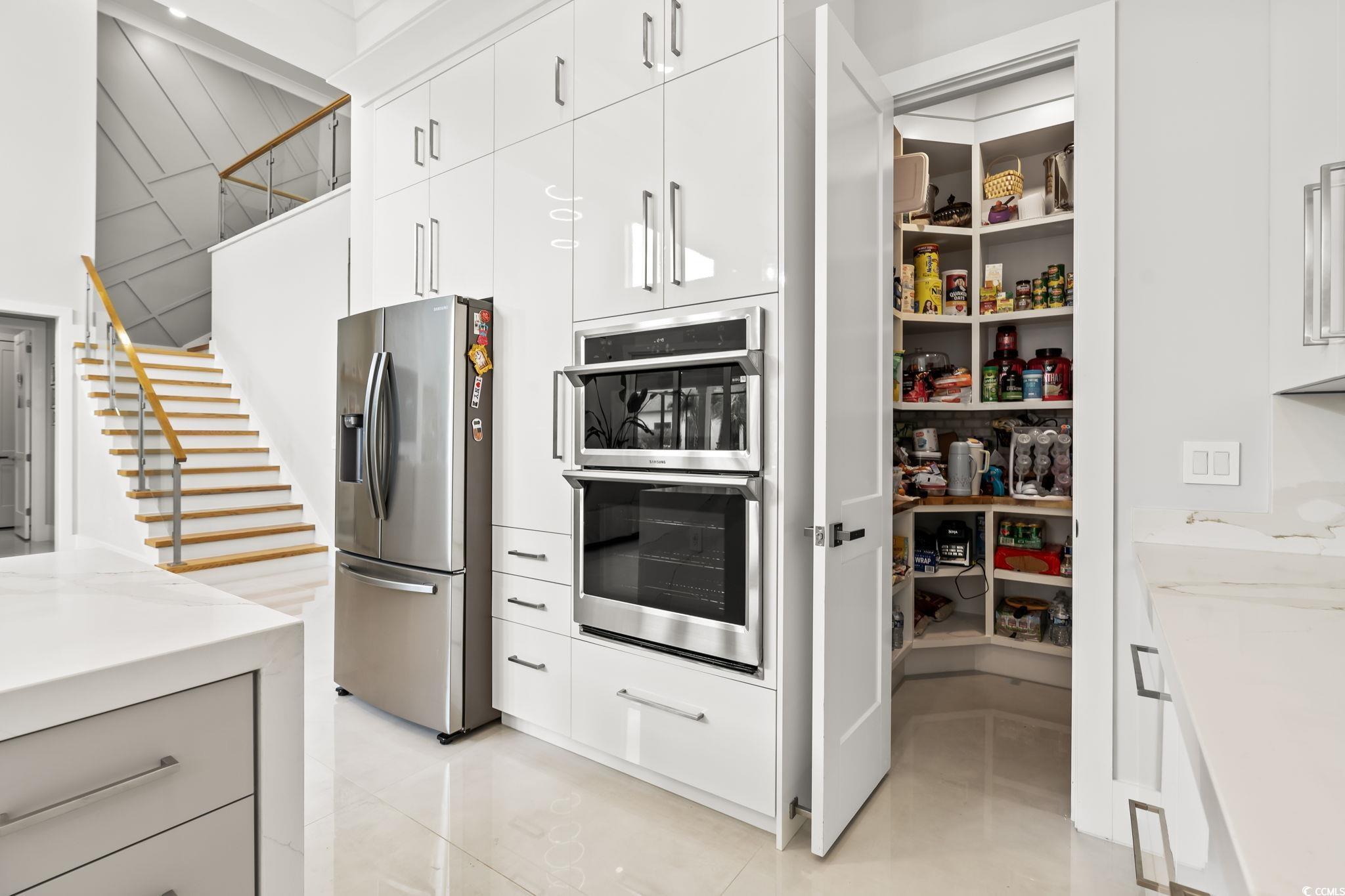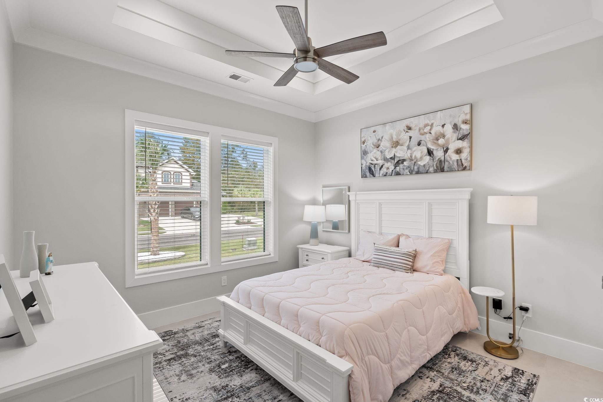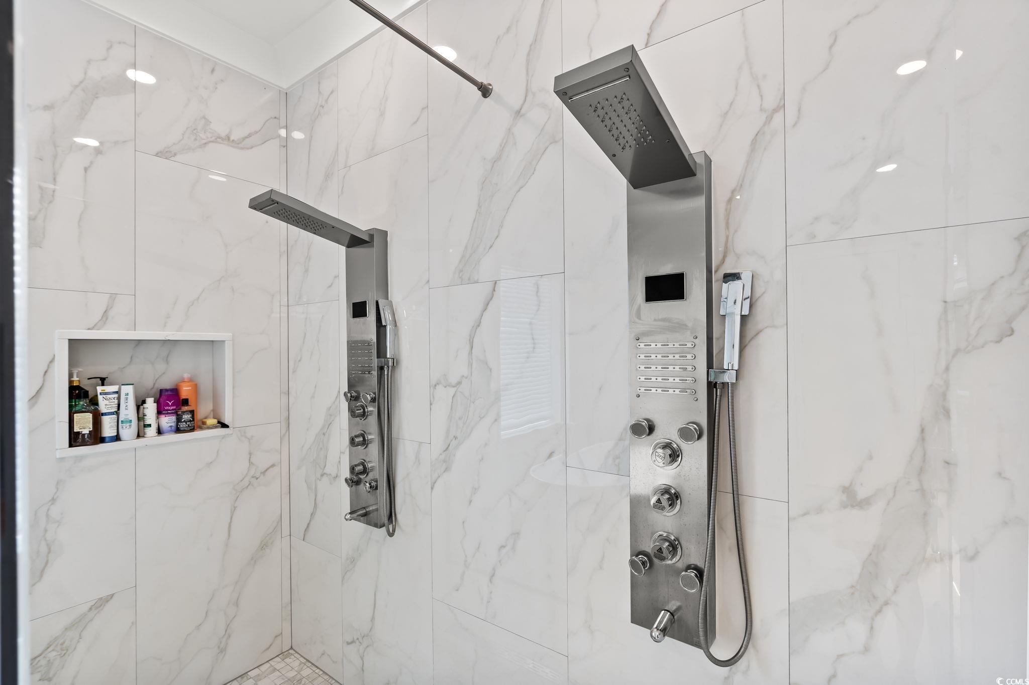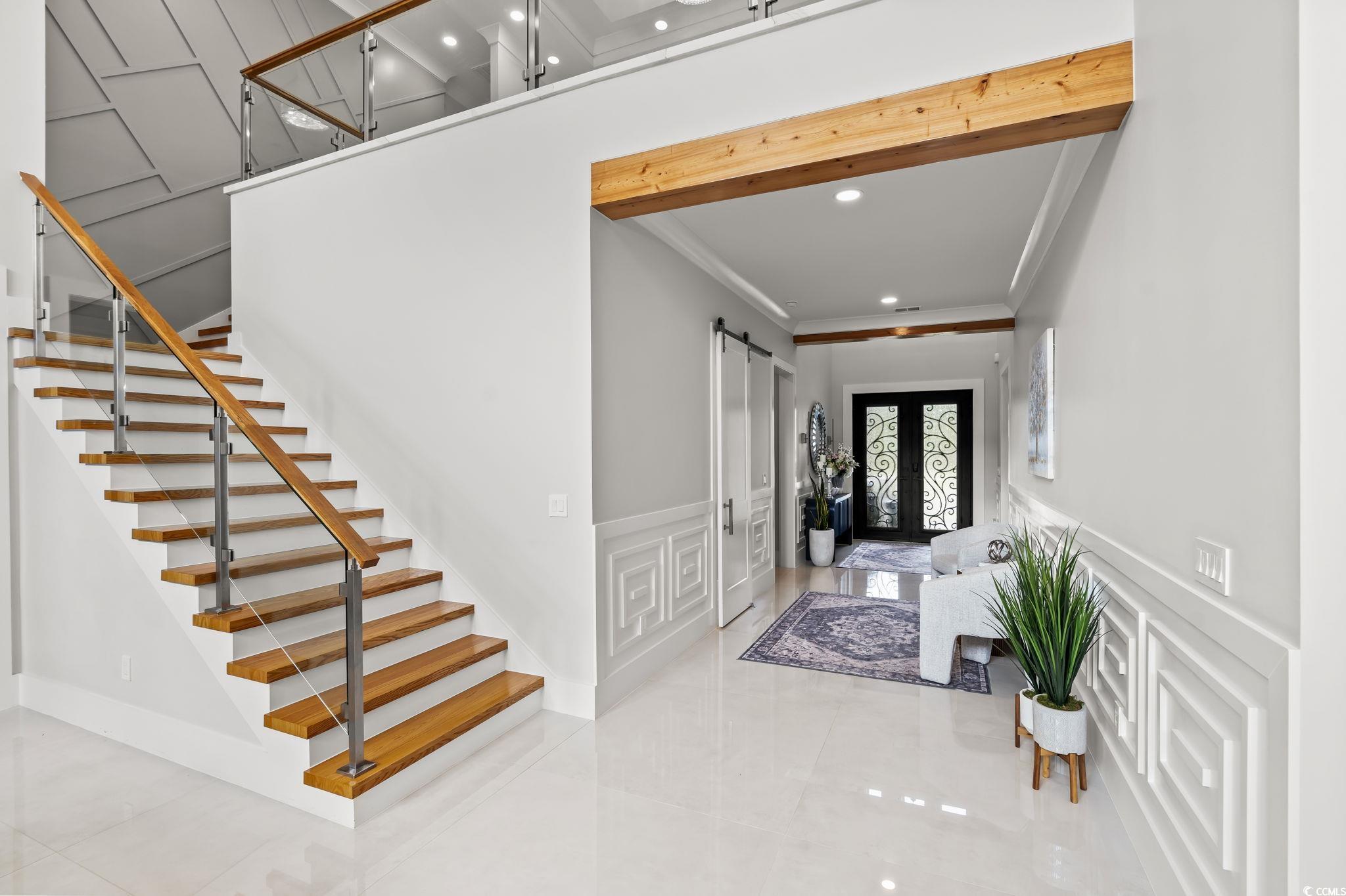 This exquisite custom-built residence is located in the gated community of Carolina Waterway Plantation along the Intracoastal Waterway. The luxury home, featuring 4 bedrooms, 1 office, and 3.5 bathrooms, blends architectural elegance with resort-style living. Built with 2x6 exterior walls, spray foam insulation in the walls and the attic, and a sleek white stucco finish, it is accented by black modern windows, soffit lighting, a paver driveway and walkway, and stone hardscape with palm tree detailing for timeless curb appeal. The outdoor oasis features a pool enclosure (cage) 54 x 23 feet over the pool deck. The salt and heated pool size is 15 x 27 feet, along with an 8 x 8 feet jacuzzi spa, a waterfall wall, travertine tiles pool deck, and a full outdoor kitchen complete with a Brazilian grill, stove, refrigerator, draft box/ beer keg, sink, and granite countertops—perfect for entertaining family and friends. A half bath, storage room, outdoor shower, and wood-paneled porch ceiling add to the luxury experience. Inside, sophistication flows through every detail—4 x 4 tile floors throughout the home, high ceilings, crown molding, and wood ceiling accents. The living room’s 22-ft stone-accented wall, electric fireplace, four panels of a 10-foot sliding glass door, glass handrail, and wooden staircase create a grand architectural statement. The chef’s kitchen offers quartz countertops, a waterfall island, a gas cooktop, a built-in oven and microwave, and plenty of European glossy cabinetry, custom built-in shelving in the pantry room. All four bedrooms are spacious with tray ceilings and large windows; the primary suite impresses with his-and-hers custom closets and a spa-like bath featuring dual vanities, rainfall showers, and a freestanding soaking tub. Additional highlights include an epoxy-coated garage, smart camera/speaker systems, and professional tropical landscaping. Every element of this home is designed for beauty, comfort, and modern coastal living. The community features a pickleball and tennis court, a community outdoor pool with a clubhouse, Boat and RV parking/storage, and a waterway boat access ramp. Located near stores, restaurants, and a hospital with a short drive to the Atlantic Ocean beaches, this property is your Perfect Dream Home. Don't miss out and schedule your showing today!