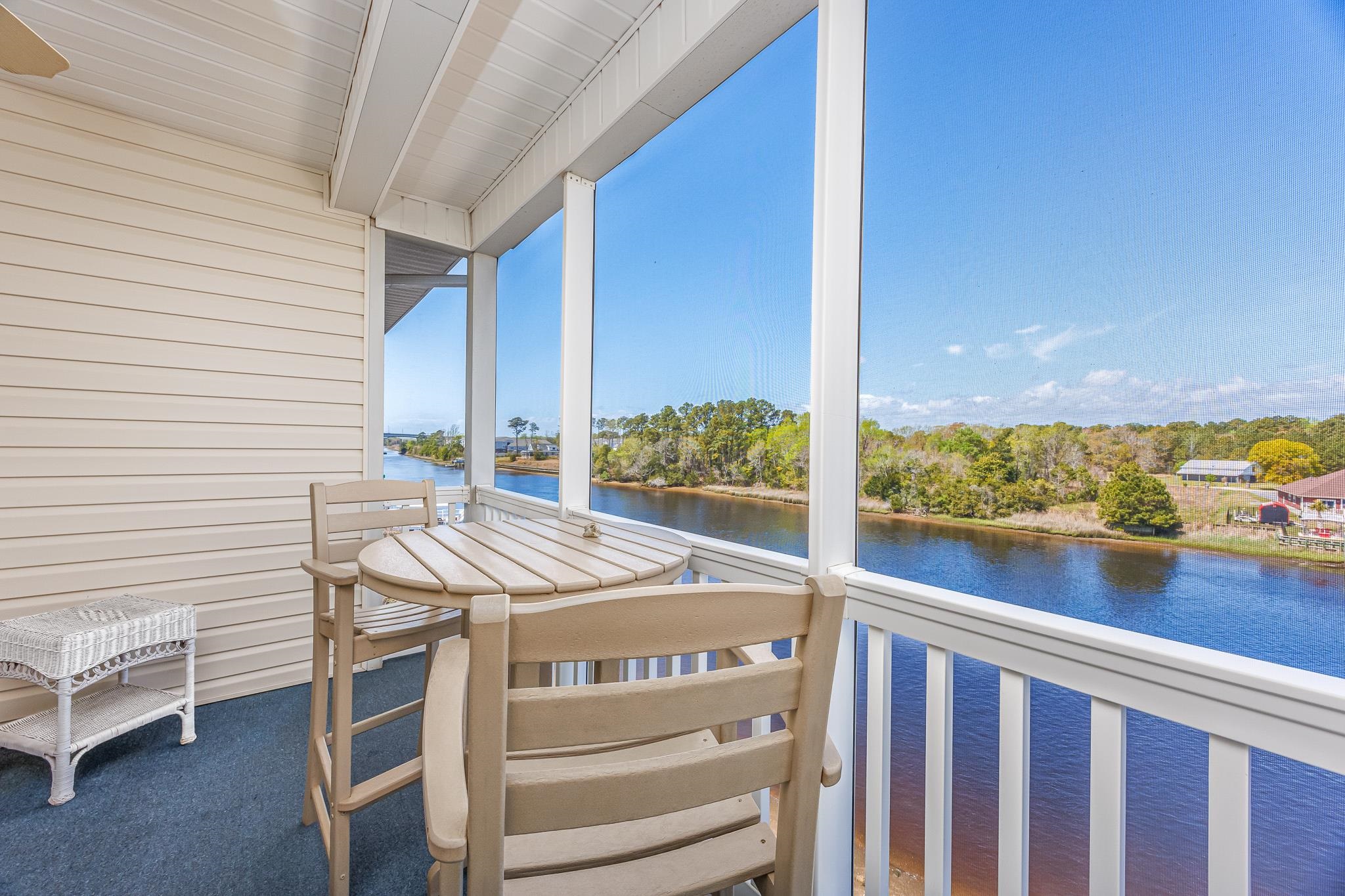 Welcome home to this beautifully furnished 2-bedroom, 2-bathroom condo offering breathtaking views of the Intracoastal Waterway in the desirable Carolina Keyes community. Located on the third floor and easily accessible by elevator, this top-floor unit combines comfort, style, and convenience in one exceptional coastal retreat. Step inside to an open and airy floor plan enhanced by vaulted ceilings and abundant natural light. The spacious living area flows seamlessly into the screened-in porch through extended double doors, creating the perfect setting for relaxing, entertaining, or simply enjoying the peaceful water views. Hardwood floors run throughout the kitchen, dining, and living areas, adding warmth and elegance to the main living space. The well-appointed kitchen features granite countertops, a coordinating backsplash, and a full suite of appliances including a refrigerator, stove/oven, dishwasher, and microwave (2024). The open layout keeps the chef connected to the dining and living areas, making it ideal for everyday living or hosting guests. Wake up to beautiful water views from the primary suite, which boasts a wall of windows, tray ceiling, ceiling fan, and a spacious walk-in closet. The private tiled ensuite bathroom includes both a tub and shower for added comfort. The second bedroom is generously sized with a ceiling fan and convenient access to the second bathroom, which also features a separate entrance for guests. Additional updates include a washer and dryer (2024), as well as a new HVAC system and hot water heater installed in 2024, offering peace of mind for years to come. Carolina Keyes residents enjoy outstanding amenities including two pools, two hot tubs, and two boat docks along the Intracoastal Waterway. The HOA also includes water, sewer, cable, internet, pest control, and landscaping, making for easy, low-maintenance living. Ideally located just minutes from the beach, shopping, dining, the Barefoot Resort entertainment complex, and several championship golf courses, this condo offers the perfect combination of relaxation, recreation, and convenience