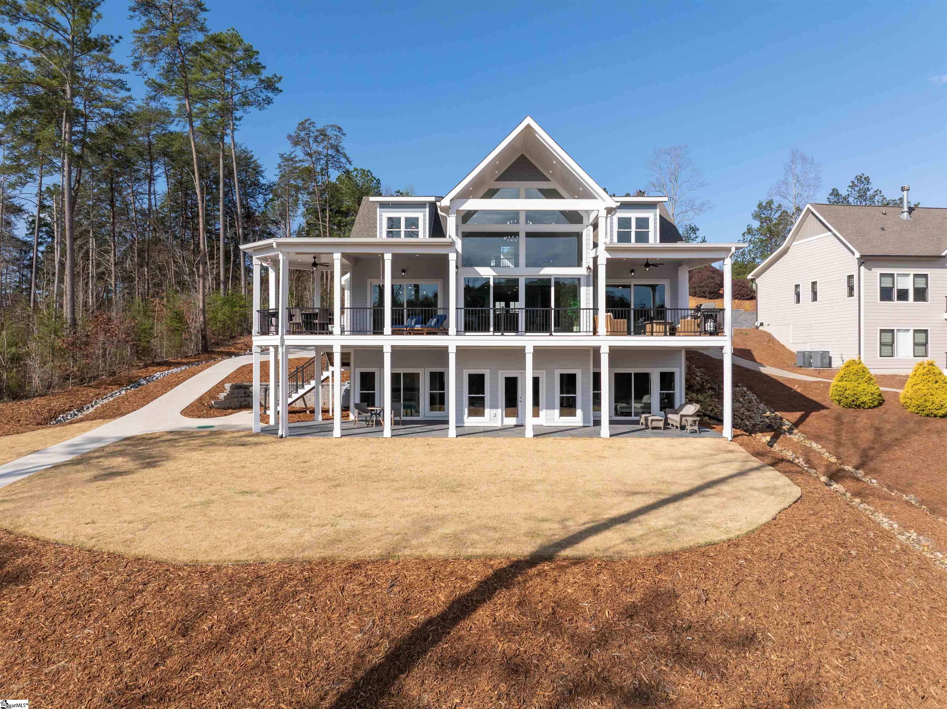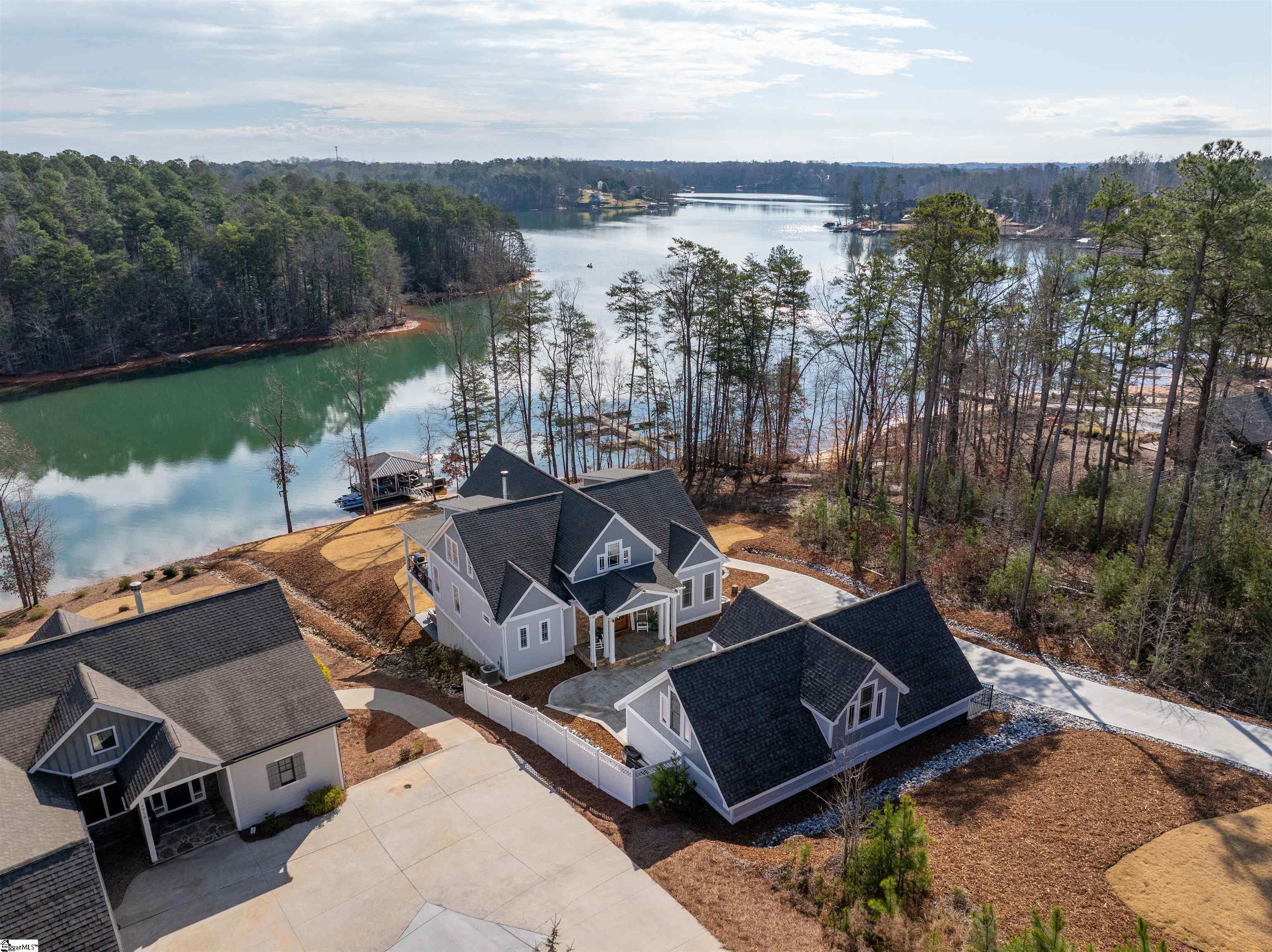 A stunning Lake Keowee waterfront home that is nothing short of exceptional. Five bedrooms, each with its own bath, plus a private office, home gym and a show stopper garage for the collector and hobbyist at heart. From an entertainment-friendly floor plan to its remarkable long-range sunrise water views, extraordinary modern lake living awaits at 9012 Reservoir Road. This ready-to-occupy Lake Keowee retreat reflects the ease and design of a brand new home while offering income producing capabilities. Three stories of windows flood the entire home with natural light, capturing the sparkle across the water throughout the day and the twinkle of the stars at night. A welcoming stone entry leads inside to a dramatic great room where soaring ceilings, a floor-to-ceiling stone wood-burning fireplace with gas starter, and expansive windows frame wide lake views that fill the space. Large sliding doors extend the living space outdoors to a covered lakeside porch spanning the entire lakeside of both the main and terrace levels. The open-concept design connects the great room, dining area, and chef’s kitchen, creating an easy flow for everyday living and entertaining. The kitchen features a farmhouse sink, smart refrigerator, and a gas cooktop with pot filler for gourmet meals. A spacious pantry provides excellent storage, while the large island is perfect for quick meals or gathering with friends. The primary suite is conveniently located on the main level and offers peaceful water views through floor to ceiling sliding doors that offer ease in access to the deck for seamless indoor-outdoor living. The ensuite bath is partitioned by a barn door and features a glass and tile shower with bench seating and an extended double vanity. A spacious walk-in closet provides ample storage adding to the suite’s comfort and functionality. An added benefit is the laundry room located just outside the suite for everyday convenience. The main level also features a dedicated office and second full bath for extended stay guests. The loft features an extended lake view up the channel offering a charming seating area that fares well as a hobby space, reading nook, or den. Lining both sides of the loft are two ensuite bedrooms, each with an eagle view of the water and individual large private baths. Large windows throughout the upstairs allow natural light to pour in, brightening the space and enhancing the spaciousness this home brings. The terrace level features a large recreation space. Whether watching a big game or enjoying happy hour, this is where the fun begins. No one feels slighted since each guest room features the same great lake views as the rest. The terrace level rec room is flanked with guest rooms three and four, each with a private full bath. This level also features a dedicated exercise room for private workouts or wellness routines. Outside, a stone tile laid covered porch allows guests to gather and relax in their own space. Take in open lake views with the ability for pets and guests to run, play, toss a frisbee, on a grassy terrace while enjoying the lakes surroundings. This style of backyard is not easy to find at the lake. A short walk leads to the covered double-slip dock with dual jet ski lifts and kayak racks. Enjoy water play with ease of access from the entire lakeside. As remarkable of a home as this is, the standout feature is the oversized three-plus car garage; featuring 10'x9' doors, 12' ceilings reinforced lifts, and a finished, climate-controlled apartment above with water and sewer capability. Whether you are looking for an amazing shop space or an independent in-law apartment, it's ready to go. Peninsula Pointe North ALLOWS SHORT TERM RENTALS. This remarkable property offers the ultimate in lakeside luxury and this floor plan is perfect for adult lake living. Don’t miss the opportunity to make this Lake Keowee waterfront retreat your own!