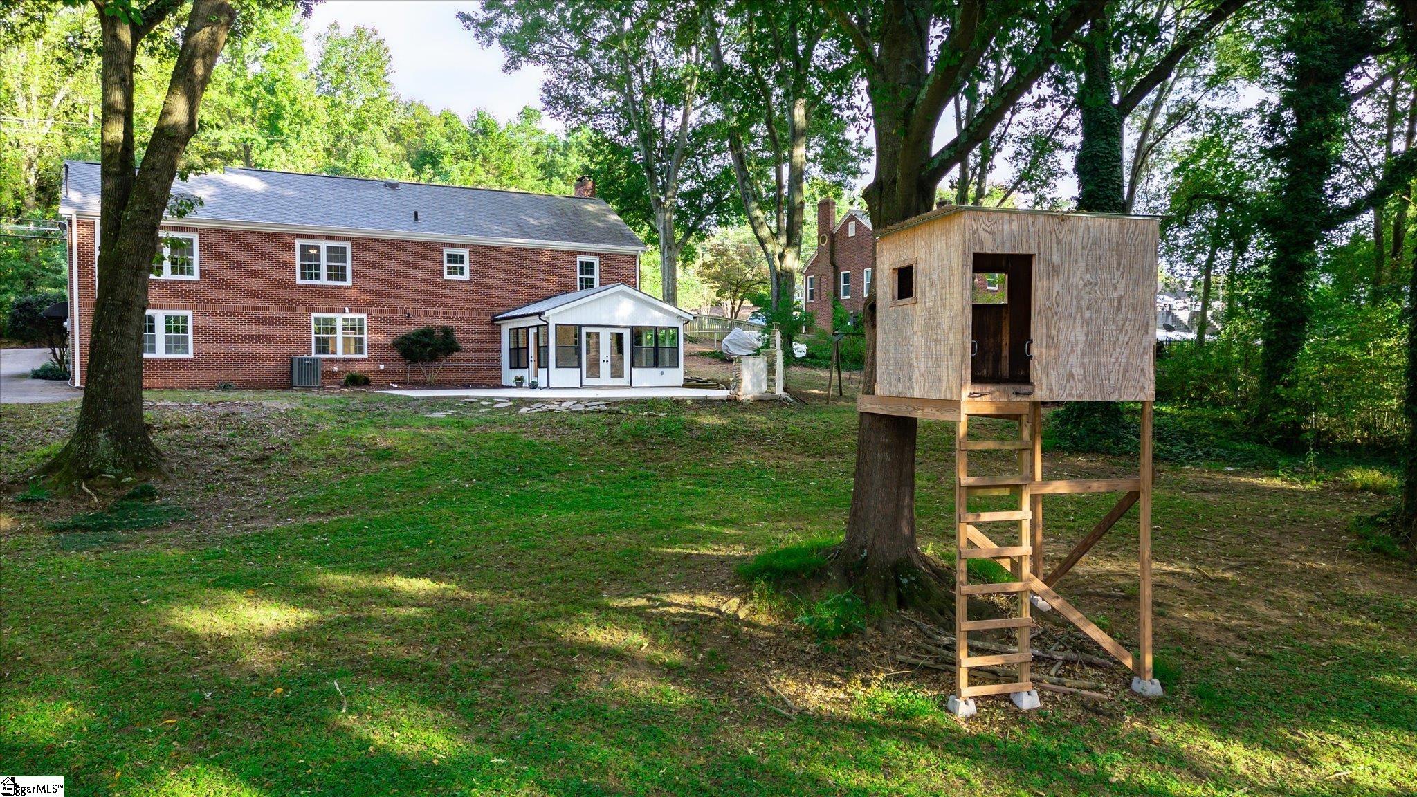 Welcome to this beautifully updated 1940s brick bungalow situated on a spacious 1 acre lot in the heart of Easley, SC. Brimming with character, this home offers unique livability like no other. Through the front gate, the deep front porch welcomes you to come on inside. Gleaming, original oak floors greet you at the front door and continue throughout the living room, dining room, hallway and three main-floor bedrooms. Just through the dining room you'll find a recently updated kitchen with quartz countertops and stainless steel appliances (all of which convey). The adjacent sunlit laundry room offers a secondary entrance to the main level and ample space to serve as a mud room. Down the hall, you'll find a fully renovated bathroom equipped with a dual marble vanity, subway tile shower surround and modern fixtures. Next, head upstairs to the newly finished attic space that features a loft area, charming dormer nook and bedroom space. Energy efficient closed-cell foam insulation and a dedicated mini-split system ensure year round comfort in this versatile area. Finally, the property also boasts a remarkable 1,300+ sq. ft. finished walkout basement that could easily function as a separate living space, complete with a spacious living room, dining area, full kitchen (with all appliances included), bathroom, and an office. You'll even find another laundry area tucked away in the back corner. This lower level includes a stunning 16x16 sunroom, added in 2023, complete with high-efficiency windows, a vaulted tongue-and-groove wood-clad ceiling, polished concrete floors, and a ceiling fan. French doors open to an expansive backyard, which features a large patio, a custom stone fireplace, a treehouse (with remote-controlled solar lighting!), and a dog run with shelter - not to mention plenty of space to toss a ball around! Located a stone's thrown from downtown Easley, this home offers easy access to shops and restaurants, The Silos and the Doodle Trail. Additionally, you're just 20 minutes from downtown Greenville, SC, 25 minutes from Table Rock State Park and 30 minutes from Lake Keowee! Schedule a showing today and discover all the possibilities this home has to offer!