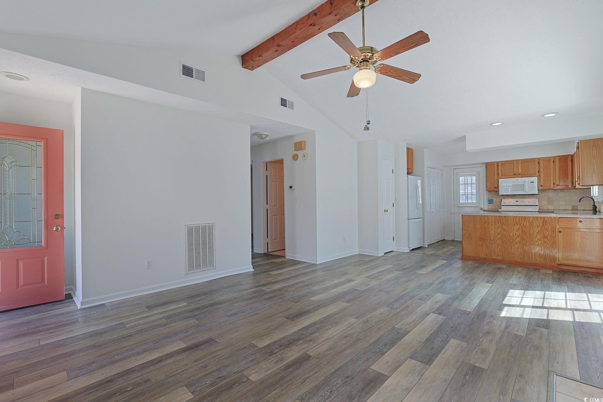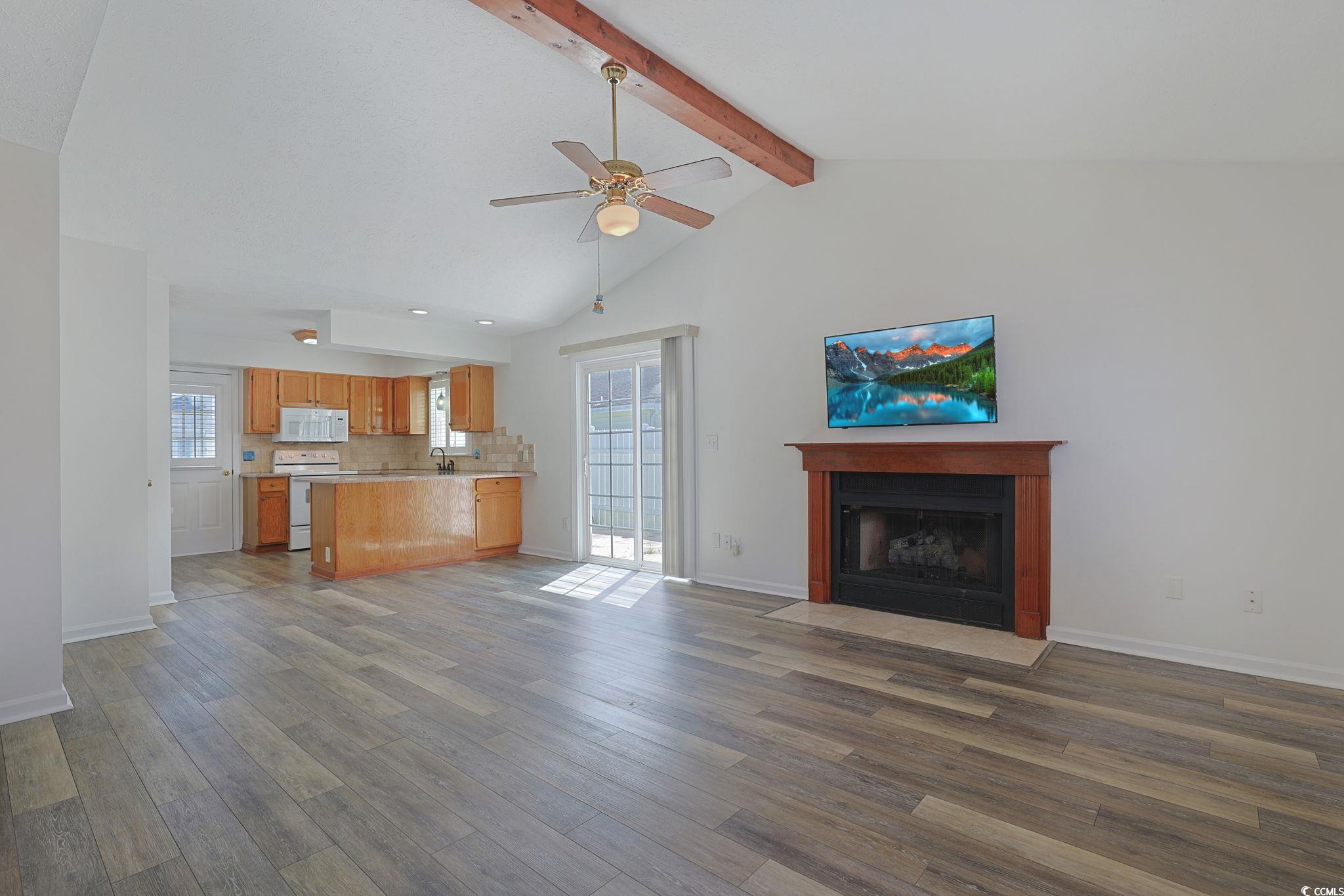 Introducing this adorable 2 bedroom 2 bath home situated in the middle of everything North Myrtle Beach has to offer. Just a four minute golf cart ride to the beach or a two minute golf cart ride to Main Street. What a great find for a second home or your forever home that features laminated wood & tile flooring, plantation shutters, a comfortable living/dining room combo with a vaulted ceiling & gas fireplace that showcases a sliding glass door that opens up to the relaxing privacy fenced patio. The family friendly kitchen is equipped with a white on white appliance package, granite counter tops, tile back splash, a practical double bi-fold door laundry closet, along with ample kitchen cabinet spaces. The primary bedroom offers a ceiling fan, a walk-in closet, private access to the primary bath hosting a stand alone vanity with a single sink, a comfort station, and deluxe step-in shower. This piece of paradise is completed with an additional bedroom, full guest bath, and a concrete parking pad. This home affords you easy access to the beach and golfing along with all of the other activities and happenings in North Myrtle Beach & Myrtle Beach including fun eateries, award winning off-Broadway shows, public fishing piers, and intriguing shopping adventures along the Grand Strand. Conveniently located to your everyday needs, including grocery stores, banks, post offices, medical centers, doctors’ offices, and pharmacies. Check out our state of the art 3-D Virtual Tour. Some photos are virtually staged.