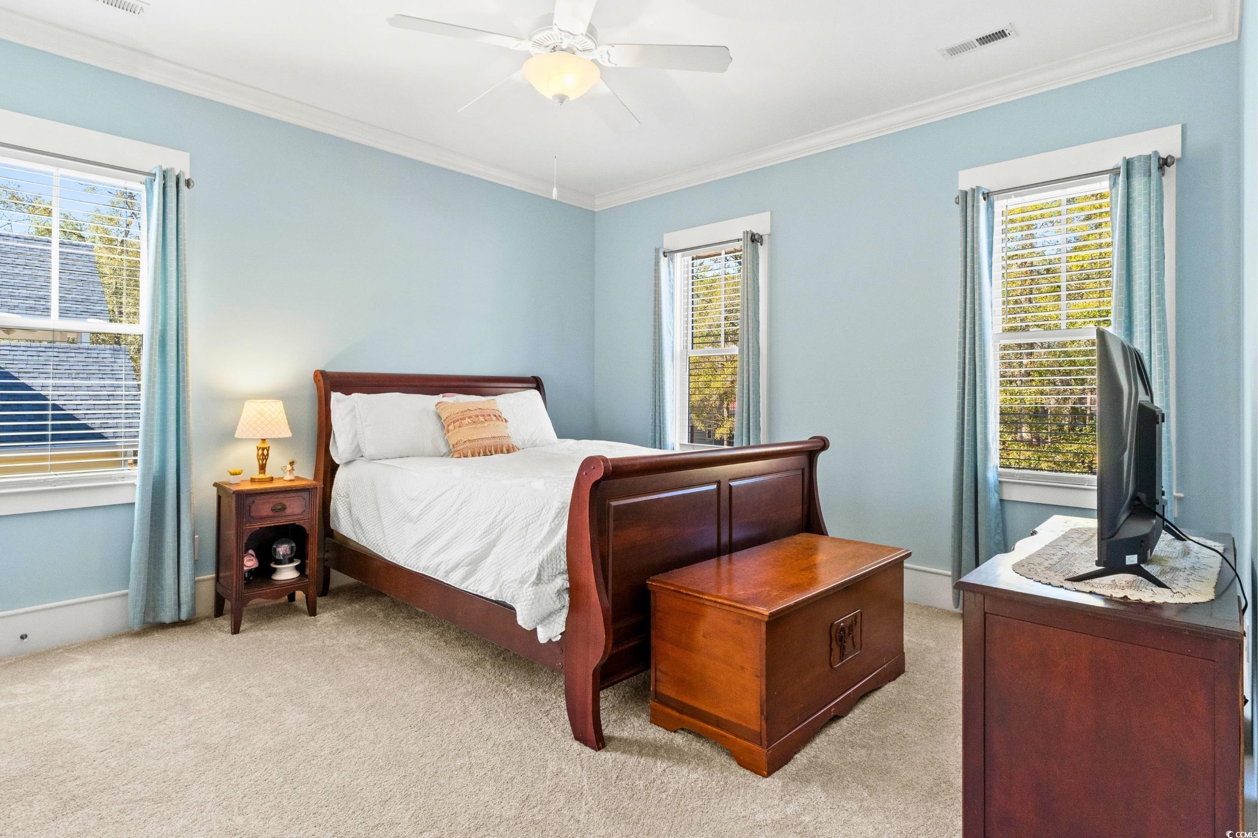 Welcome to this stunning custom-built home by renowned local builder Whitney Blair, offering timeless elegance and modern luxury in one of Calabash's most sought-after communities. Built in 2012, this 4-bedroom, 3.5-bathroom home is designed with meticulous attention to detail, featuring high-end finishes and thoughtful upgrades throughout. Step inside to discover a spacious layout adorned with custom craftsman molding, tall baseboards, crown molding, and beautiful wainscotting on the lower level. The main living area boasts a coffered ceiling, a gas fireplace with a custom granite hearth, built-in shelving, and a mantle with exquisite trim. Large windows flood the home with natural light, complemented by custom roman shade window treatments. The gourmet kitchen is a chef's dream, featuring solid maple cabinets, granite countertops, stainless steel appliances, and ample storage. Retreat to the luxurious primary suite, where a huge walk-in shower awaits with multiple shower heads, built-in benches, and custom tiling. Each bedroom offers generous walk-in closets, while the bathrooms showcase custom tile accents and granite countertops. Outside, the home's charm continues with a large front porch featuring a classic 'Haint' blue ceiling, perfect for welcoming guests. The rear of the home offers a private oasis, including a fully screened porch, a custom stone patio, and an outdoor shower - ideal for relaxing or entertaining. The 2-car rear-access garage, with custom workbenches and attic storage, maintains the home's clean street presence. Living in Devaun Park means enjoying a vibrant community with walking trails along the Calabash Riverwalk, a clubhouse with a pool, a workout room, and a meeting room with a kitchen. This classic traditional-style home combines elegance, functionality, and a prime location - truly a must-see. Experience the perfect blend of sophistication and comfort in this exquisite Calabash home.