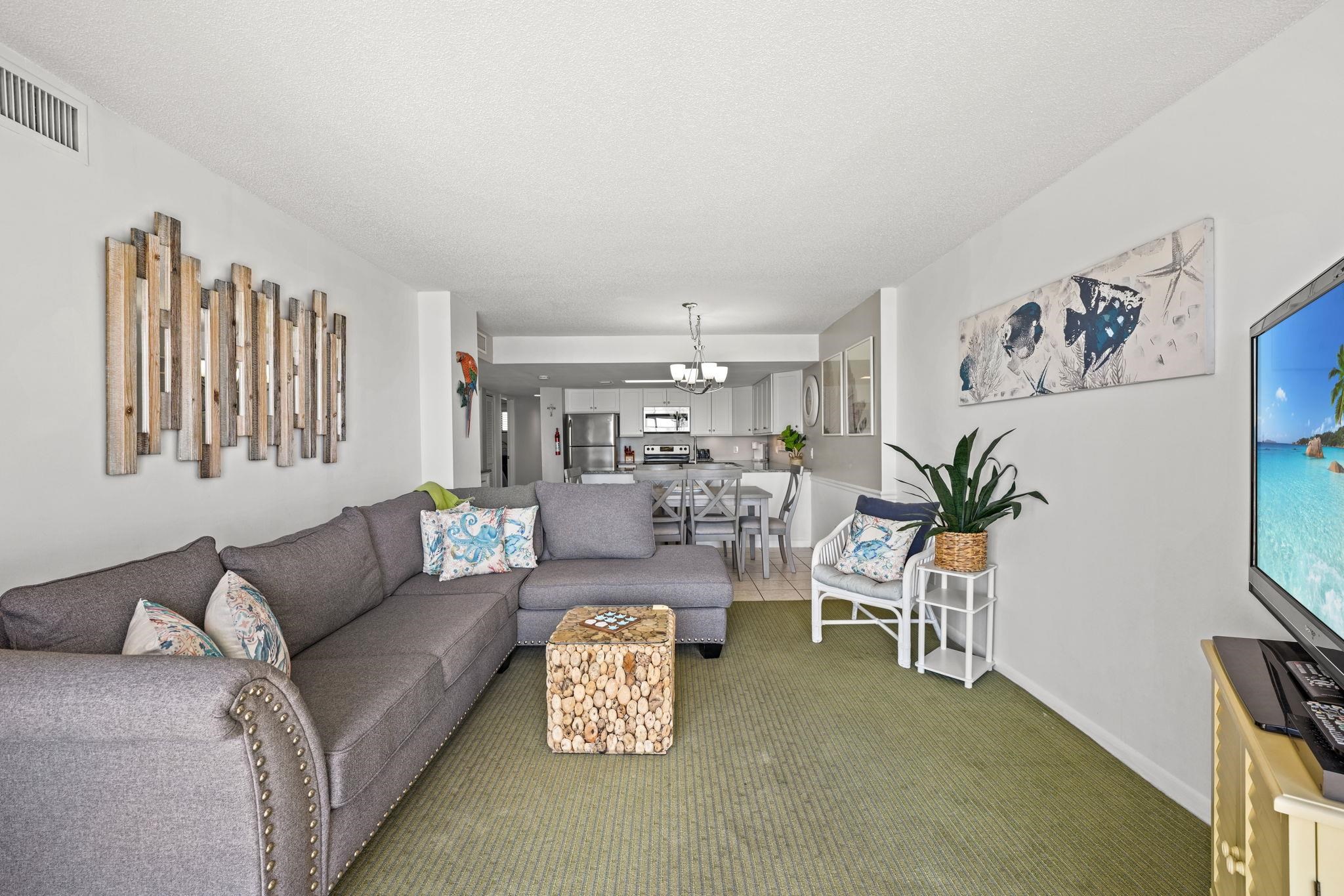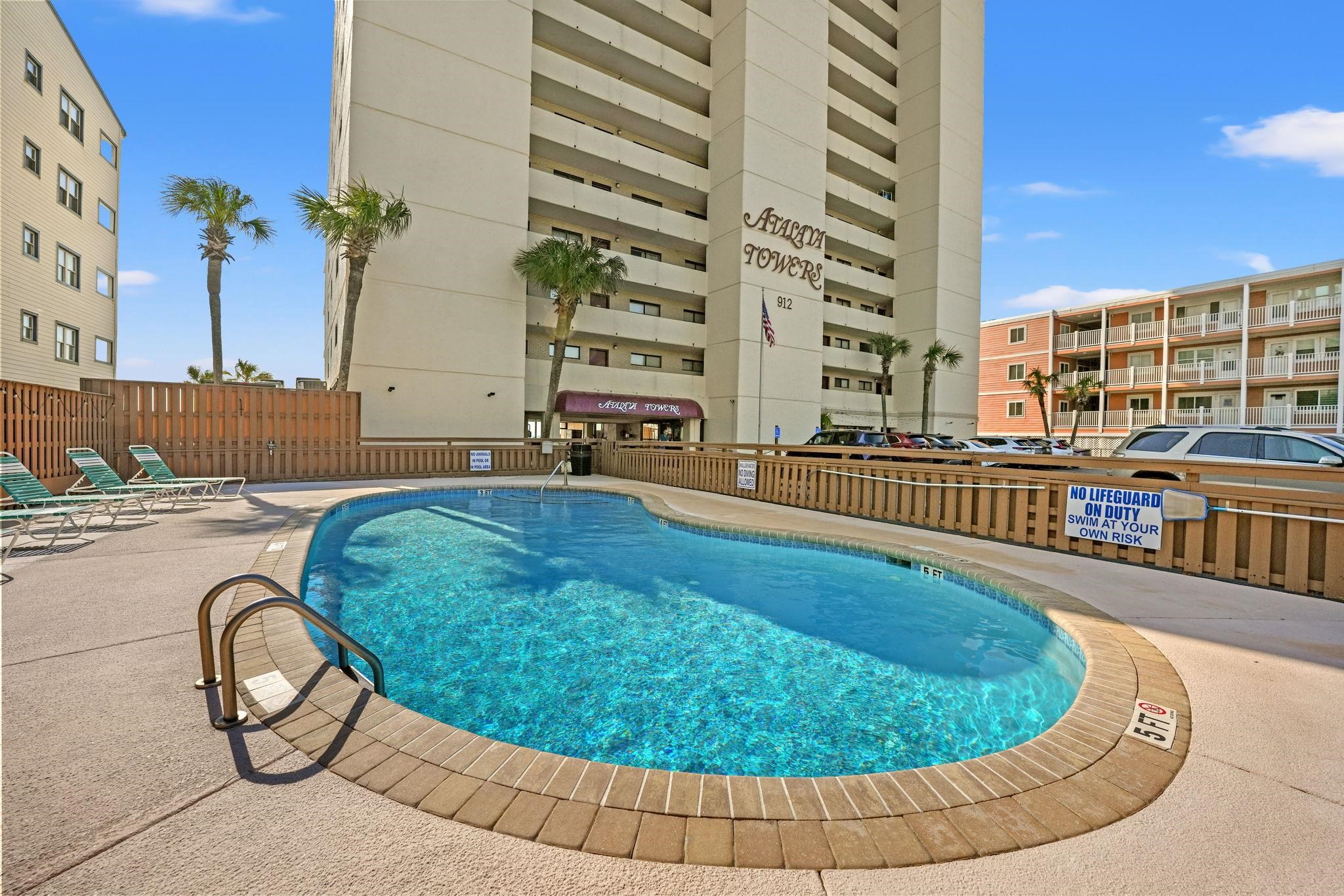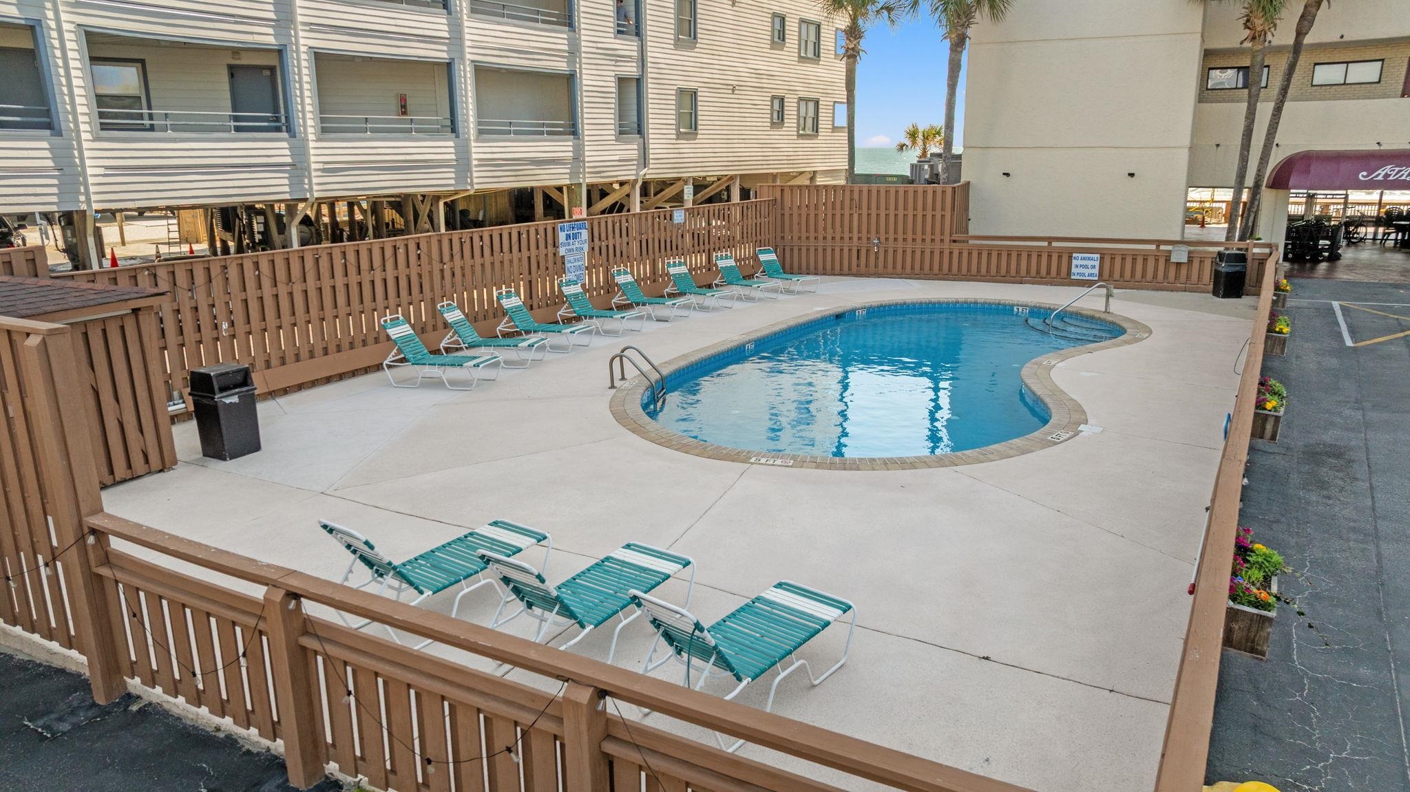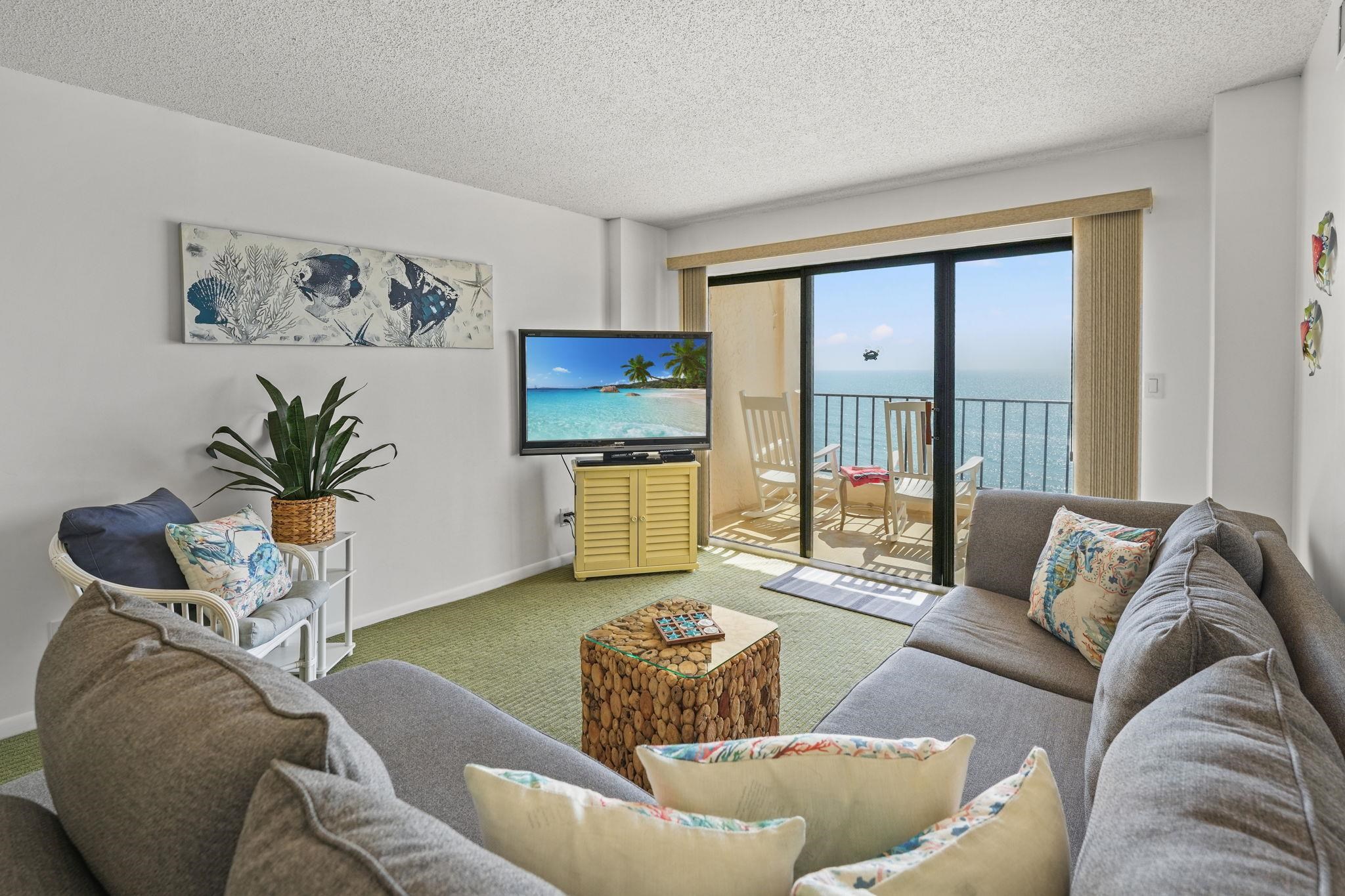 Welcome to Atalaya Towers! Enjoy waking up to Amazing oceanfront breezes every morning in this stunning 3 BR, 2 Ba unit updated with soothing coastal colors throughout. This well-maintained 9h floor unit comes furnished. Beautiful gray granite counters adorn the well stocked kitchen. The kitchen sink looks out to the ocean with an added matching gray granite bar off to the side lending itself to additional serving space with storage cabinets below. Parking lot is outside the building, as well as the lot directly across the street. This unit's kitchen features Stainless steel appliances. A stacked washer and dryer in the front foyer. The Primary bedroom is a tranquil retreat with its generous size, and sliding glass doors opening to the balcony and a private en-suite bathroom. The Primary bedroom has 2 separate closets, one of which is an extra-large walk-in closet with a lock and plenty of storage space. The living room boasts wonderful natural light that flows throughout and creates a welcoming ambiance for entertaining. The dining area offers options- a table with seating for 6 or stools under the kitchen counter. 2 Guest rooms down the hall share a hall bathroom. For flooring you'll find LVP and carpet. Atalaya Towers offers an array of amenities including both an indoor pool and hot tub, and outdoor pool, sun decks, and eating areas both inside and out. Just blocks north of the Garden City Pier, Atalaya Towers offers an array of dining options, shopping, and golf courses. It's close to the airport, Hospital, medical center, post office, Brookgreen Gardens, endless entertainment and activities. Perfect for a primary home, vacation home, or luxury short term rental property.