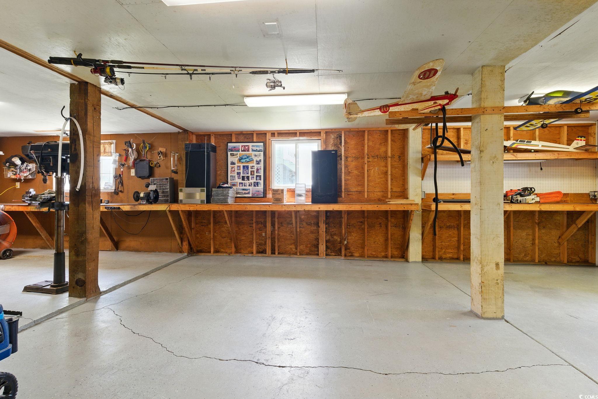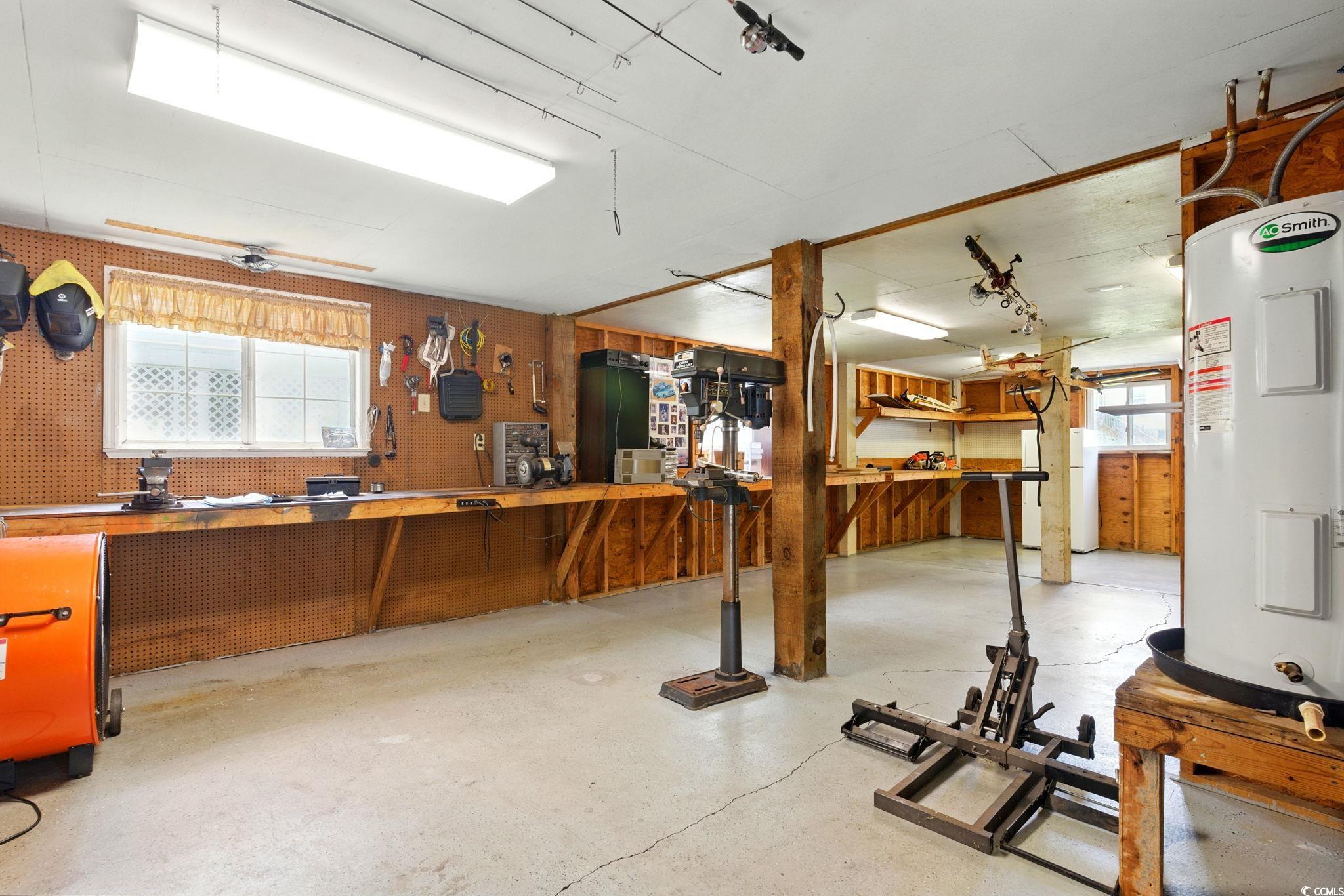 Don't miss your chance to live in this quiet, secluded neighborhood east of Highway 17!!! Seller is highly motivated!!! The home is well maintained and is waiting for your personal cosmetic upgrades to make it your own slice of coastal paradise. It's just a short golf cart ride to the beach. The community offers great amenities which include pool, club house, catch and release pond with fountain, shuffleboard, pickleball and tennis courts and a playground. This home offers an oversized workshop complete with built in work benches and garage door. The workshop is approximately 800 square feet. There is also a separate storage room that is great for all of your beach chairs and accessories!!! The interior has vaulted ceilings and tons of natural light. The primary suite offers a large walk-in closet. The home also has a spacious laundry room located conveniently at the side entrance which is perfect for sandy beach clothing. The second bath is just across the hall from the laundry room making beach cleanups a breeze. The living area has an enclosed wet bar that is perfect for entertaining. The home is located on a quiet cul-de-sac and centrally located near shopping, dining and many activities that the Grand Strand has to offer! Square footage is approximate and must be verified by the buyers.