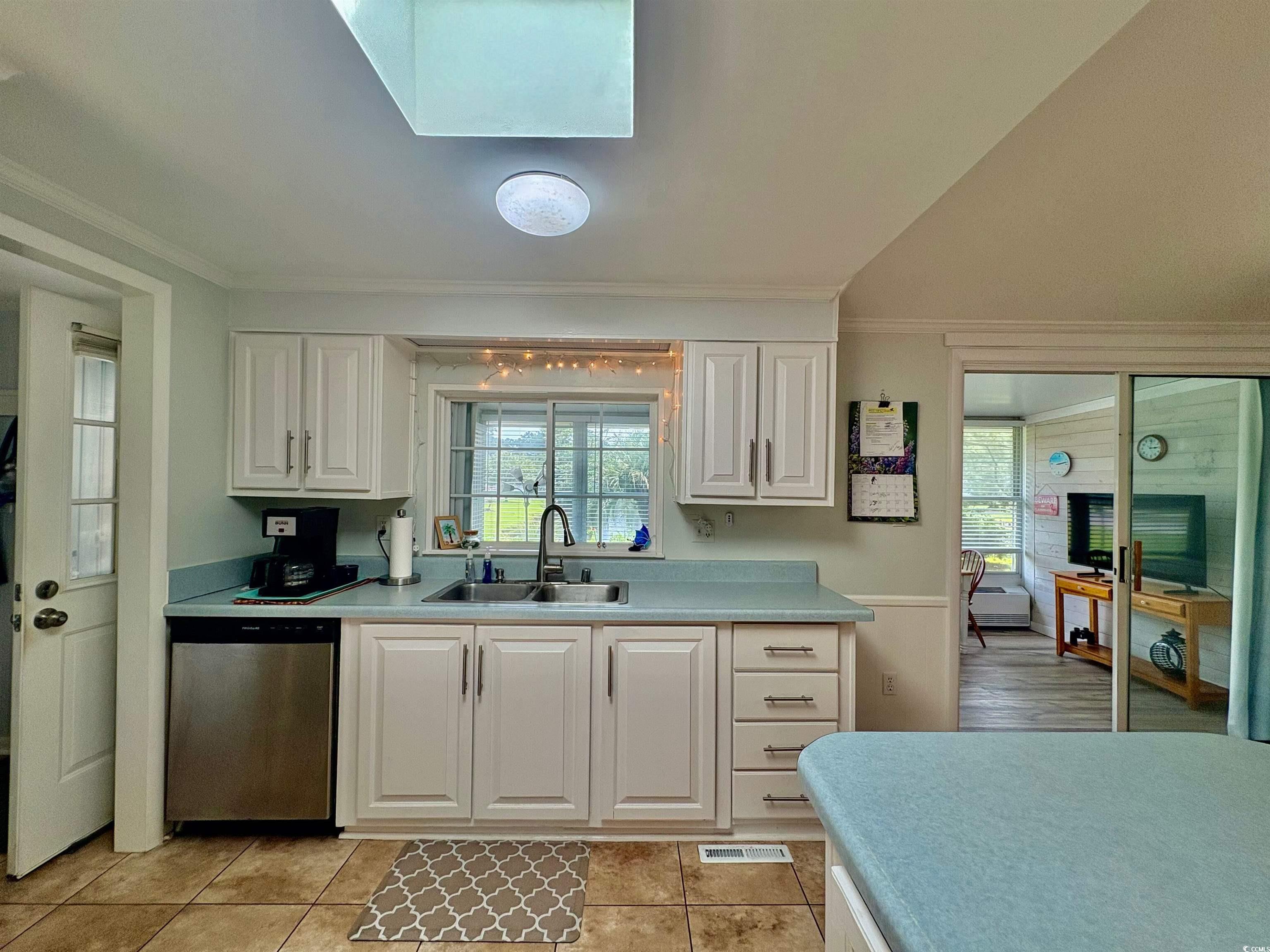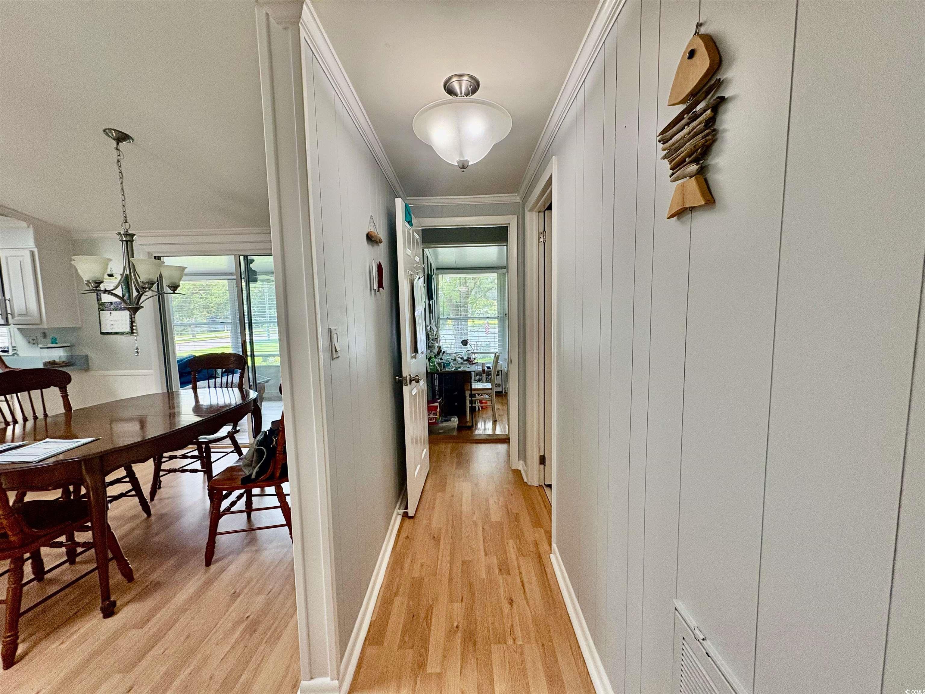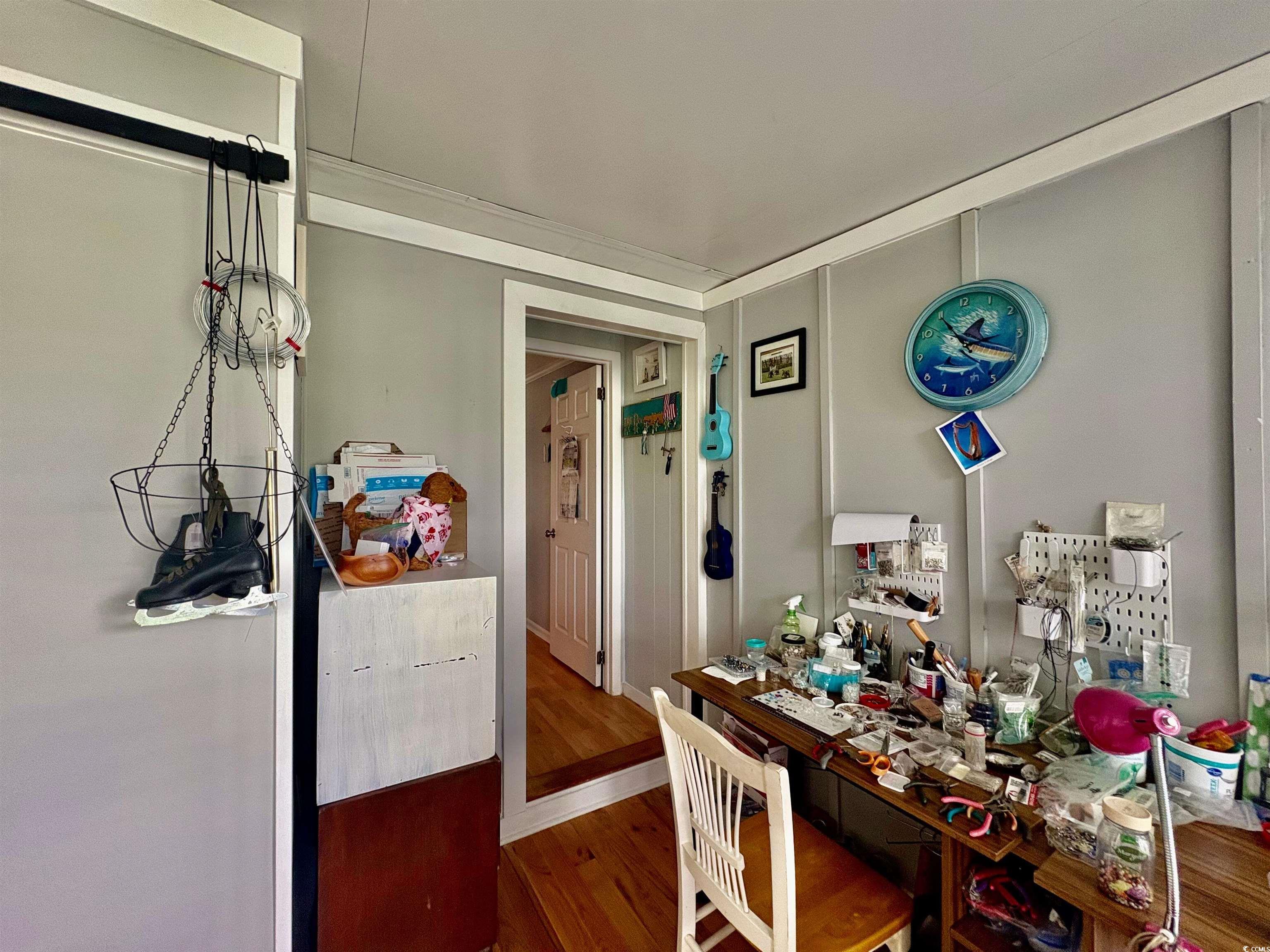 Welcome to Ocean Pines, a sought-after 55+ coastal community in Garden City, SC. Just a short golf cart ride to the Garden City Pier and beach, this hidden gem offers mature landscaping, scenic ponds, tranquil waterways, a fitness center, two outdoor pools, and two clubhouses. This beautiful home features 3 bedrooms and 2 bathrooms, with a desirable split floor plan, fresh LVP flooring (2024), skylights that fill the kitchen, dining room, and primary bath with natural light, and smooth ceilings with drywall throughout. Enjoy charming details like beadboard in both bathrooms and chair rail accents in the living and dining areas. Relax in the spacious Carolina Room or on the covered porch while taking in stunning pond views with a fountain and your own private dock with seating. Additional highlights include a brand-new roof (2025), large driveway with carport, and an outdoor shed perfect for storing bikes, beach gear, and garden tools. Don’t miss this rare chance to embrace the coastal lifestyle—now is the perfect time to make your move to the beach!