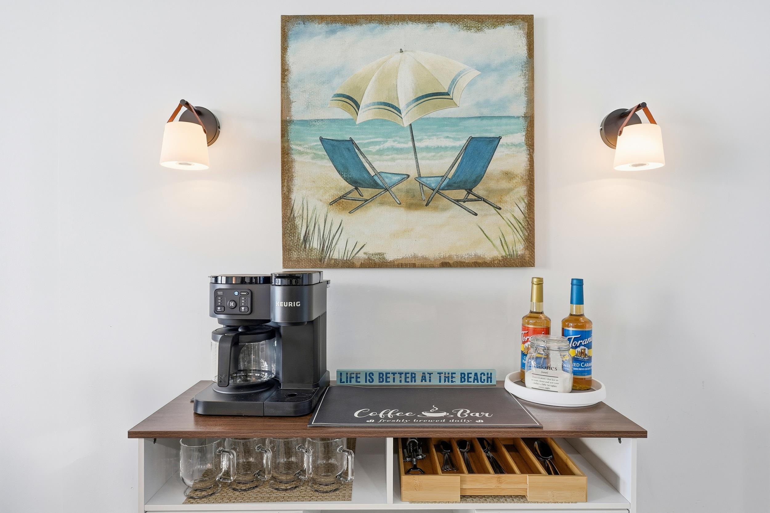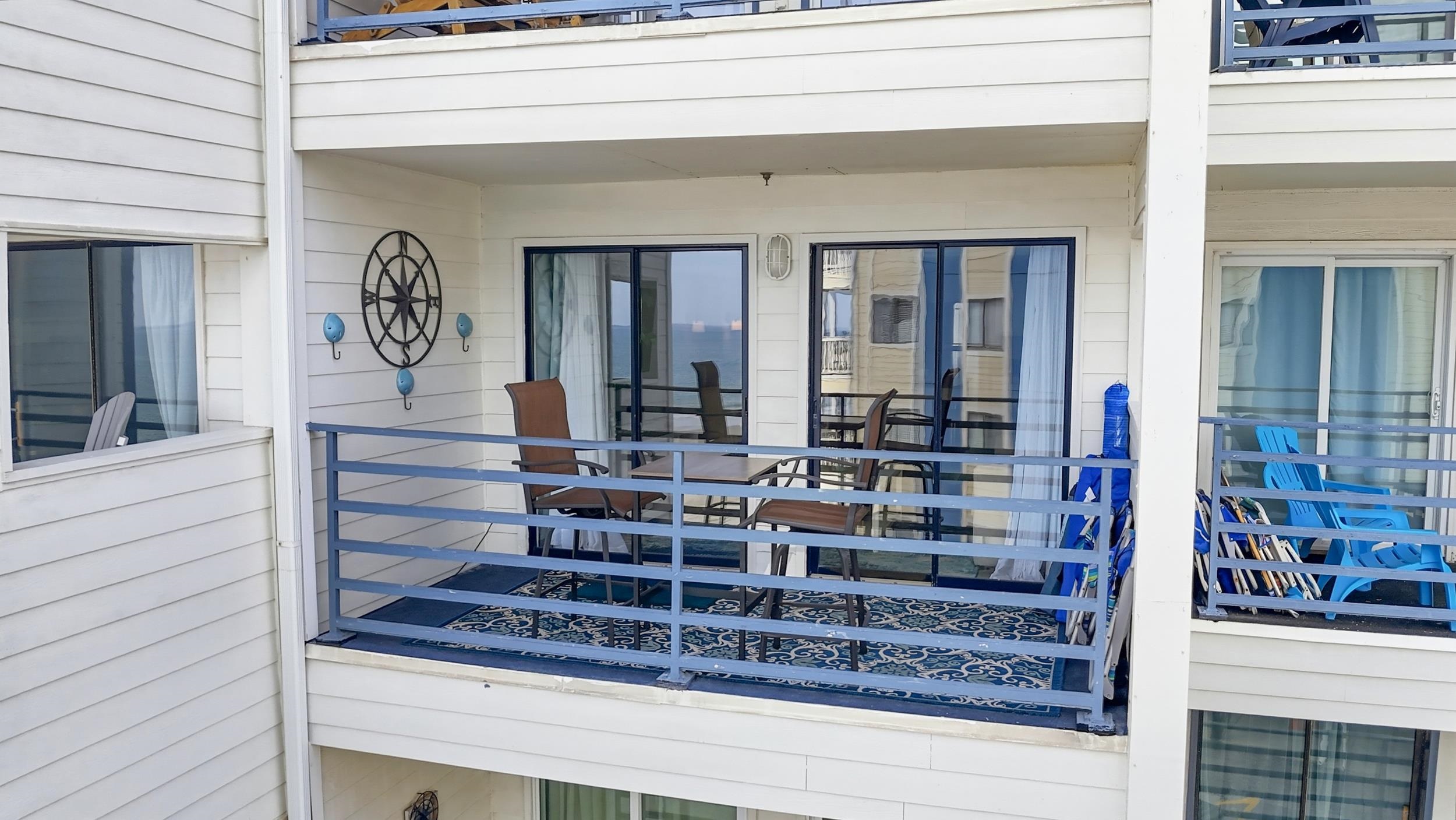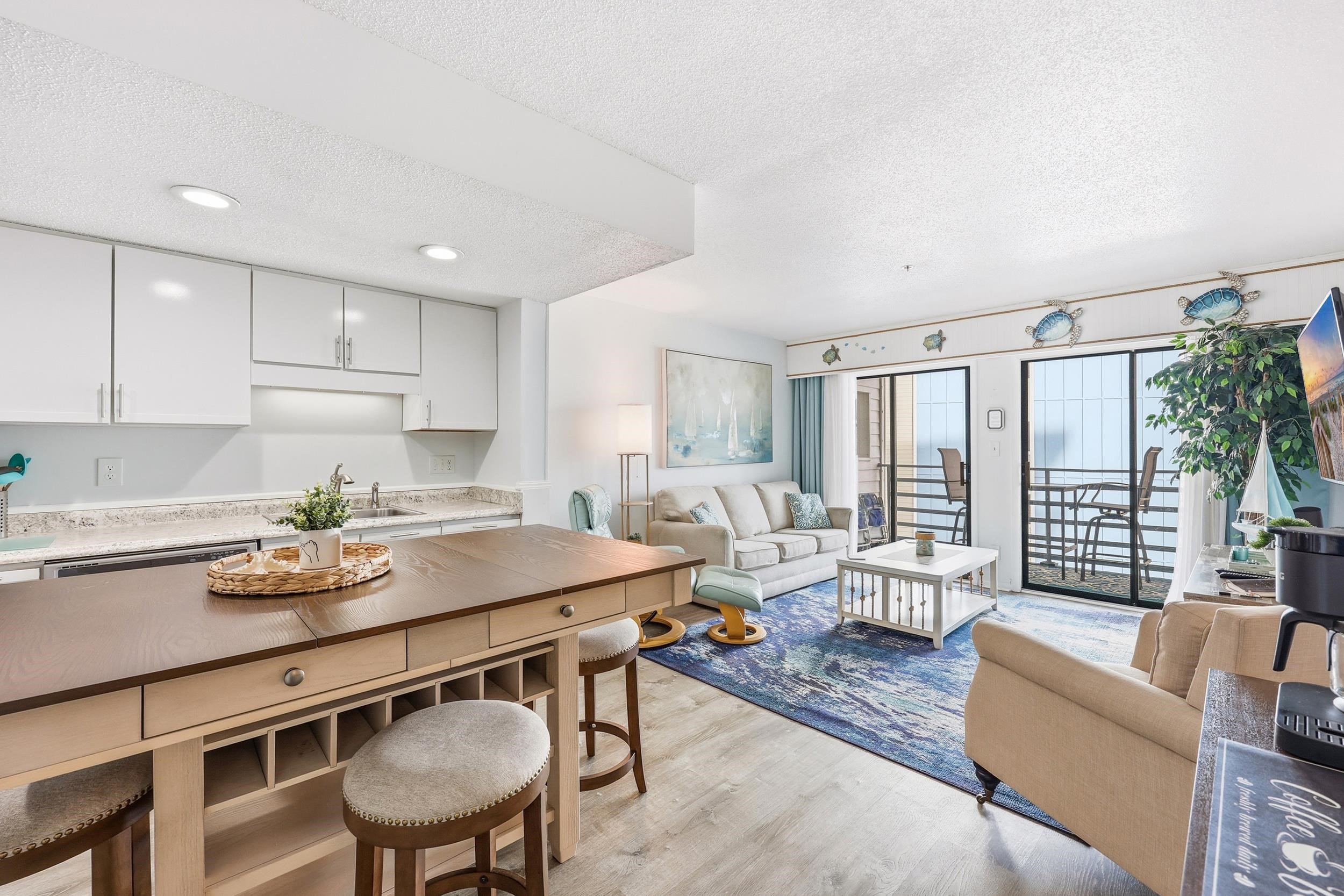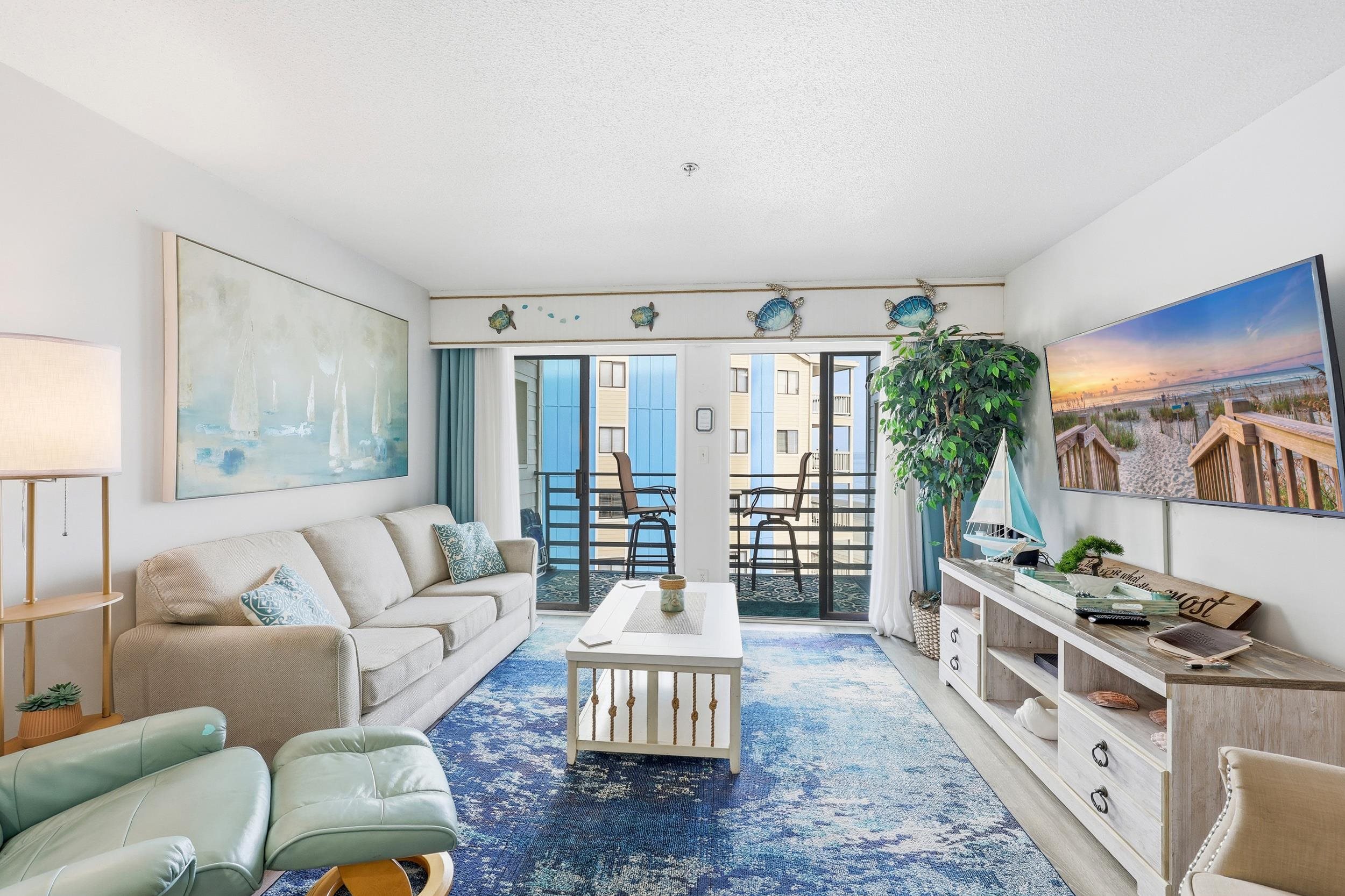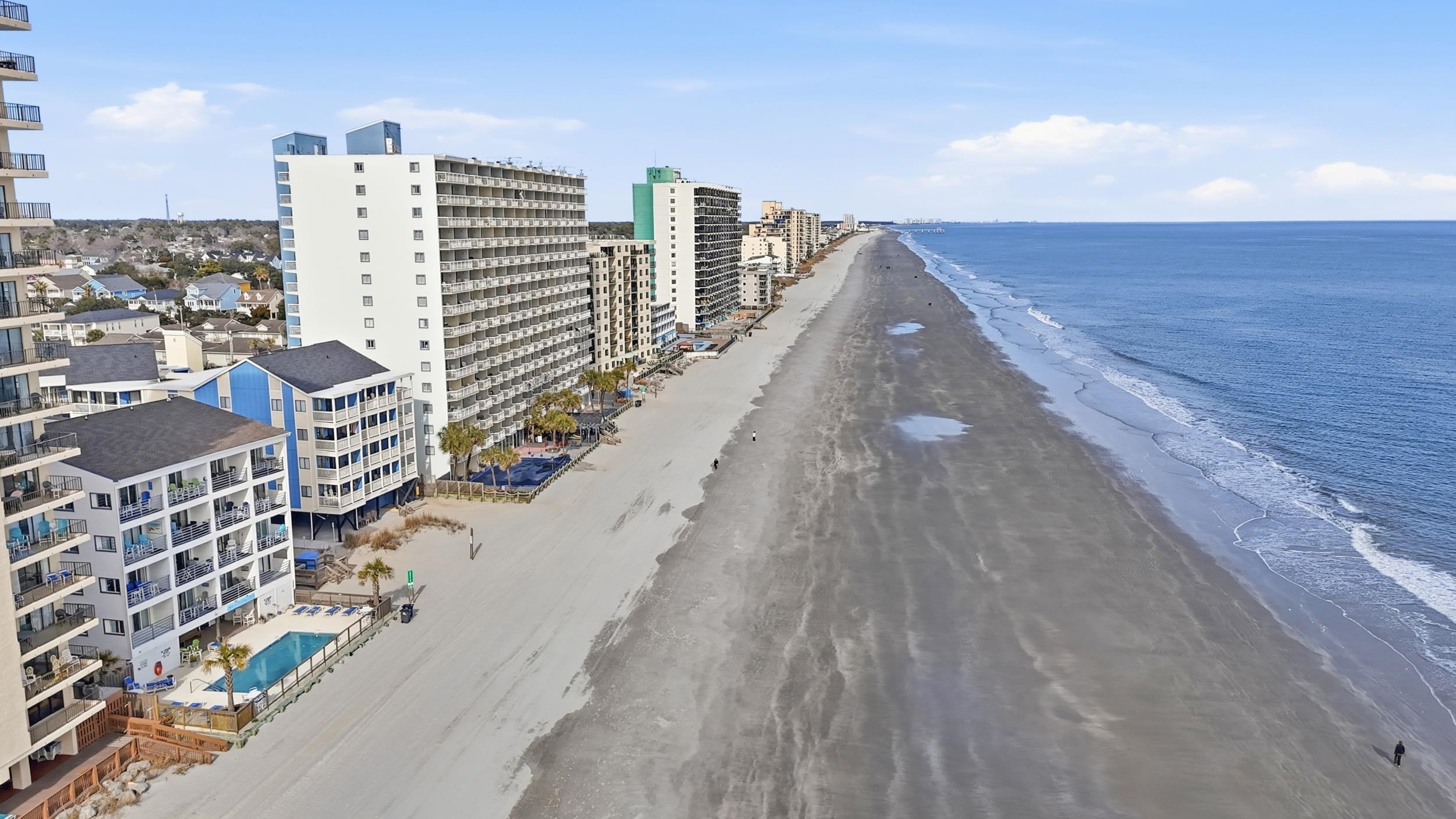 This charming, fully furnished 1-bedroom, 1-bathroom oceanfront condo complex offers comfortable open living space with direct beach access and stunning Atlantic Ocean views. Located in the highly desirable Carolina Shores, it's perfect for proven vacation rentals, second home, or year-round coastal living. Prime Oceanfront Location – Private balcony overlooking a deep sandy Garden City Beach & Ocean views. Approximately 1/2 mile to Garden City Pier and 1.5 Miles to Surfside Pier. Enjoy sunrise/moonrise views over the ocean from the spacious covered balcony with seating for relaxing or dining. Open-Concept Living Area – Fully furnished, bright and airy living room with comfortable queen sleeper sofa, recliner/rocker, large flat-screen TV, and coastal decor. Seamless flow to the balcony through double sliding glass doors. Fully Equipped Kitchen – white cabinetry, stainless steel appliances (refrigerator, oven/range, microwave, dishwasher), breakfast bar/island seating for 4. Spacious Bedroom – Queen bed, additional TV, ample closet space, and serene beach-themed bedding and accents. Updated Bathroom – Tub/shower combo with modern fixtures and plenty of storage. Building Amenities – Direct oceanfront pool with loungers, grilling/picnic area under the building, and direct beach access via stairs or elevator. Full-size washers and dryers in a dedicated complex laundry room. The condo features a relaxed coastal vibe with soft blues, whites, and nautical touches throughout – ideal for beach lovers seeking a turnkey retreat. This property is ready for immediate enjoyment or with a proven rental income history in one of the Grand Strand's most sought-after beach communities with a well run and funded HOA.