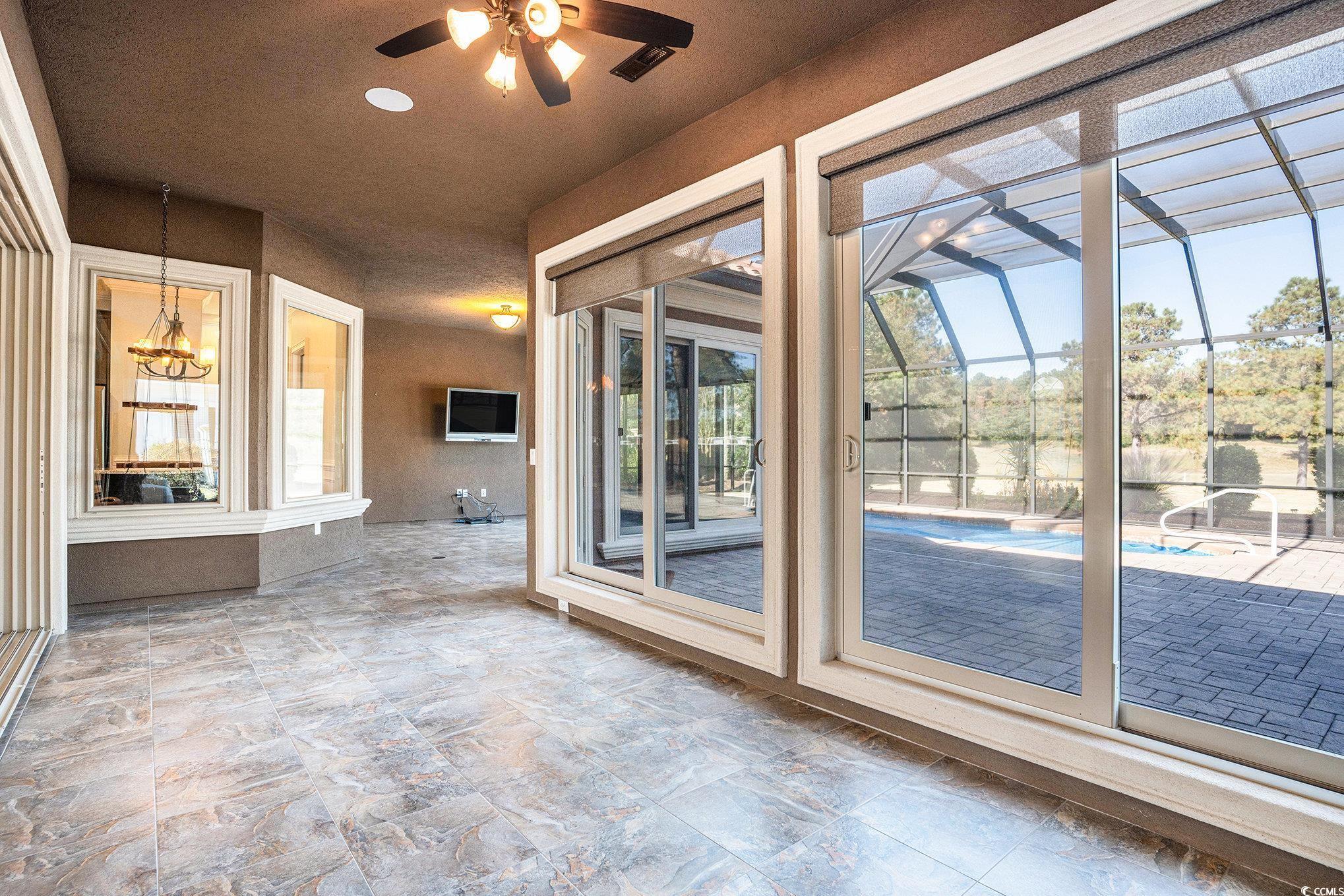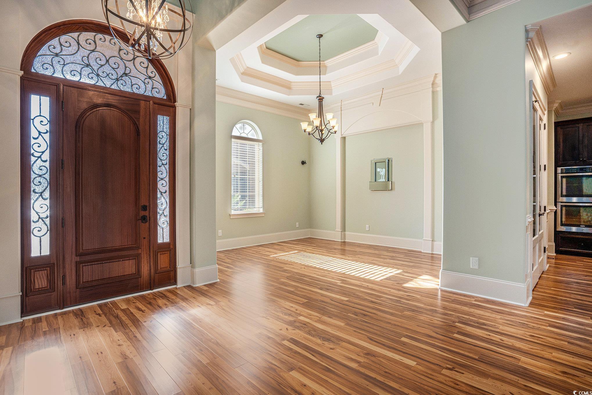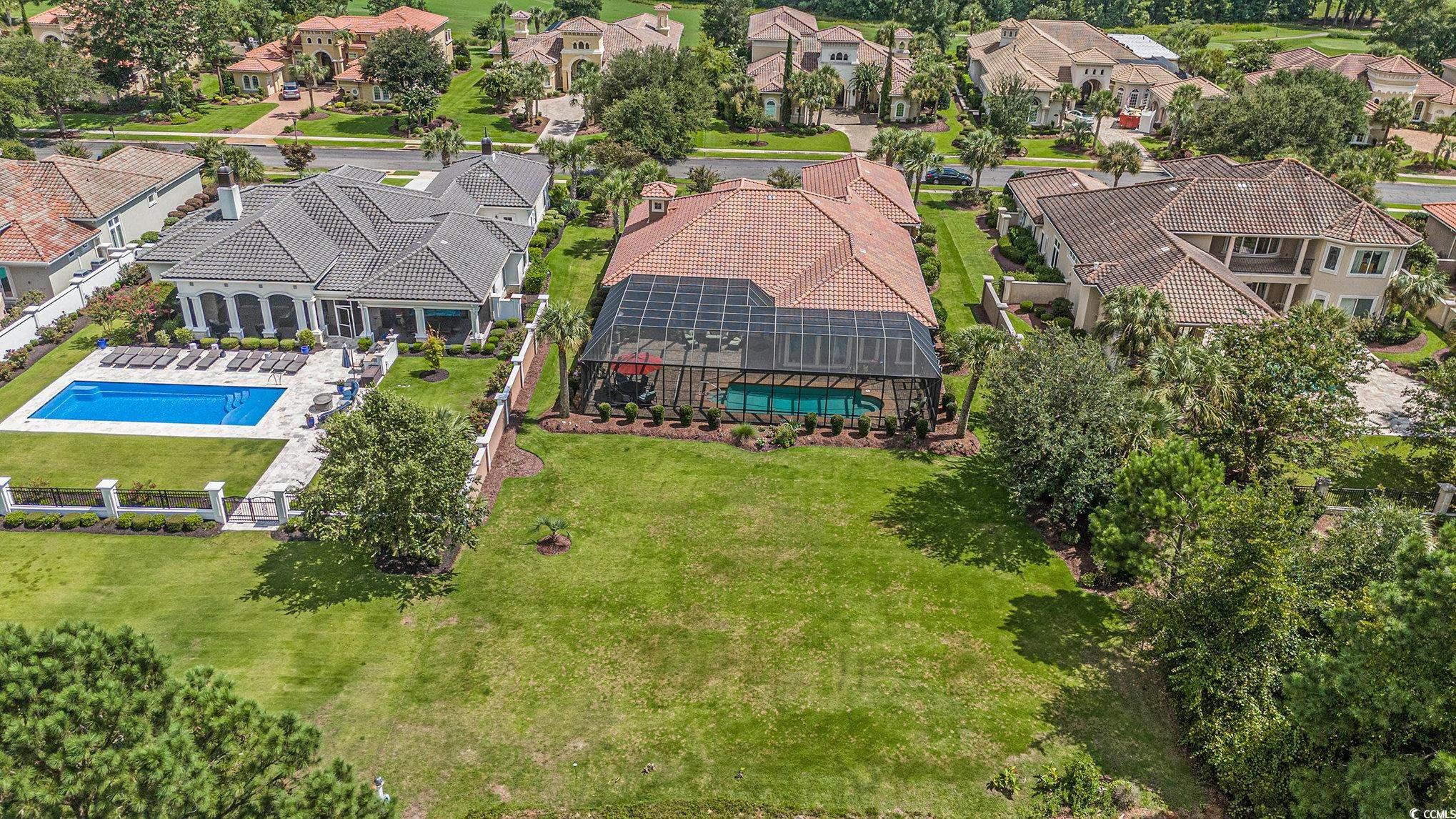 Driving through the private, gated community of Grande Dunes, you arrive at Bellasera Circle, a sought-after enclave known for its luxury homes and lush landscapes. The home’s Mediterranean-inspired architecture, with its barrel tile roof, stone-accented entry, and lush palm-lined landscaping, immediately sets the tone for elegance. The paver driveway leads you to an arched stone entrance with a wood-stained door entry door that speaks elegance, creating a grand first impression along with the 3 car garage. Stepping inside, you’re greeted by soaring tray ceilings, detailed crown molding, and warm hardwood floors that flow seamlessly throughout the main living areas. The formal living room welcomes you with abundant natural light and a stylish chandelier, perfect for entertaining guests. Moving forward, the spacious great room becomes the heart of the home. A stacked-stone fireplace flanked by custom built-ins anchors the space, while a triple tray ceiling with soft accent lighting adds depth and character. Expansive sliding glass doors open to a sprawling screened lanai, seamlessly blending indoor and outdoor living. The gourmet kitchen offers rich wood cabinetry, beautiful countertops, and an oversized center island with seating which is perfect for those quick meals. Pendant lighting highlights the island, and a double oven and stainless-steel appliances make it a chef’s dream. An adjoining breakfast nook enjoys views of the lanai and pool. On one side of the home, the owner’s suite provides a private retreat with tray ceilings, cool coastal colors creating the perfect relaxing atmosphere. The ensuite bathroom features dual vanities, a whirlpool tub, and a walk-through tiled shower with dual showerheads and a rain showerhead as well. The expansive walk-in closet is what dreams are made of, with a ladder to even reach the very top! Three additional guest bedrooms each offer generous space, and access to beautifully finished full bathrooms. A well-appointed large laundry room with built-in storage and a utility sink add to the home’s functionality. Upstairs above the garage is a spacious 289 sq. ft. room offers endless possibilities—perfect for a home office, media room, gym, or hobby space. With the simple addition of one duct, it can be fully heated and cooled to suit your needs year-round. Step outside to the show-stopping screened lanai, where a sparkling pool takes center stage. With multiple sitting areas, a dining space, and panoramic views of the golf course, it’s the perfect backdrop for both quiet mornings and lively gatherings. This home also includes a spacious three-car garage and the exceptional lifestyle amenities of Grande Dunes—private beach access at Ocean club and oceanfront pools. Cruise your way to the Members Club or the Ocean Club IN MINUTES! This prime location in Grande Dunes offers the perfect blend of privacy and convenience, just minutes from Myrtle Beach’s pristine beaches, world-class golf courses, shopping, dining, entertainment, and popular attractions along the Grand Strand. Whether you’re seeking a day on the sand, a night out, or a round of golf, everything is right at your doorstep. Buyer is responsible for verification.