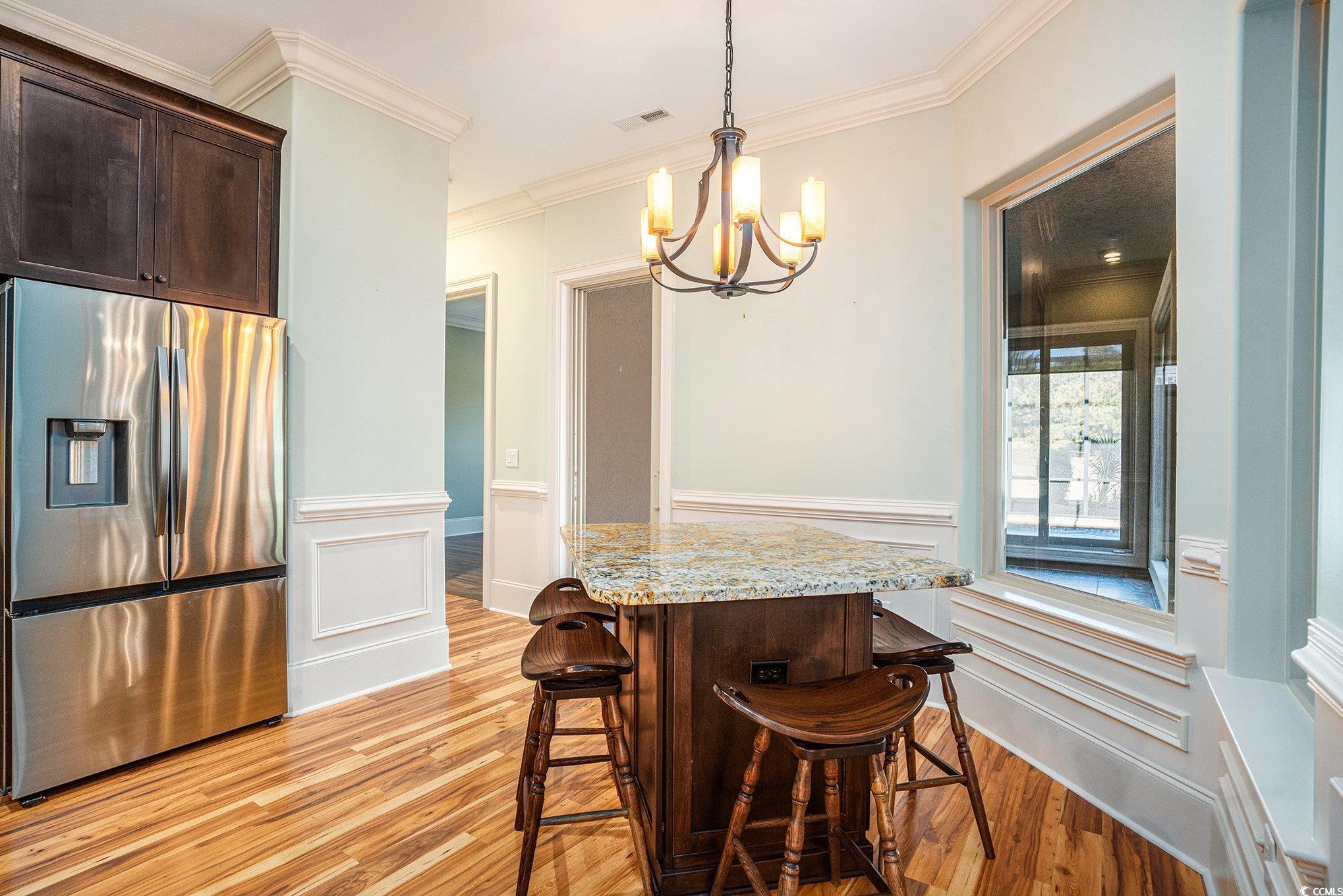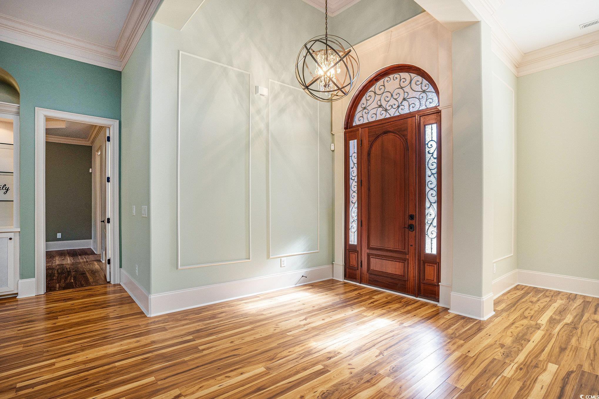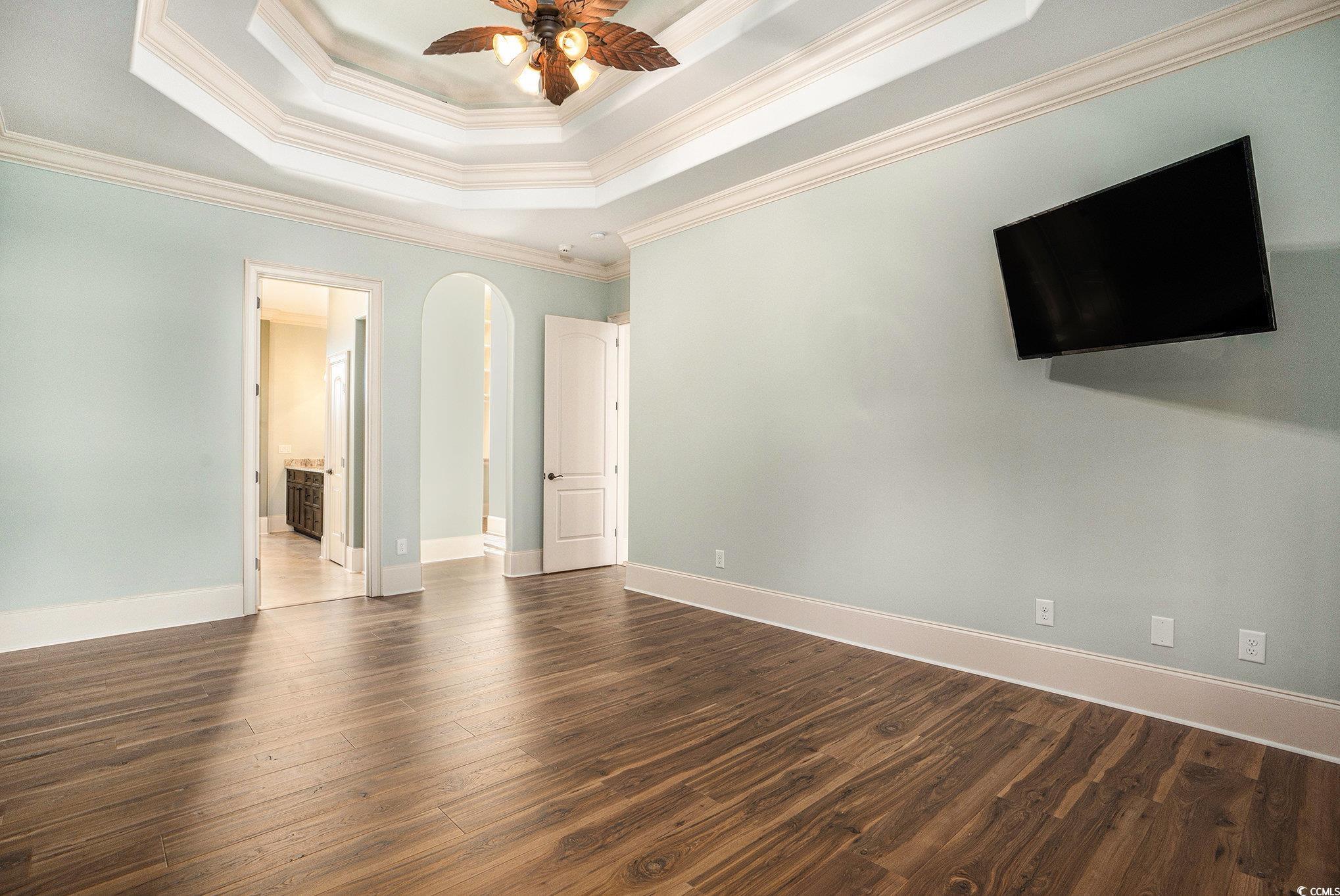 Driving through the private, gated community of Grande Dunes, you arrive at Bellasera Circle, a sought-after enclave known for its luxury homes and lush landscapes. The home’s Mediterranean-inspired architecture, with its barrel tile roof, stone-accented entry, and lush palm-lined landscaping, immediately sets the tone for elegance. The paver driveway leads you to an arched stone entrance with a wood-stained door entry door that speaks elegance, creating a grand first impression along with the 3 car garage. Stepping inside, you’re greeted by soaring tray ceilings, detailed crown molding, and warm hardwood floors that flow seamlessly throughout the main living areas. The formal living room welcomes you with abundant natural light and a stylish chandelier, perfect for entertaining guests. Moving forward, the spacious great room becomes the heart of the home. A stacked-stone fireplace flanked by custom built-ins anchors the space, while a triple tray ceiling with soft accent lighting adds depth and character. Expansive sliding glass doors open to a sprawling screened lanai, seamlessly blending indoor and outdoor living. The gourmet kitchen offers rich wood cabinetry, beautiful countertops, and an oversized center island with seating which is perfect for those quick meals. Pendant lighting highlights the island, and a double oven and stainless-steel appliances make it a chef’s dream. An adjoining breakfast nook enjoys views of the lanai and pool. On one side of the home, the owner’s suite provides a private retreat with tray ceilings, cool coastal colors creating the perfect relaxing atmosphere. The ensuite bathroom features dual vanities, a whirlpool tub, and a walk-through tiled shower with dual showerheads and a rain showerhead as well. The expansive walk-in closet is what dreams are made of, with a ladder to even reach the very top! Three additional guest bedrooms each offer generous space, and access to beautifully finished full bathrooms. A well-appointed large laundry room with built-in storage and a utility sink add to the home’s functionality. Upstairs above the garage is a spacious 289 sq. ft. room offers endless possibilities—perfect for a home office, media room, gym, or hobby space. With the simple addition of one duct, it can be fully heated and cooled to suit your needs year-round. Step outside to the show-stopping screened lanai, where a sparkling pool takes center stage. With multiple sitting areas, a dining space, and panoramic views of the golf course, it’s the perfect backdrop for both quiet mornings and lively gatherings. This home also includes a spacious three-car garage and the exceptional lifestyle amenities of Grande Dunes—private beach access at Ocean club and oceanfront pools. Cruise your way to the Members Club or the Ocean Club IN MINUTES! This prime location in Grande Dunes offers the perfect blend of privacy and convenience, just minutes from Myrtle Beach’s pristine beaches, world-class golf courses, shopping, dining, entertainment, and popular attractions along the Grand Strand. Whether you’re seeking a day on the sand, a night out, or a round of golf, everything is right at your doorstep. Buyer is responsible for verification.