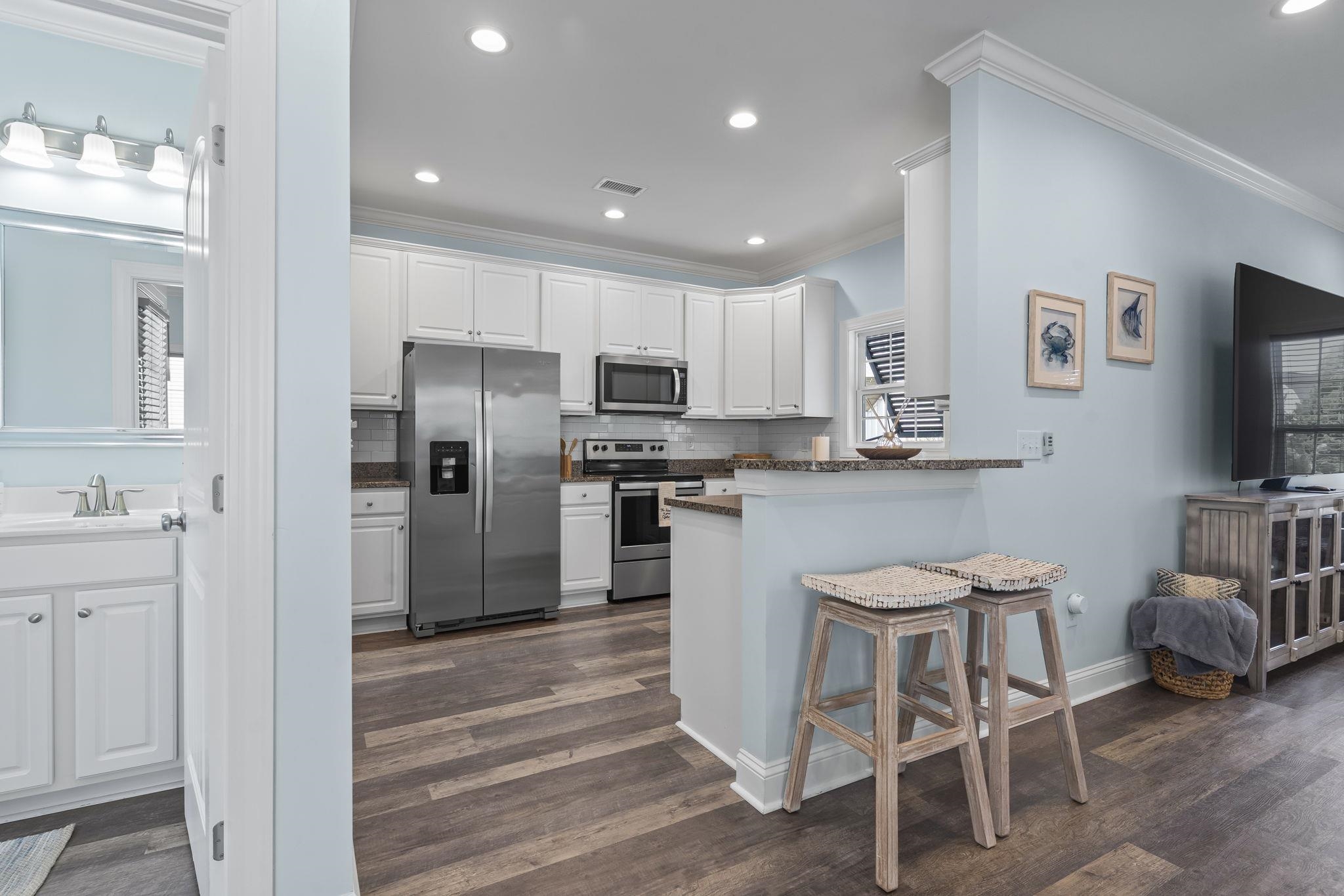 Located east of Highway 17 in the highly desirable Bungalows on 9th community, 932 Leah Jayne Lane offers a prime North Myrtle Beach location just a golf cart ride or short walk to the beach. This immaculately maintained 3-bedroom, 2.5-bath raised beach-style home features an open-concept living and dining area with upgraded luxury vinyl plank flooring throughout, no carpet, recessed kitchen lighting, and a bright coastal design. The kitchen is well-appointed with stainless steel appliances, solid surface countertops, ample cabinet space, and a breakfast bar, ideal for everyday living and entertaining. The home is being offered fully furnished, including a full-size washer and dryer, making it truly move-in ready. Thoughtfully designed for flexibility and convenience, the home includes a pre-built elevator shaft that may be used for extra storage or easily converted to an elevator. The spacious primary suite offers access to a private second-level balcony and an ensuite bath featuring a floor-to-ceiling tiled walk-in shower. Additional highlights include a full-size laundry room, attached single-car garage and under-home parking for beach gear or a golf cart, and excellent curb appeal with two covered front porches, one off the living area and one off the primary bedroom. This low HOA, golf-cart-friendly community is just minutes from Main Street North Myrtle Beach, Cherry Grove Beach, Barefoot Landing, golf courses, shopping, dining, and entertainment, making this property an excellent primary residence, second home, or investment opportunity along the Grand Strand. Measurements are not guaranteed. Buyer is responsible for verifying.