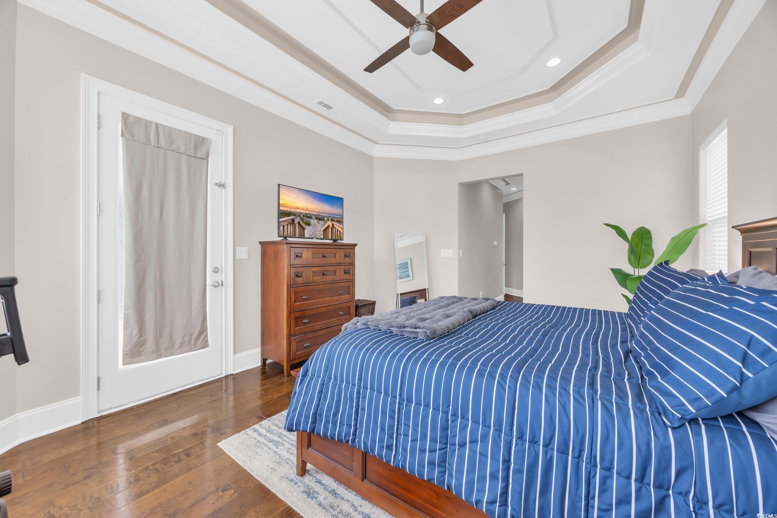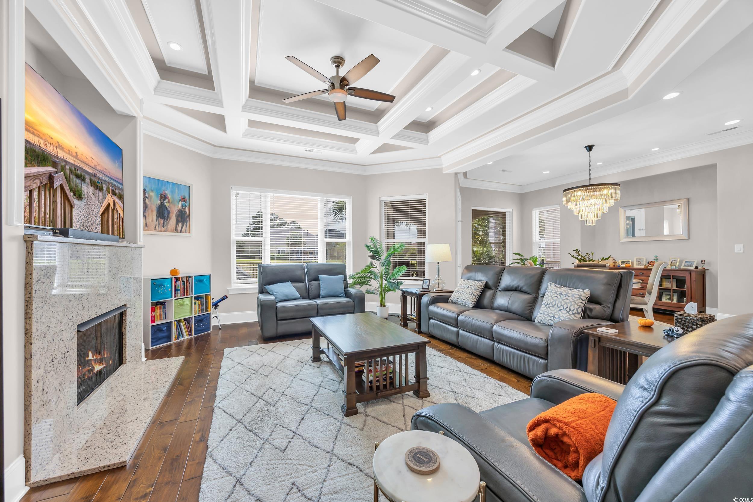 Four bedroom Mediterranean ranch with a two car garage and a tranquil pond view in The Bluffs on the Waterway, a gated community known for first class amenities including two elegant clubhouses, a resort style pool, private boat launch and day docks, boat and RV storage, tennis and pickleball, playground, and walking trails just minutes from the beach. This amenity rich lifestyle sets the tone the moment you arrive, promising everyday relaxation and effortless entertaining. Inside, the open concept great room flows into a chef’s kitchen with granite countertops, stainless appliances, and a tile backsplash, while wide plank flooring, plantation shutters, custom lighting, and crown molding elevate every space. The owner’s suite pampers with a walk in shower and dual vanities, and a flexible office or bonus room offers abundant storage. Ideally located near Carolina Forest golf, shopping, dining, medical services, and the airport, this home is move in ready—bring your boat and start living the Waterway dream.Move in ready and golf cart friendly, so bring your boat and start living the Waterway dream!