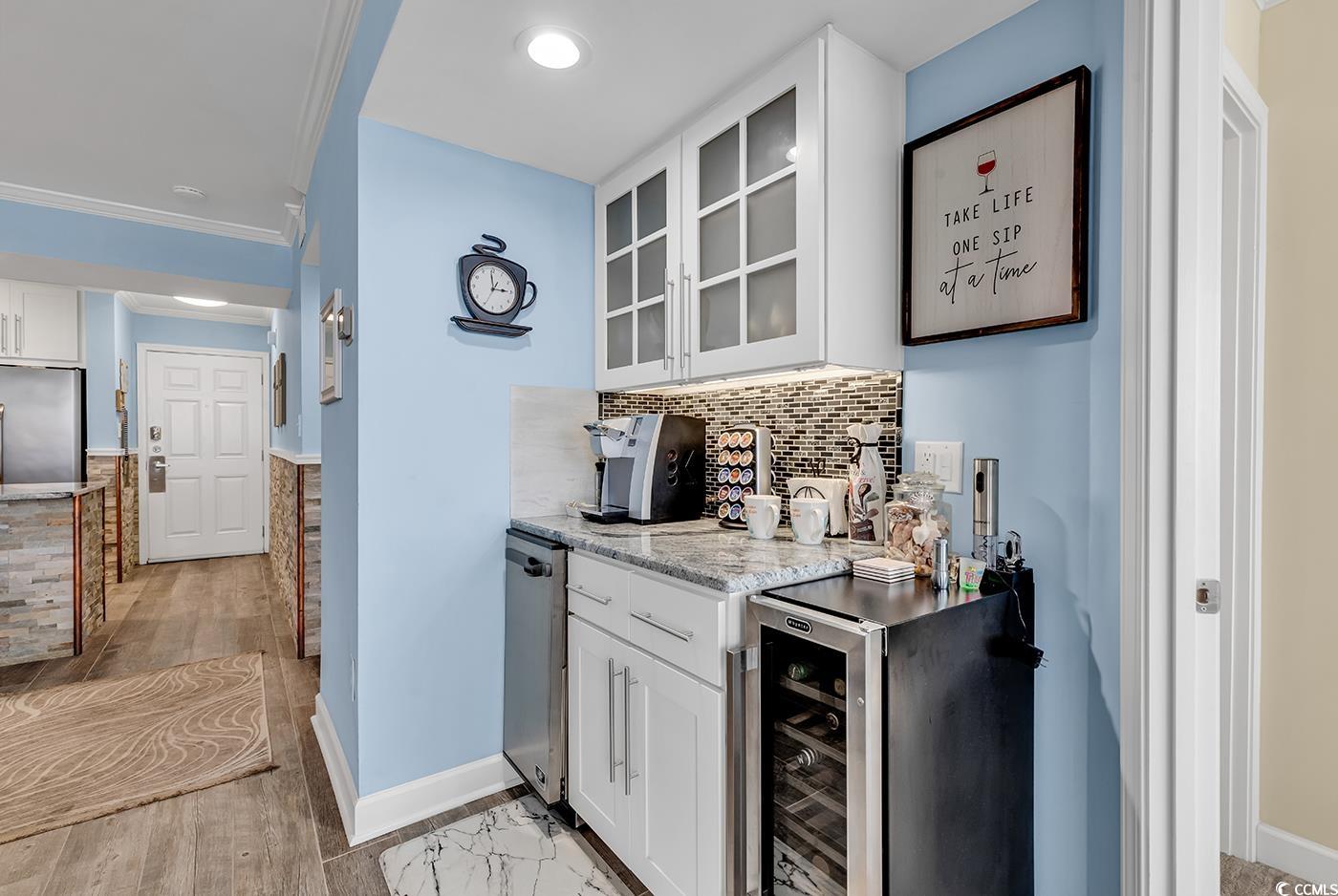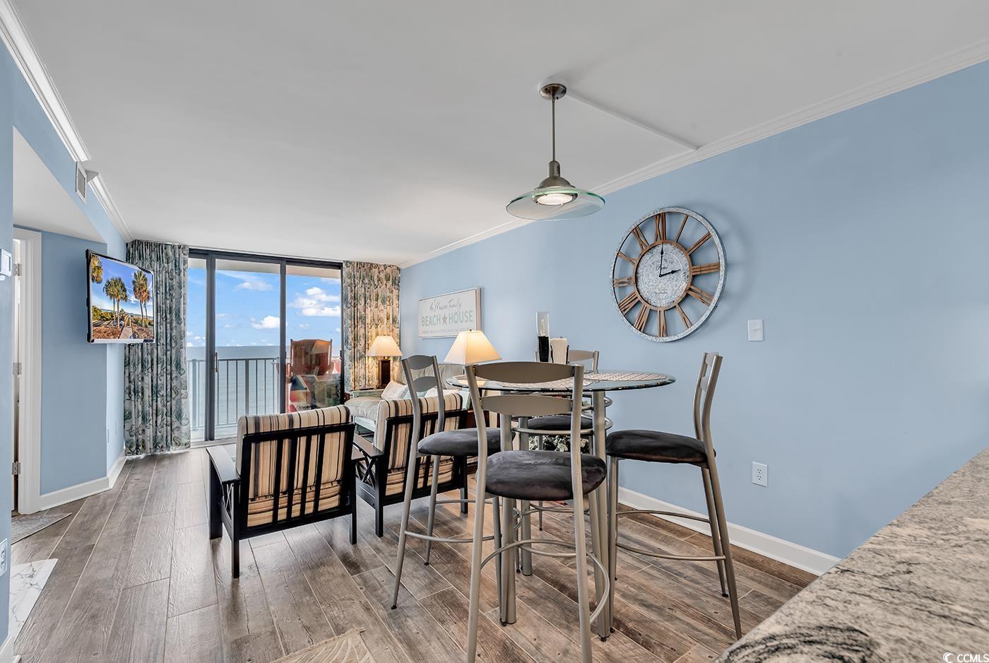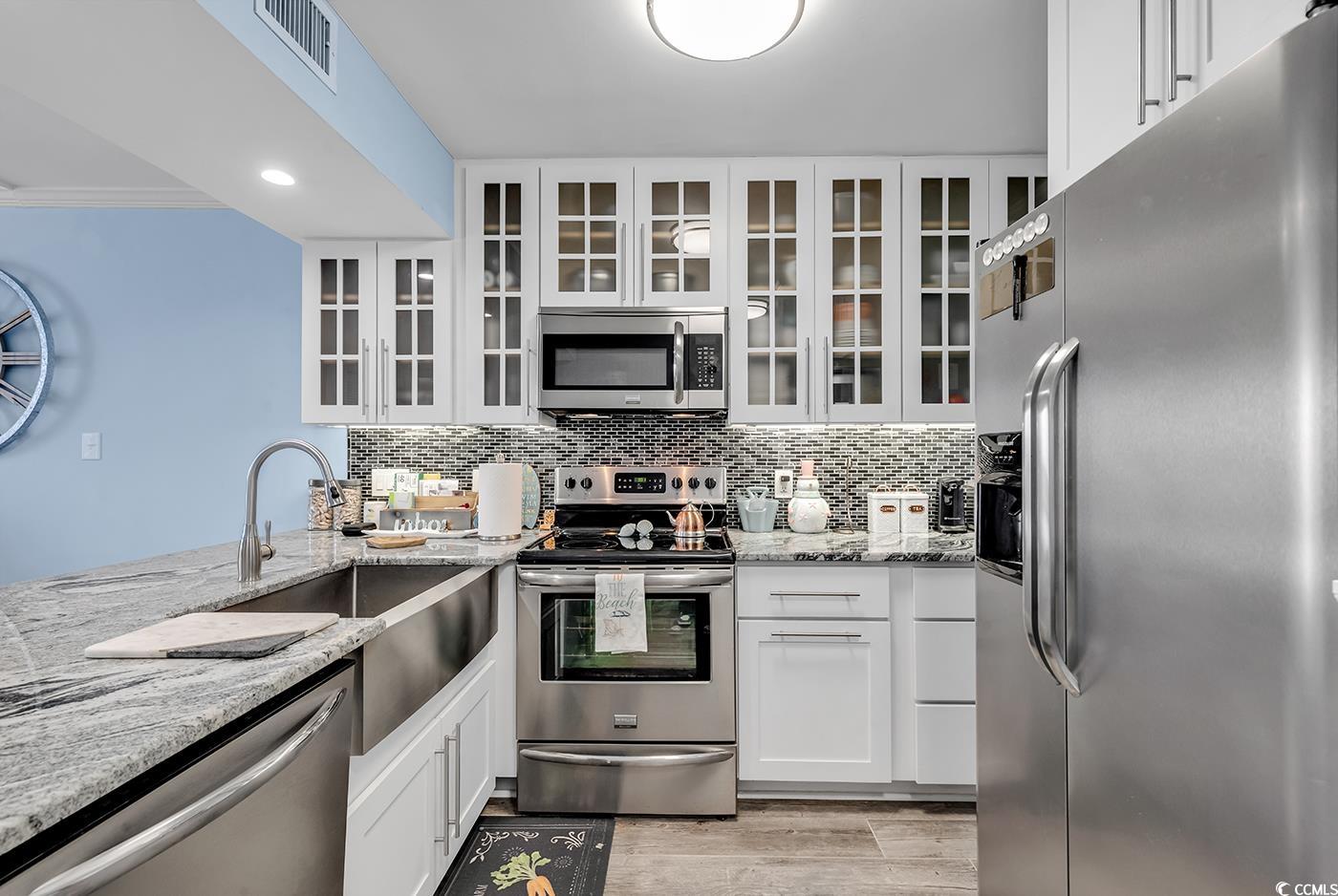 Welcome to your dream coastal retreat. Sands Beach Club II is nestled at the end of Shore Dr which will provide you with an ultimate sense of privacy away from the hustle and bustle of Myrtle Beach. Adjacent to the property is the Singleton Swash that offers fun opportunities to explore, fishing, and crabbing. Unit 1124 is an oceanfront fully furnished 2 bedroom 2 bath condo located on the top floor, 11th floor, which will provide you with stunning penthouse like views of the Atlantic Ocean from the gathering room and primary suite. This beautifully renovated condo has custom renovations throughout showcasing upscale product lines. As you enter, you will notice the Desert Quartz stacked stone that is adorned on the wall below the chair railing and on the kitchen island. The gourmet kitchen was reconfigured for more efficient use of cabinet and storage space that includes granite, stainless steel appliances, custom designed cabinets, and a stainless-steel farmhouse sink. In the main living area, driftwood-look ceramic tile floors have been installed for its beauty and durability. The popcorn ceiling was removed and painted, and crown molding was added. The convenient bar area was installed with a custom cabinet to hold the commercial grade ice maker, commercial grade coffee maker, and wine cooler. The primary suite offers stunning ocean views and an updated en-suite that includes a walk-in ceramic tile shower with a glass slider enclosure, vanity, and porcelain tile floors to provide a spa like experience. Stainmaster carpet was installed in both bedrooms. The current owner, which has owned for 6 years, has only used this beautiful unit as a family vacation home with very limited use. Current owner states that this unit has been owned by a total of 3 owners and was never on a rental program. The resort amenities offer indoor and outdoor pools, hot tub, tennis/pickleball court, basketball half-court, fitness center, an on-site restaurant, and grilling areas. Take a quick walk to Ocean Annies beachfront Bar for fun and live entertainment. When you are ready to leave the luxuries of the beach and resort, you are just a short drive to Tanger Factory Outlets, Barefoot Landing, Carolina Opry, Alabama Theatre, golf courses and restaurant row. Make an appointment today to experience the best that this condo and resort has to offer.