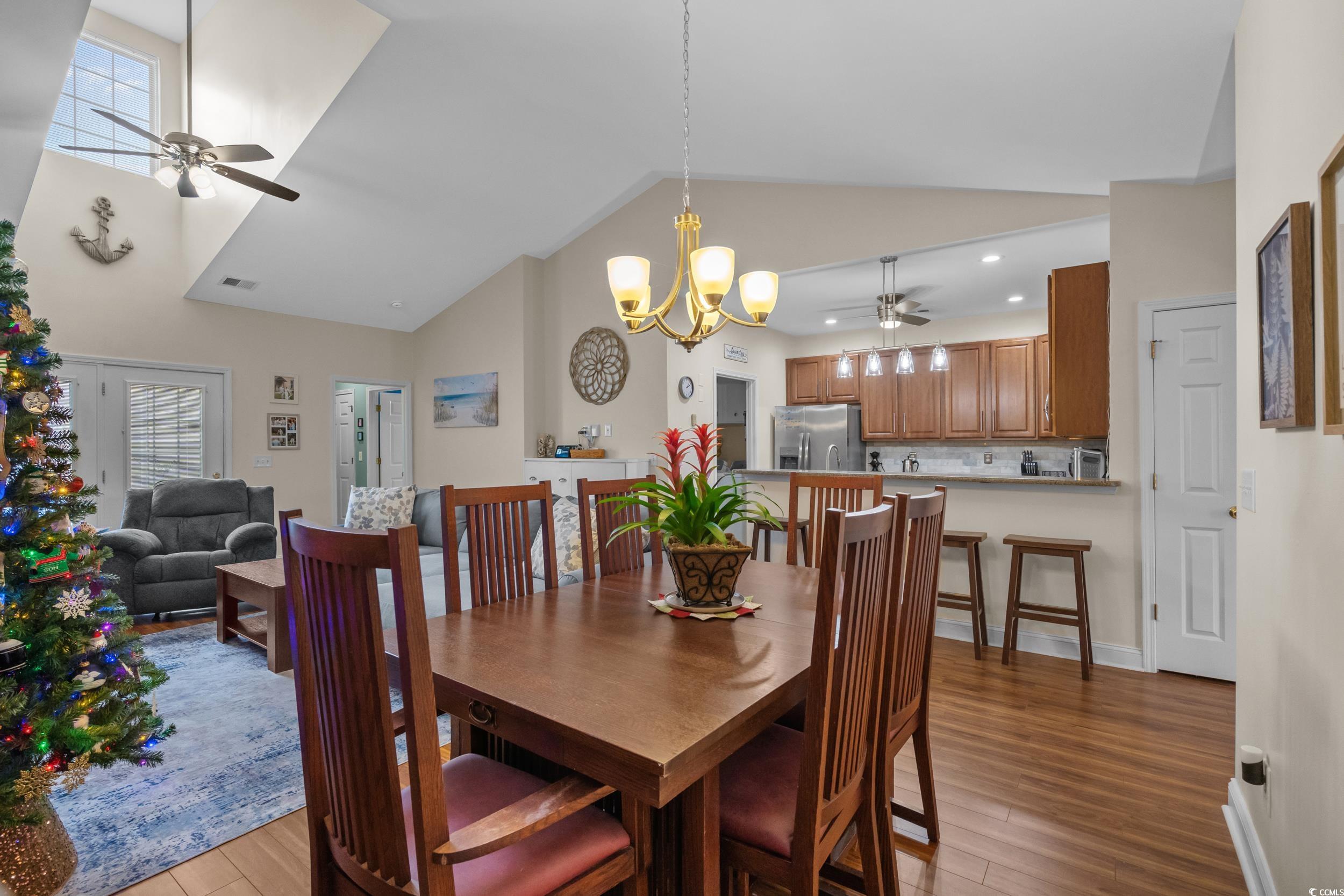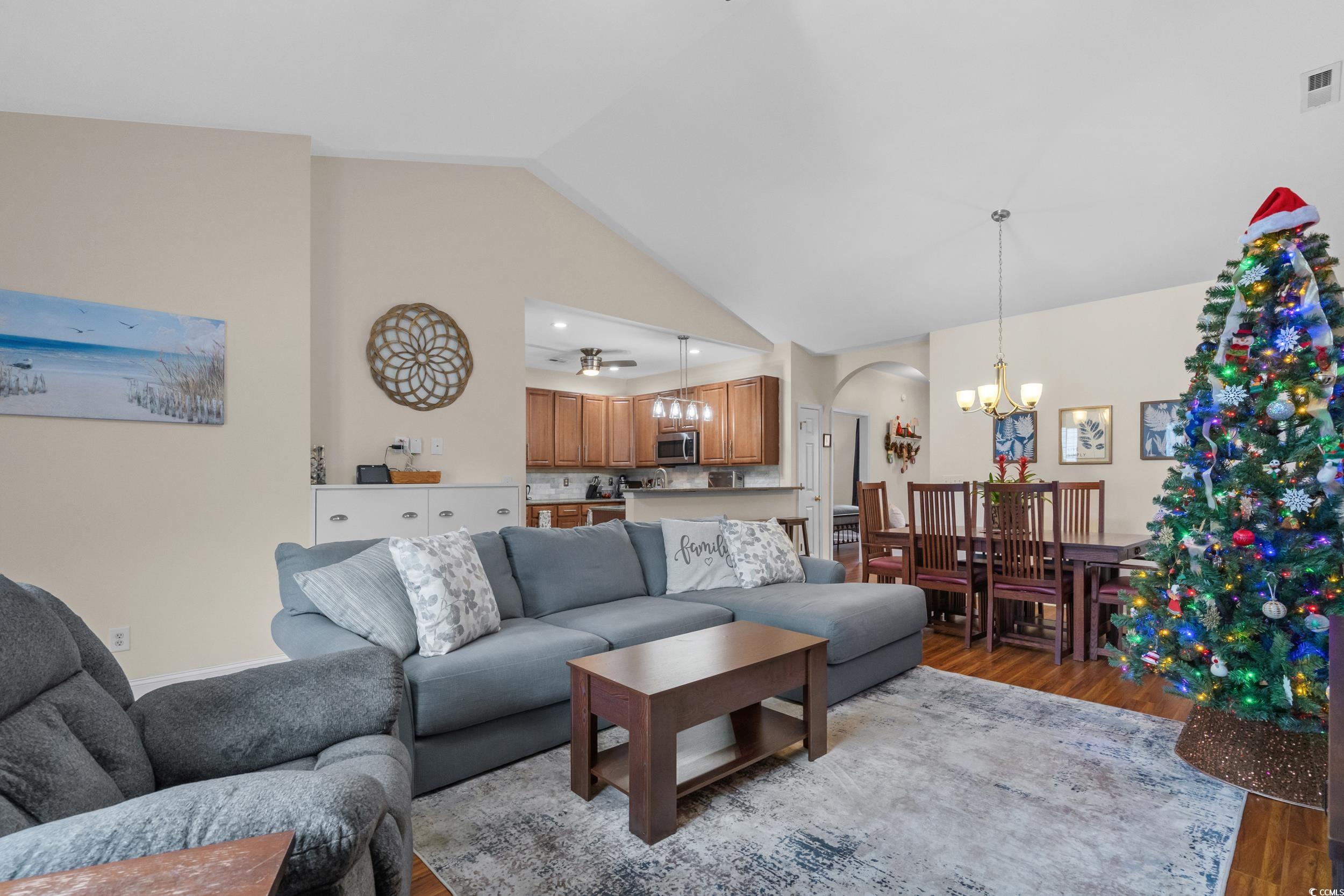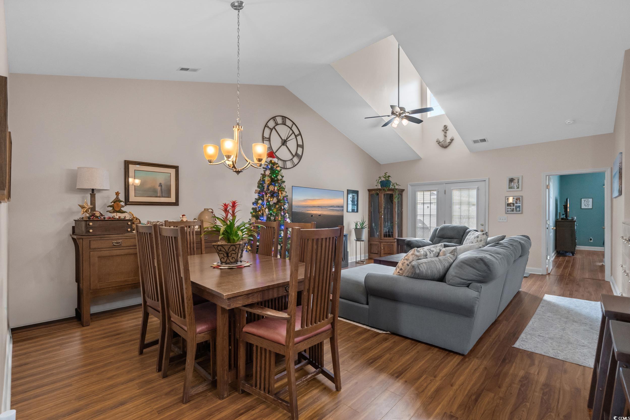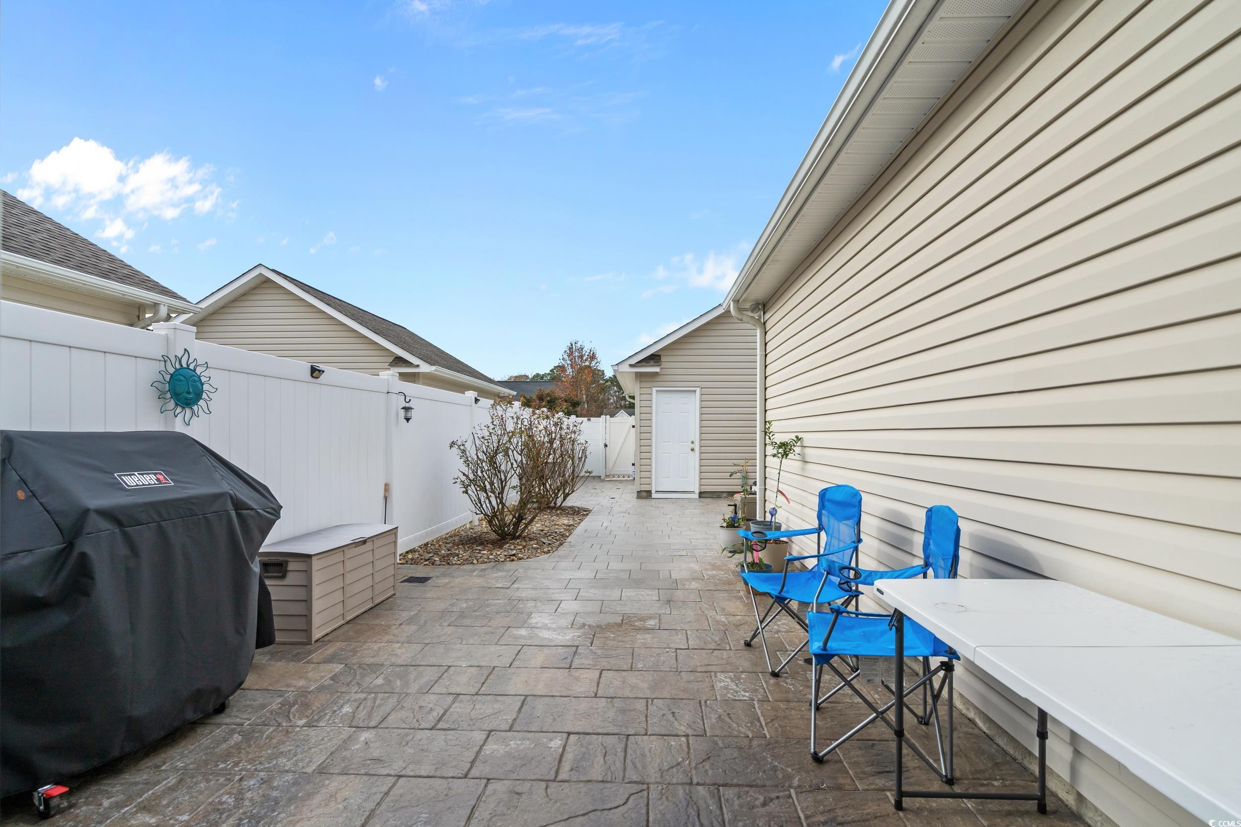 OPEN HOUSE Saturday 12pm-2pm. Welcome to this charming 3-bedroom, 2-bath home featuring a 2-car detached garage, ideally located just minutes from The Market Common District, Myrtle Beach International Airport, and only five miles from the ocean and Springmaid Pier. The open-concept floor plan showcases vaulted ceilings throughout, allowing abundant natural light to fill the living spaces. The kitchen is well-appointed with granite countertops, stainless steel appliances, and plentiful soft-close cabinetry, perfect for everyday living and entertaining. The spacious living area offers room to gather and relax, complete with a ceiling fan and French doors that open to a large patio featuring stone pavers and a powered retractable awning—ideal for outdoor enjoyment year-round. The primary suite includes a vaulted ceiling, ceiling fan, walk-in closet, and a private bath with a double vanity, upgraded granite countertops, and a walk-in shower. One of the additional bedrooms also features a vaulted ceiling with a sun-filled window, while both secondary bedrooms offer ceiling fans and ample closet space. Residents enjoy access to a community pool and clubhouse just a short walk away, adding to the comfort and convenience of this desirable home.