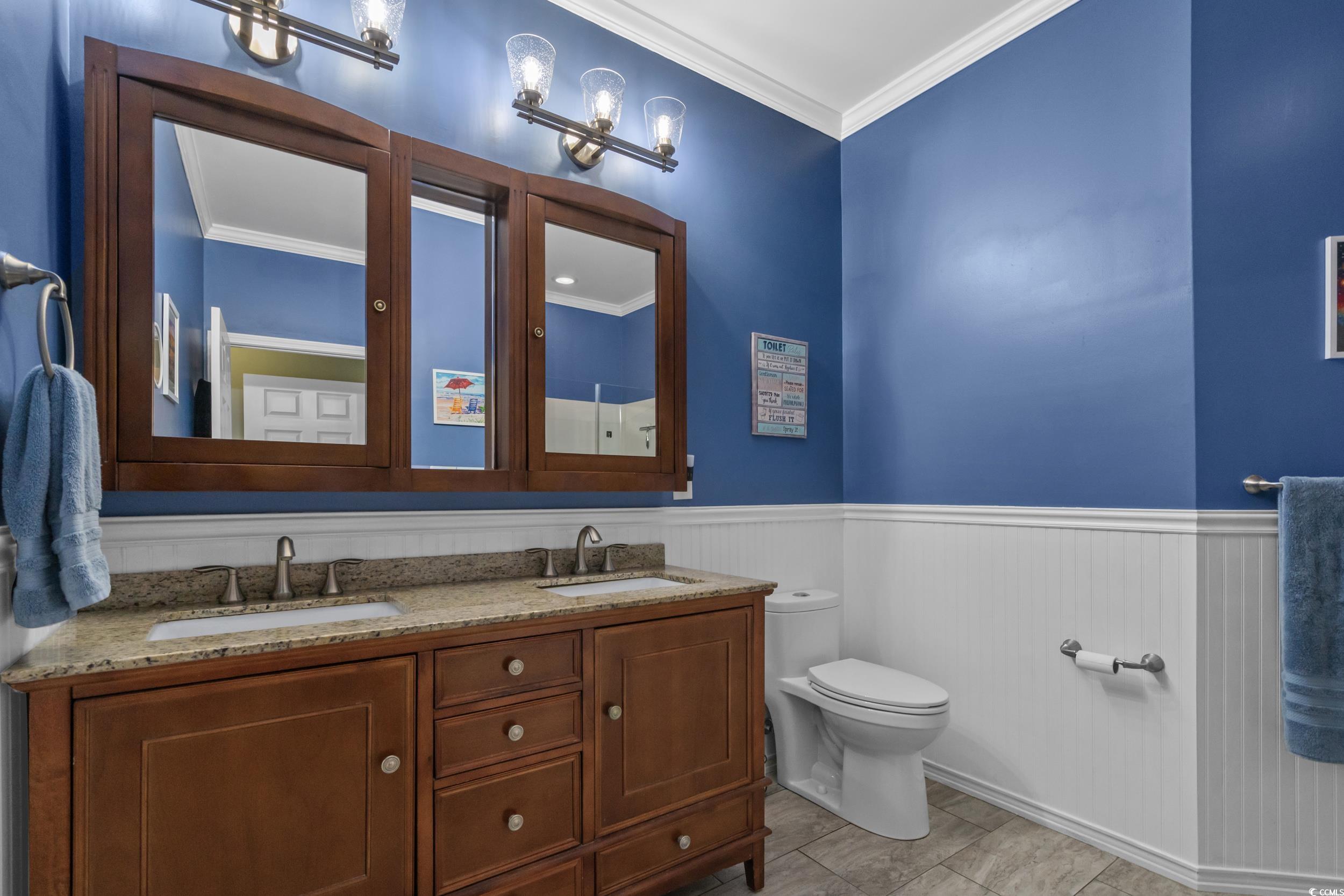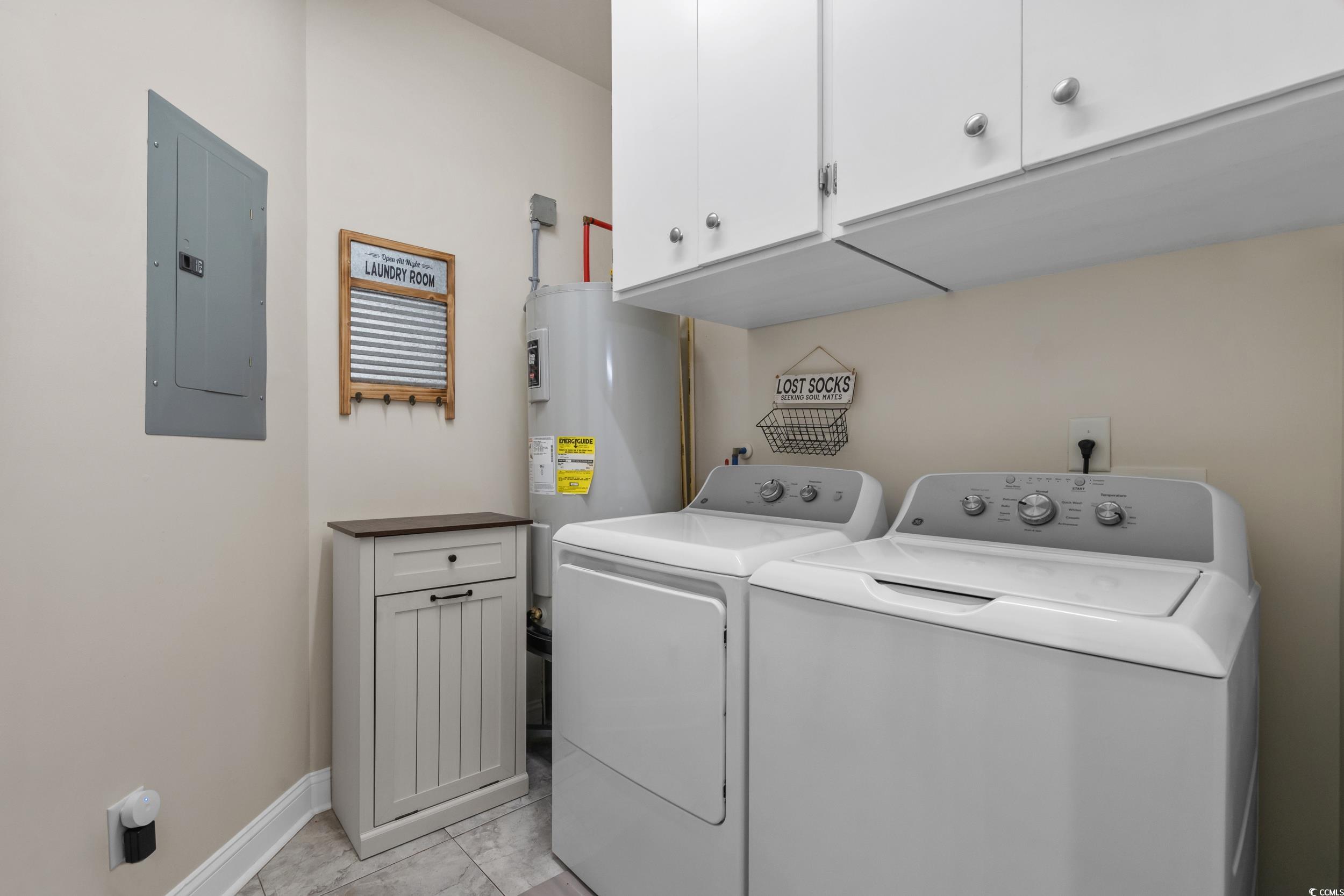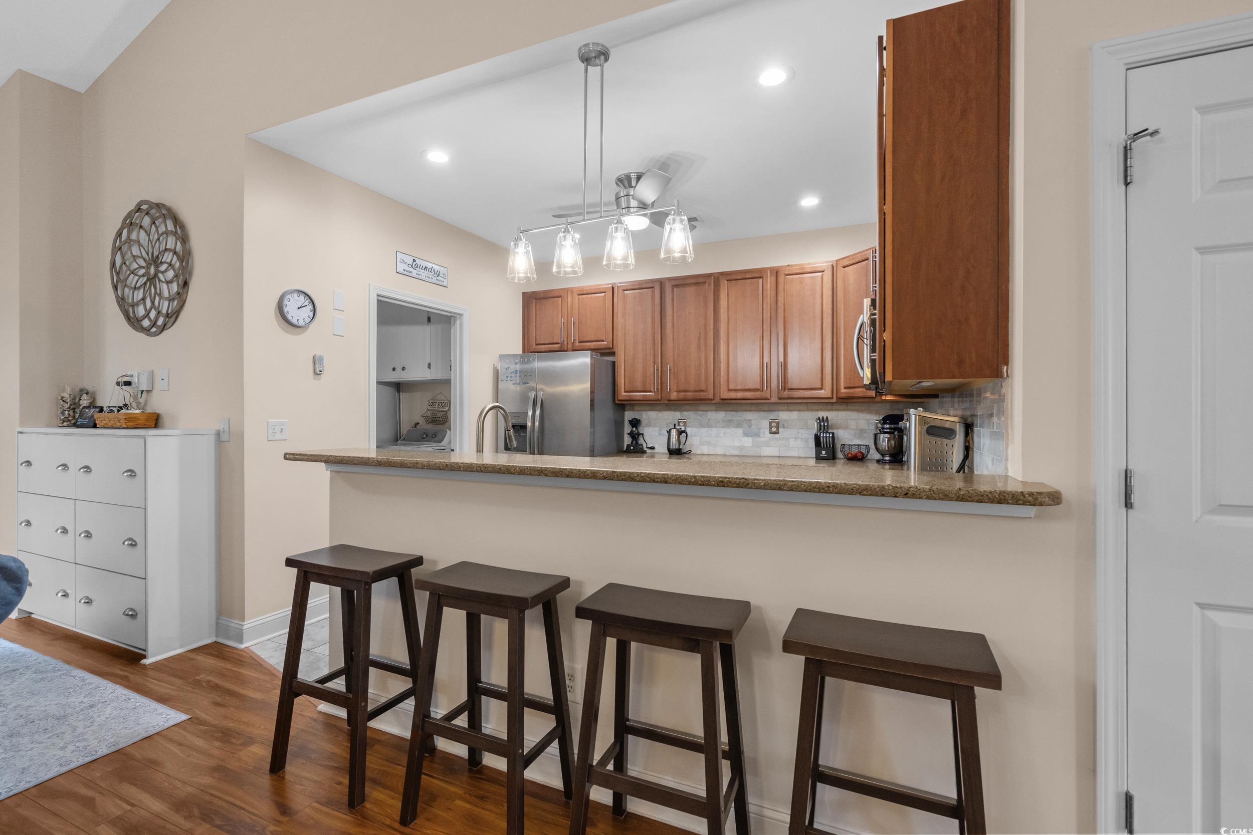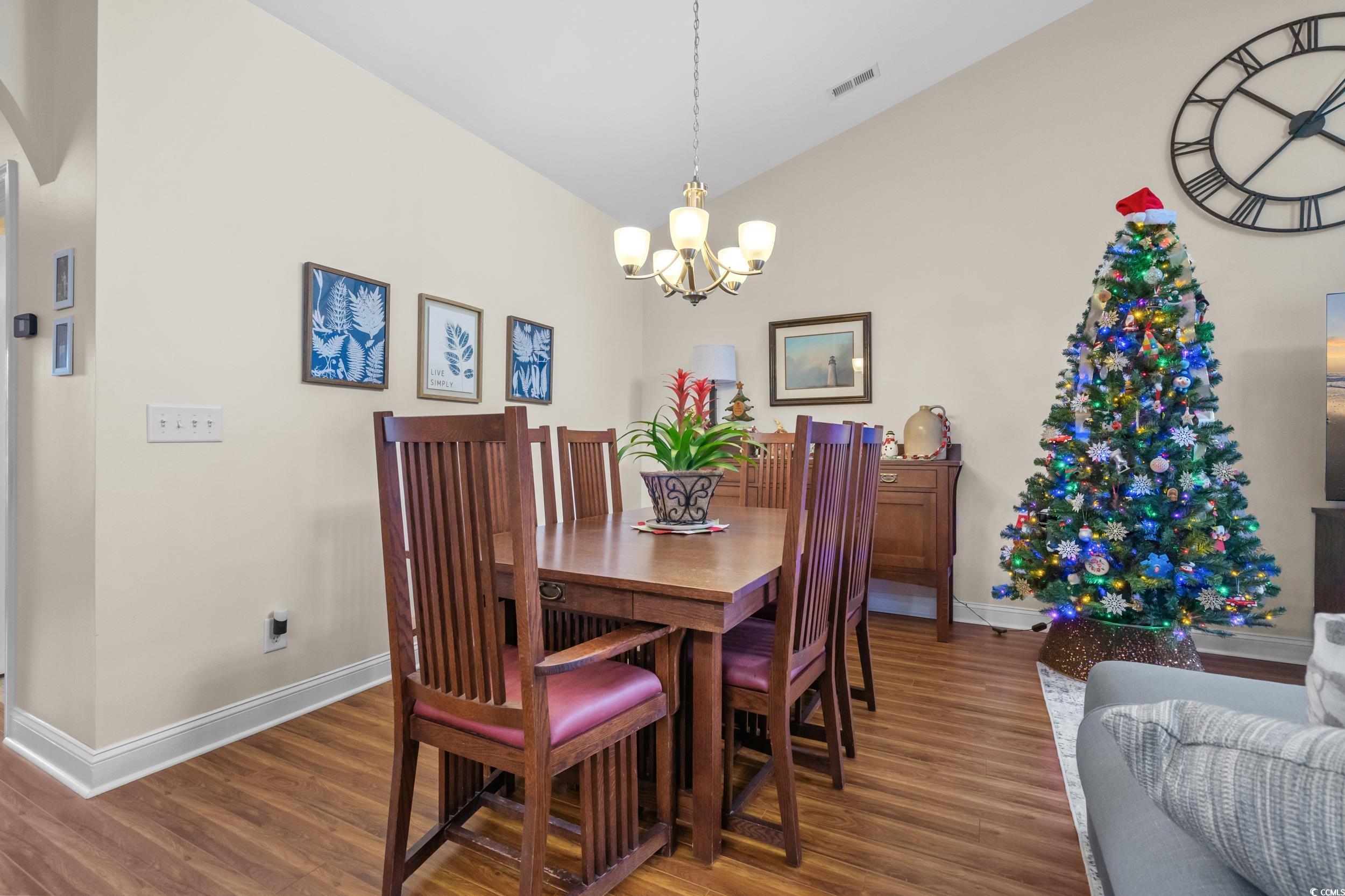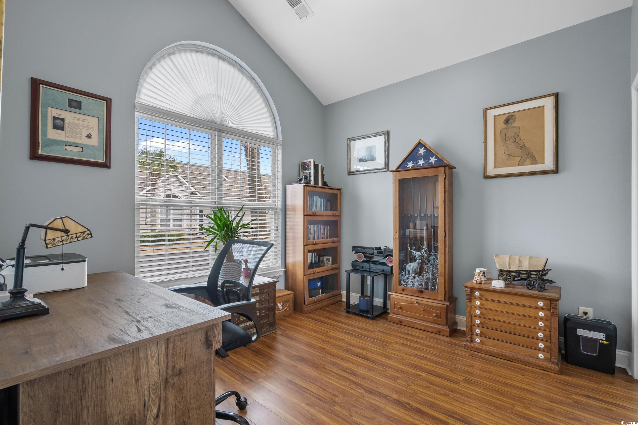 OPEN HOUSE Saturday 12pm-2pm. Welcome to this charming 3-bedroom, 2-bath home featuring a 2-car detached garage, ideally located just minutes from The Market Common District, Myrtle Beach International Airport, and only five miles from the ocean and Springmaid Pier. The open-concept floor plan showcases vaulted ceilings throughout, allowing abundant natural light to fill the living spaces. The kitchen is well-appointed with granite countertops, stainless steel appliances, and plentiful soft-close cabinetry, perfect for everyday living and entertaining. The spacious living area offers room to gather and relax, complete with a ceiling fan and French doors that open to a large patio featuring stone pavers and a powered retractable awning—ideal for outdoor enjoyment year-round. The primary suite includes a vaulted ceiling, ceiling fan, walk-in closet, and a private bath with a double vanity, upgraded granite countertops, and a walk-in shower. One of the additional bedrooms also features a vaulted ceiling with a sun-filled window, while both secondary bedrooms offer ceiling fans and ample closet space. Residents enjoy access to a community pool and clubhouse just a short walk away, adding to the comfort and convenience of this desirable home.