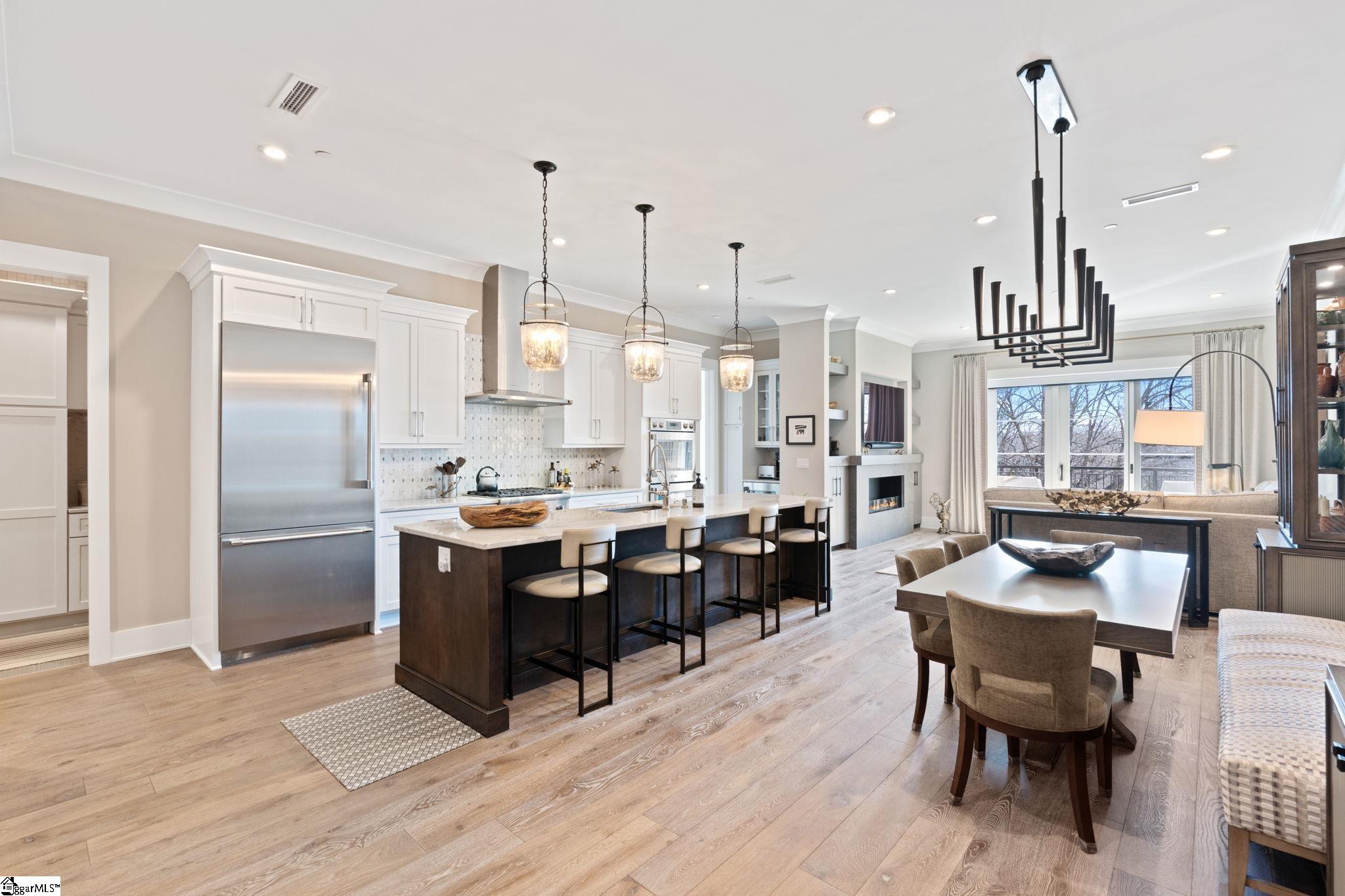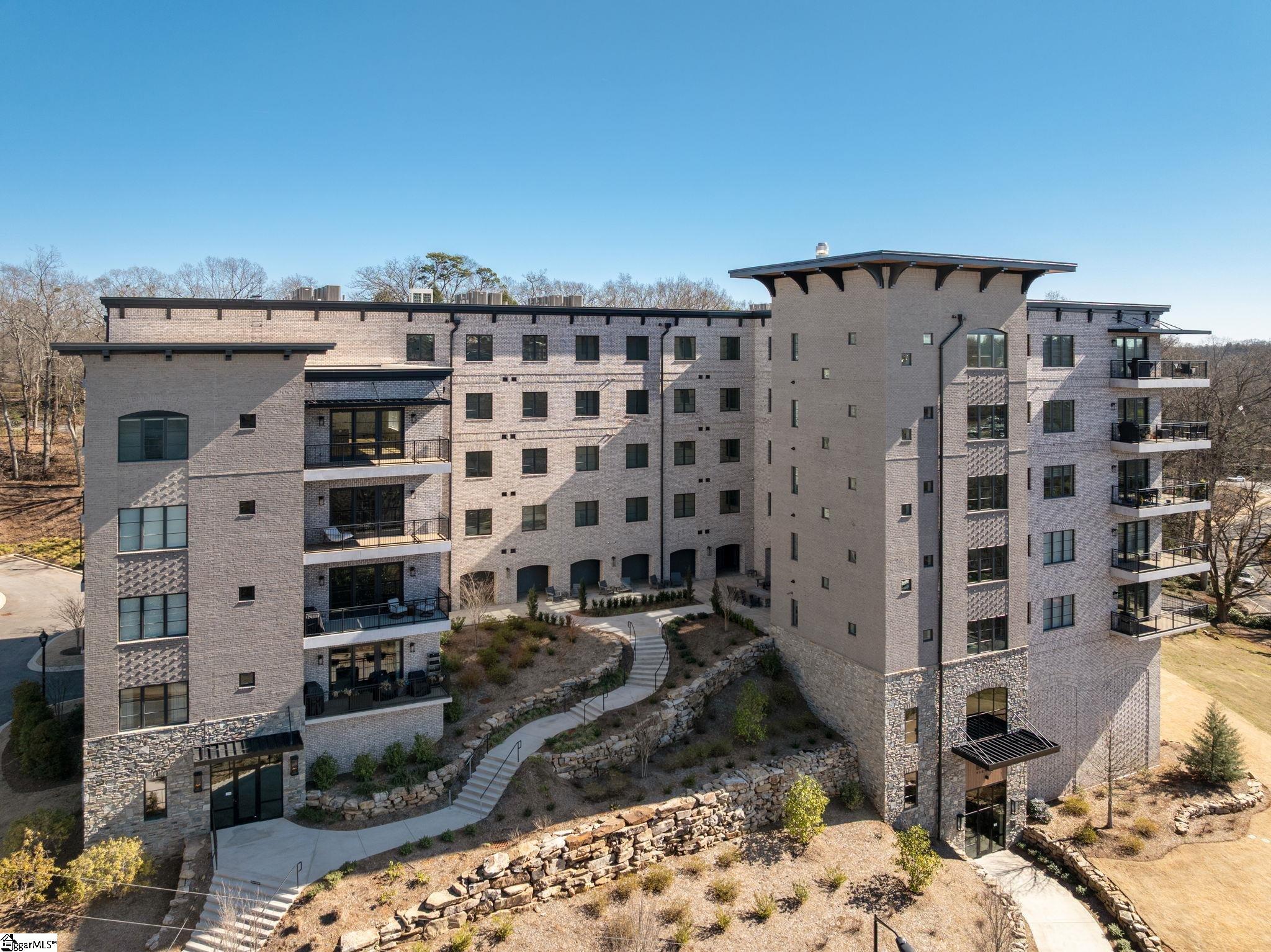 Discover the best of downtown living at The Broadview, a remarkable 1925 sq-ft two-bedroom residence just steps from Main Street, the Peace Center, Cleveland Park, Fluor Field, and the Swamp Rabbit Trail. Sophistication meets comfort in this beautifully appointed condominium featuring wide plank hardwood floors, two spacious bedrooms and two elegant baths, including a primary suite reminiscent of a boutique hotel retreat. The guest bedroom has custom cabinetry for a second office including a queen-sized murphy bed. A dedicated office with custom cabinetry offers flexibility and can easily serve as a third bedroom. The refined foyer sets the tone, opening to curated interiors rich with bespoke details. The thoughtfully designed open floor plan allows for effortless flow between the living, dining, and kitchen spaces—ideal for entertaining or intimate evenings at home. The chef’s kitchen is equipped with quartzite countertops, premium Thermador appliances, an expansive island, and a stylish coffee bar. Ten-foot ceilings, a cozy fireplace, custom built-in bookshelves, and abundant natural light a wide open southern view (southern exposure) enhance the warm yet refined ambiance. The living area extends to a spacious private balcony overlooking serene green space—an ideal setting for morning coffee or evening relaxation. The Broadview is one of a select number of condominiums that allows gas grills on balconies. Widely regarded as one of Greenville’s most desirable addresses, The Broadview offers concrete and steel construction, secured garage parking with two assigned spaces, level 2 EV charging, private storage at car level, guest parking, and bike storage—delivering both luxury and peace of mind in the heart of downtown.
