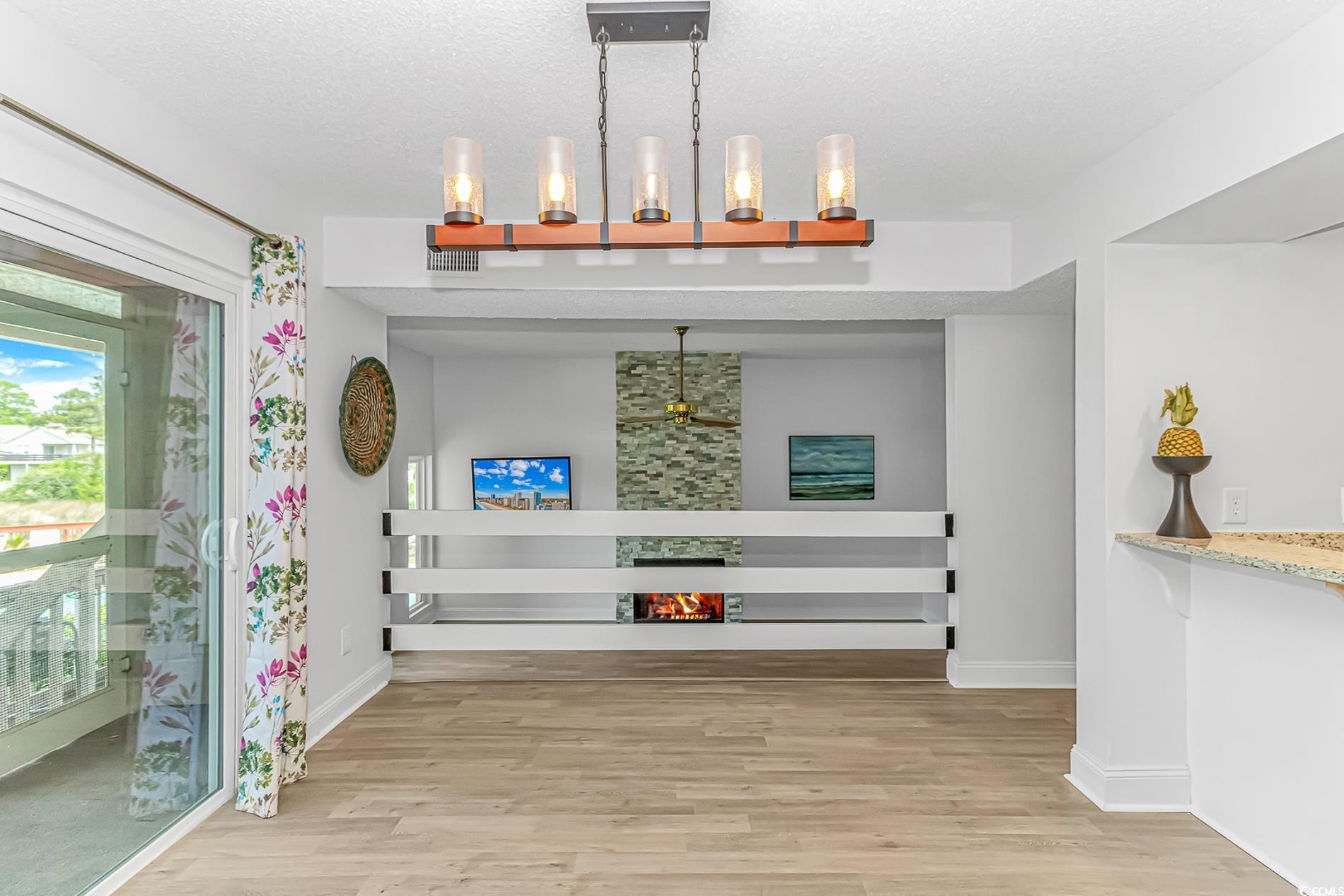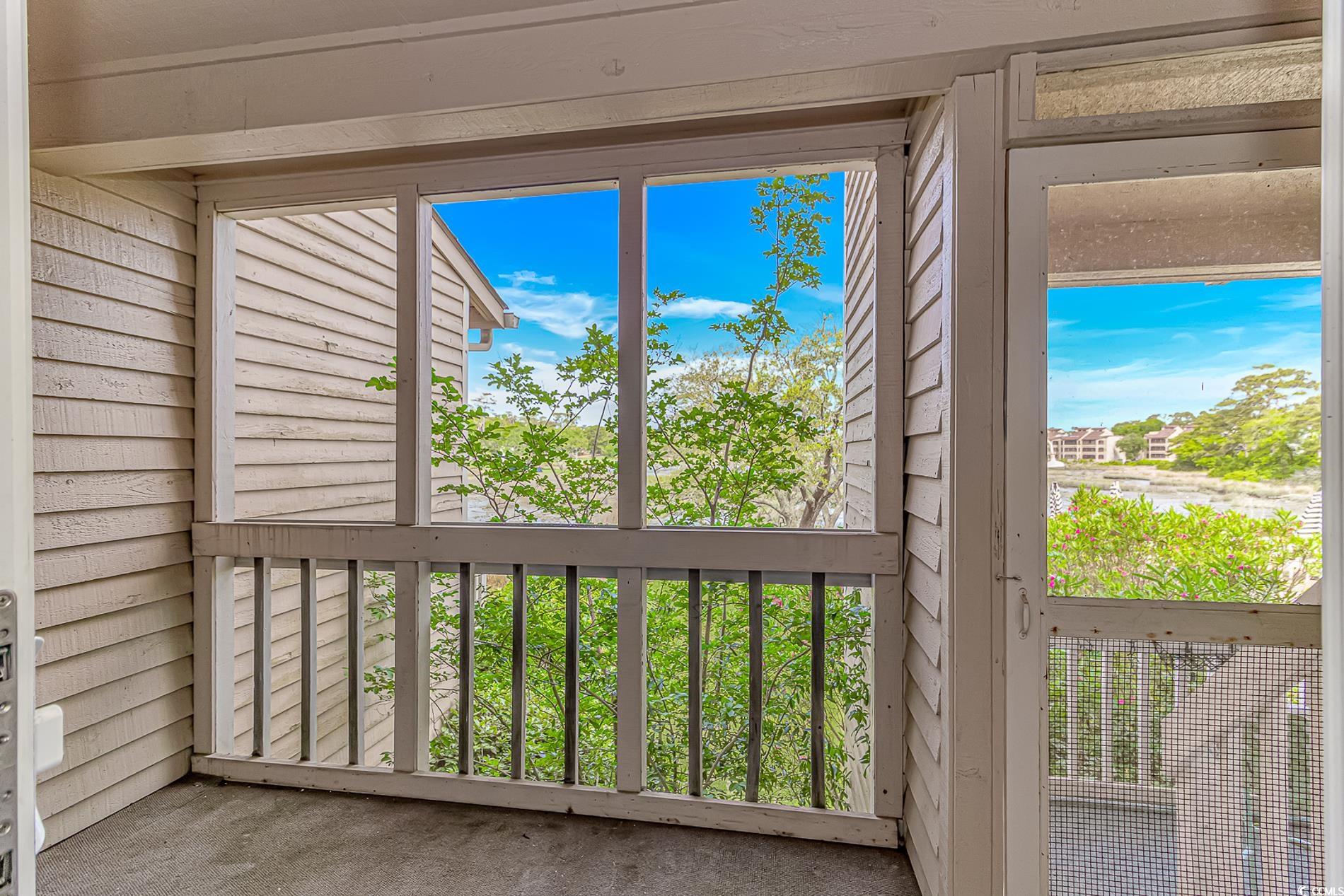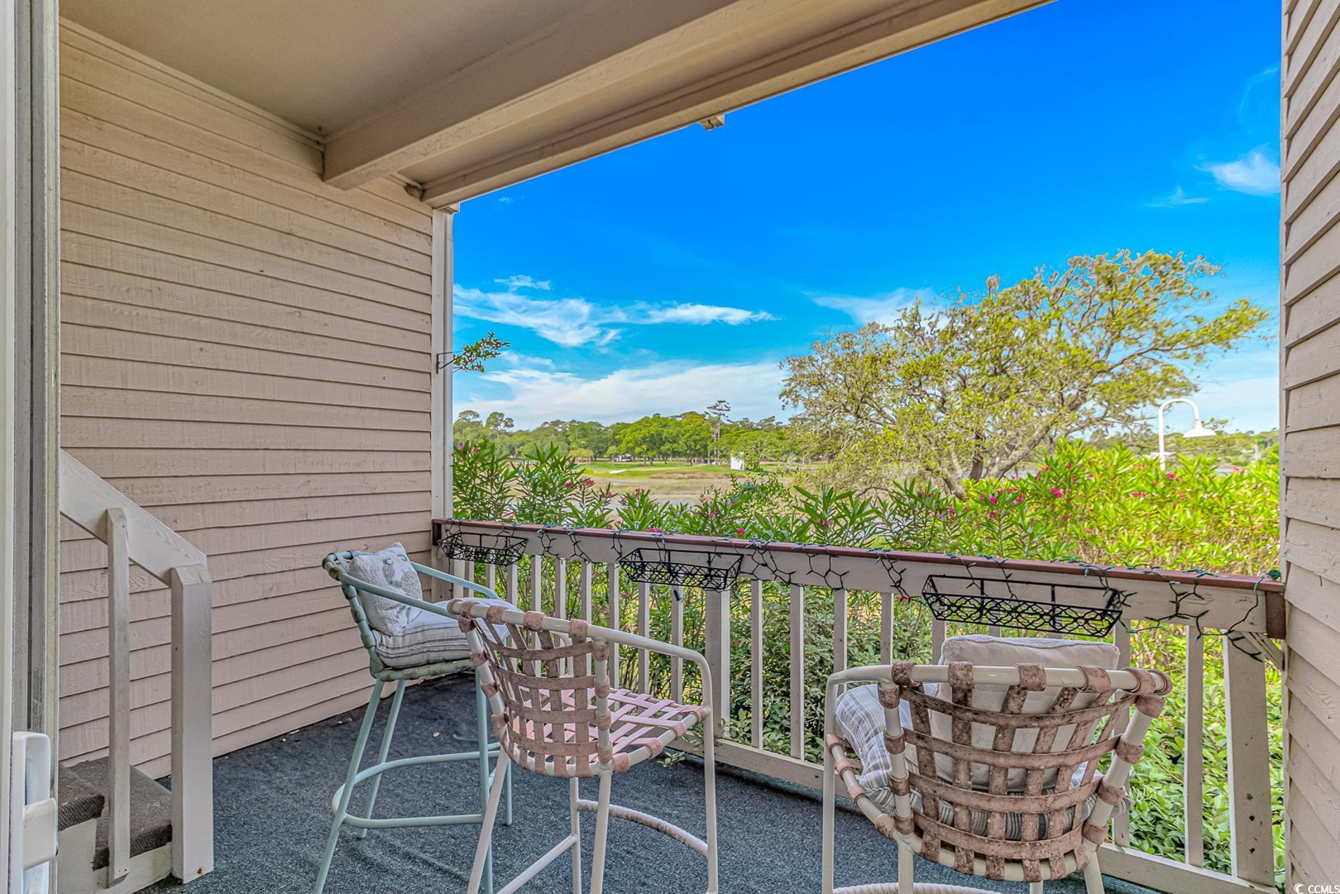 Beautifully updated 2 bedroom 2 bath condo with spectacular marsh views and new paint and flooring. The kitchen includes updated stainless steel appliances, granite counter tops and white cabinets. The dining area is large enough for a table with 6 chairs and looks out on a deck with sliders leading to the amazing marsh views. The living area features a cathedral ceiling, ceiling fan and stone front wood burning fireplace. You will enjoy the natural sunlight in this condo and the assigned parking. The primary bedroom is a comfortable size and has plenty of room for a King or Queen sized bed and includes an attached bathroom. If you are looking for a small quiet neighborhood close to the beach that allows golf carts, this is the condo for you. Some photos have been virtually staged.