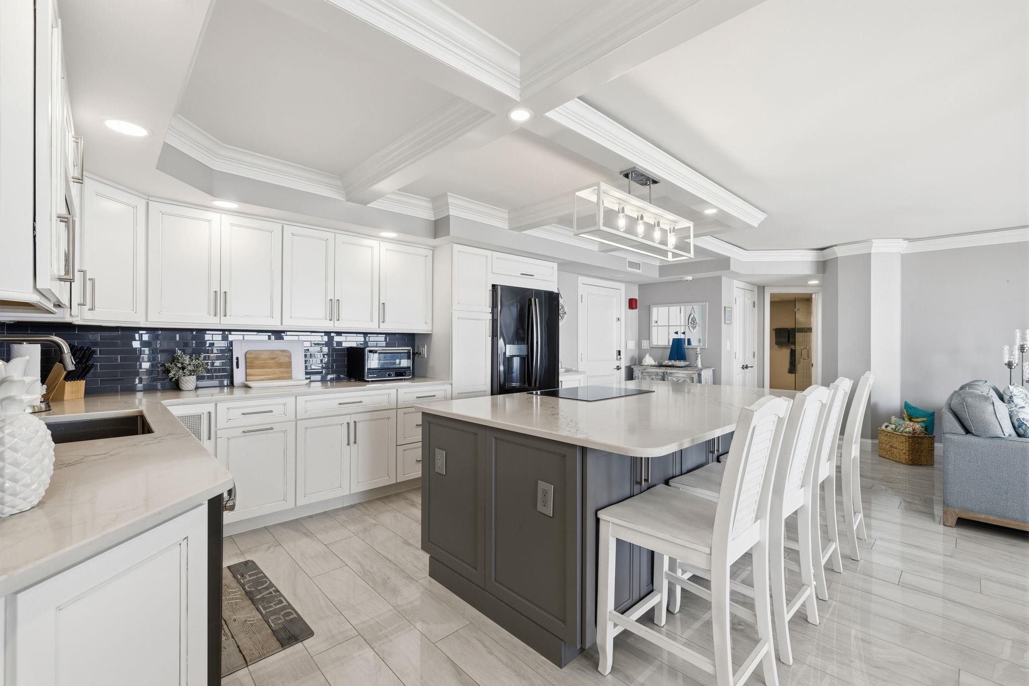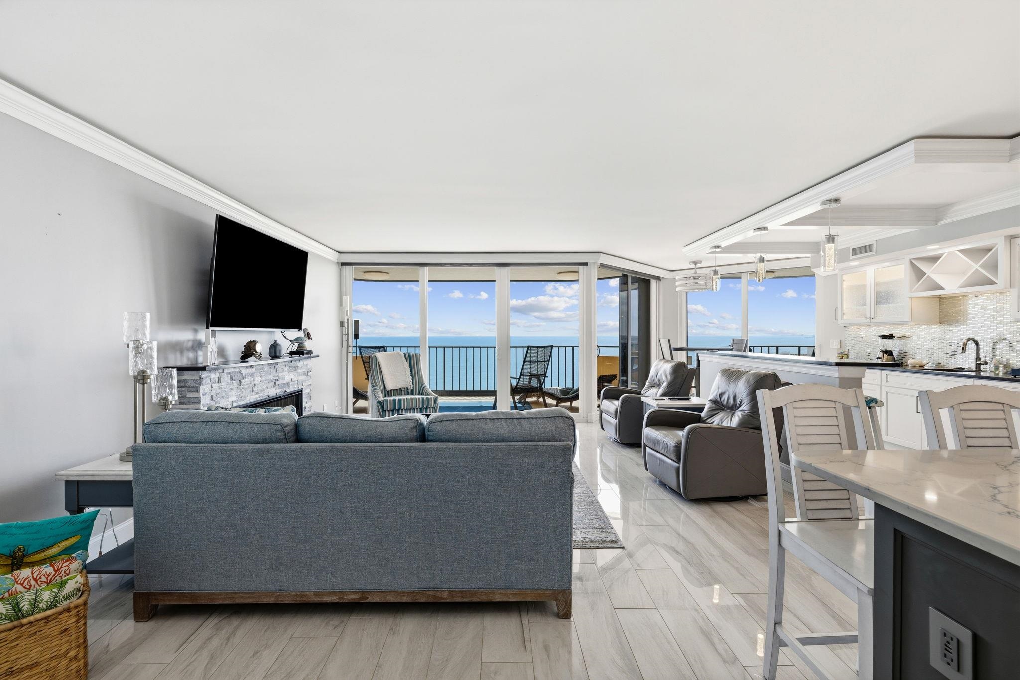 Luxury oceanfront living at Maisons Sur Mer! This ONE OF A KIND stunning 22nd-floor condo in sought-after Arcadian Shores has been completely renovated from ceilings to floors. Flowing wall to wall porcelain marble tile, smooth ceilings with crown molding, and tray ceilings with accent lighting create an elegant atmosphere throughout. Floor-to-ceiling windows and new sliding glass doors capture breathtaking panoramic views of the Atlantic Ocean, coastline, and cityscape. Three private balconies—including two oversized—feature non-slip tile floors and storm shutters for ultimate relaxation. The gourmet kitchen boasts custom cabinetry, quartz countertops, high-end appliances, and a massive island with breakfast bar. An inviting wet bar with decorative backsplash boasting gorgeous ocean view adjoins the living space featuring a stone fireplace. Both bedrooms offer unfettered ocean views, balcony access, and walk-in closets. Luxurious ensuites include custom vanities, granite countertops, and tiled walk-in showers. This immaculate unit was gutted down to the studs to provide upgrades that includes new electrical wiring and lights, built-in electric window darkening shades with remote, increased ceiling height, new HVAC, and LED multi-colored lights that showcase the crown molding. The long list of amenities includes pool, tennis, fitness center, his and her saunas, private beach access, oceanfront restaurant, Tiki bar, theater room, billiards, game room, library, 24-hr security, Owners storage closet, and guest apartment for rent. Close to golf, dining, ICW, marinas, and Grand Strand beaches. Excellent primary home, second home, or investment opportunity!