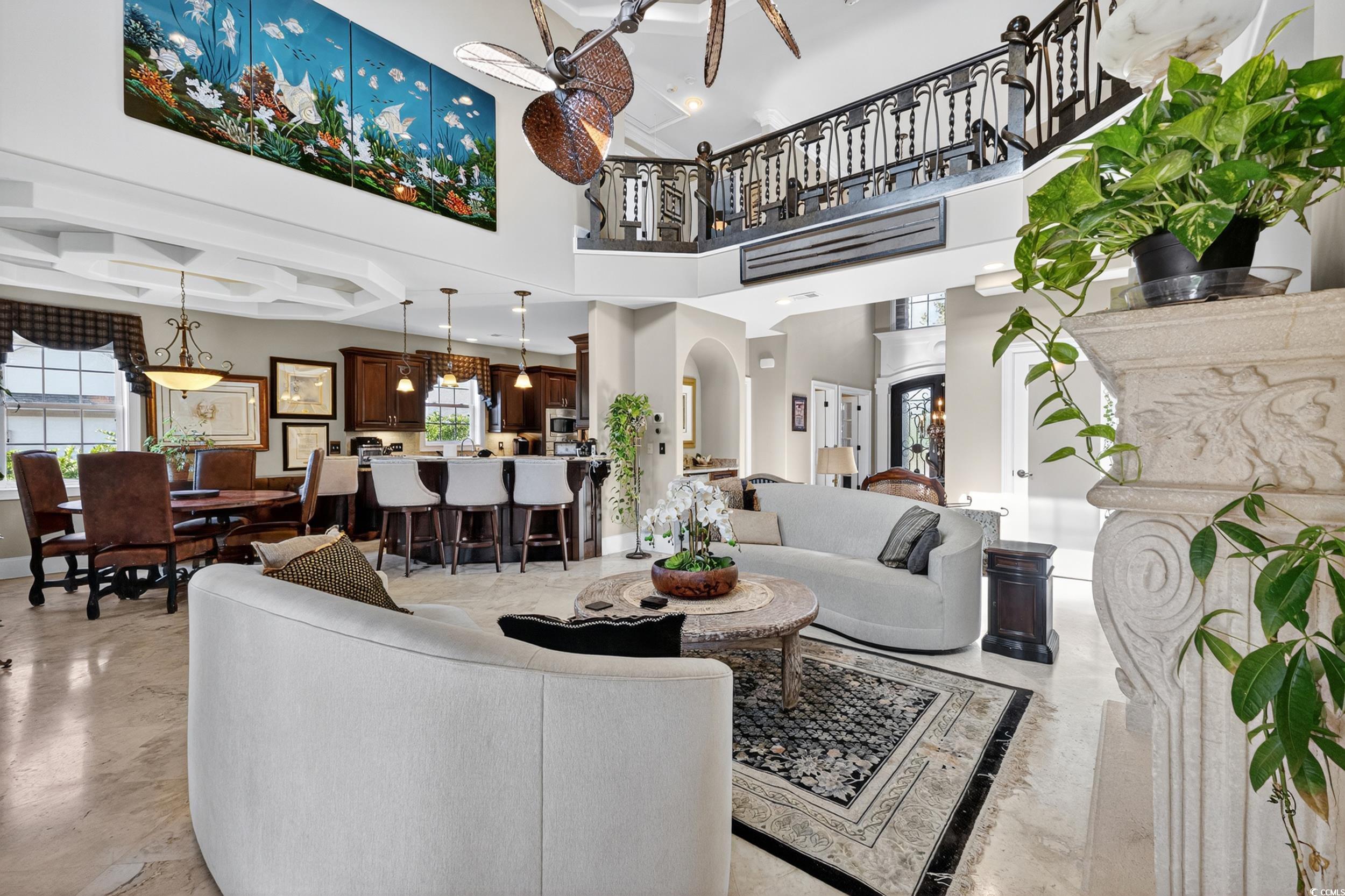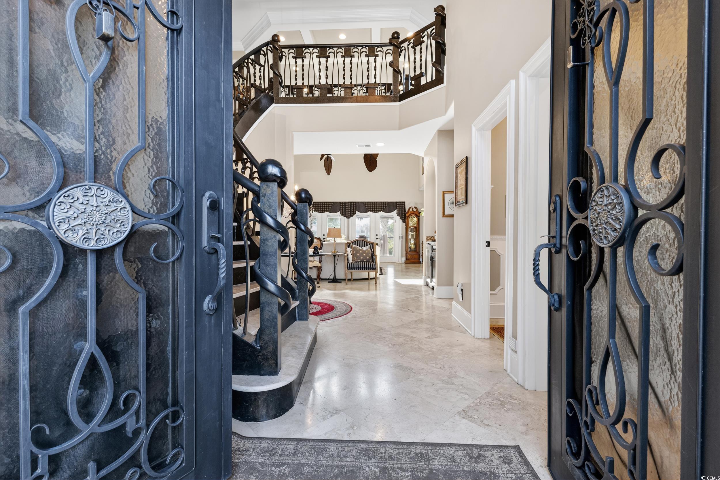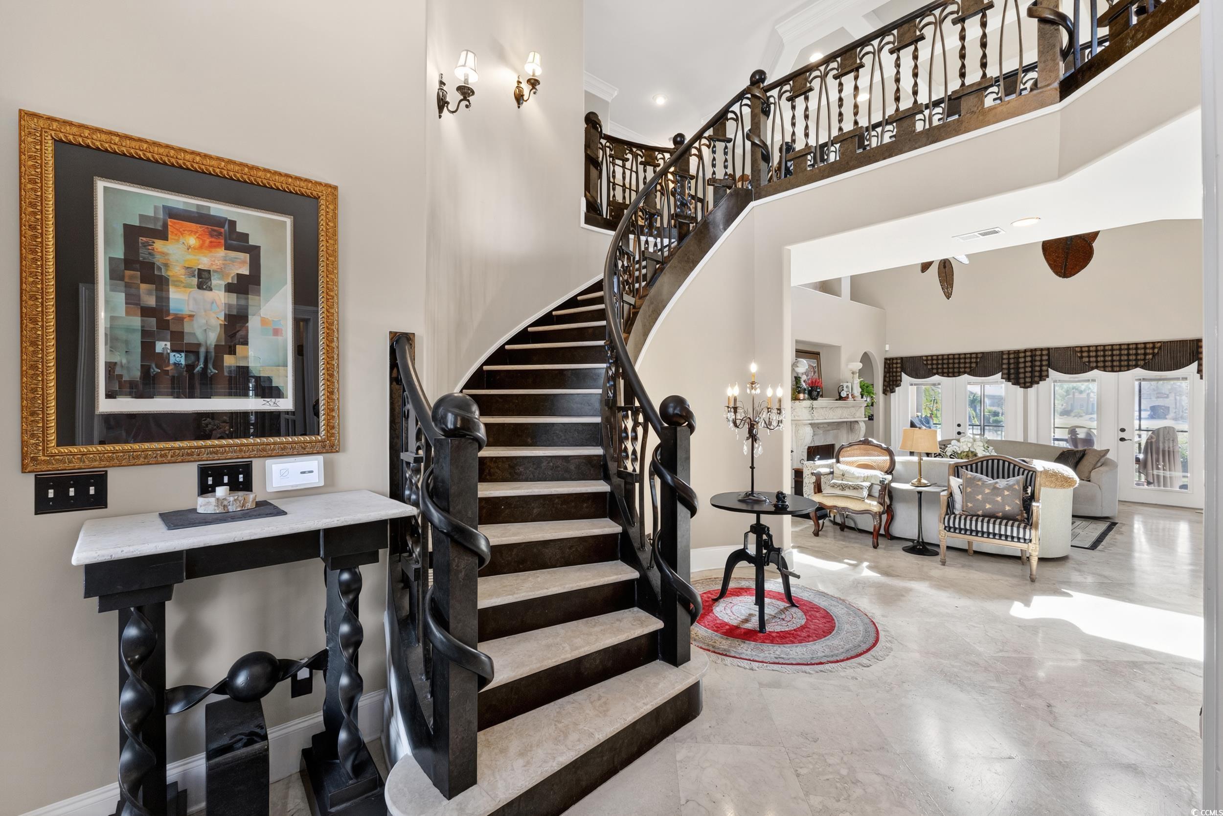 Exquisite Coastal Retreat in Bluffs on the Waterway! Luxury, Comfort, and Convenience in a Prestigious Gated Community Welcome to your dream home in the prestigious gated community of Bluffs on the Waterway—where luxury, comfort, and convenience meet the serene beauty of coastal living. This remarkable 5-bedroom, 3.5-bath residence was extensively updated in 2023 and features stunning upgrades and one-of-a-kind details throughout. Step into a grand interior with a breathtaking custom-designed metal and stone staircase and matching foyer table, both handcrafted by renowned artist Robert Sadlemire. The living room exudes elegance with soaring coffered ceilings and a beautiful stone fireplace, while the formal dining room impresses with its own coffered ceiling and built-in storage. Just off the foyer, a stylish powder room adds function and flair. For those who love to cook and entertain, the gourmet kitchen is a chef’s delight, featuring dual sinks, double ovens, a gas cooktop, granite countertops, and high-end stainless steel appliances. The open layout connects seamlessly to the living area, perfect for gatherings with family and friends. Retreat to your private master suite on the main floor, complete with a cozy fireplace and a custom walk-in closet designed like a boutique—complete with floor-to-ceiling shelving, a center island with seating, and a chandelier overhead. Indulge in the spa-inspired master bath, which boasts a stand-alone copper soaking tub, copper tile inlays, and luxurious copper sinks and faucets. Quartzite countertops are featured throughout the master closet and bath. Enjoy peaceful mornings or relaxing evenings on the screened-in porch overlooking a tranquil pond and fountain. Additional highlights include an ice maker, dedicated wine closet, fully insulated interior walls for enhanced privacy and efficiency, and an oversized 2+ car garage with space for three vehicles and two tankless water heaters. The spacious laundry room features custom floor-to-ceiling cabinetry for maximum organization. Upstairs, you’ll find four generous bedrooms—two sharing a Jack-and-Jill bath, and two with access to a full bathroom. The walkway between two separate wings overlooks the magnificent living room below. A versatile bonus room offers the ideal space for games, entertaining, or family movie nights. Recent replacement of carpeting throughout the 2nd floor. As a resident of The Bluffs, you’ll enjoy amenities including a resort-style clubhouse, swimming pool, tennis courts, playground, private boat ramp, and secure boat storage along the scenic Intracoastal Waterway. Located in the coveted Carolina Forest school district, you’ll benefit from easy access to International Drive, Highway 31, and be just seven minutes from Myrtle Beach International Airport. This extraordinary home is the perfect blend of sophistication and comfort—ready to welcome its next owner. Don’t miss your chance to own a piece of paradise in Bluffs on the Waterway. Contact your Realtor today to schedule a private showing. Check out the virtual tour!
