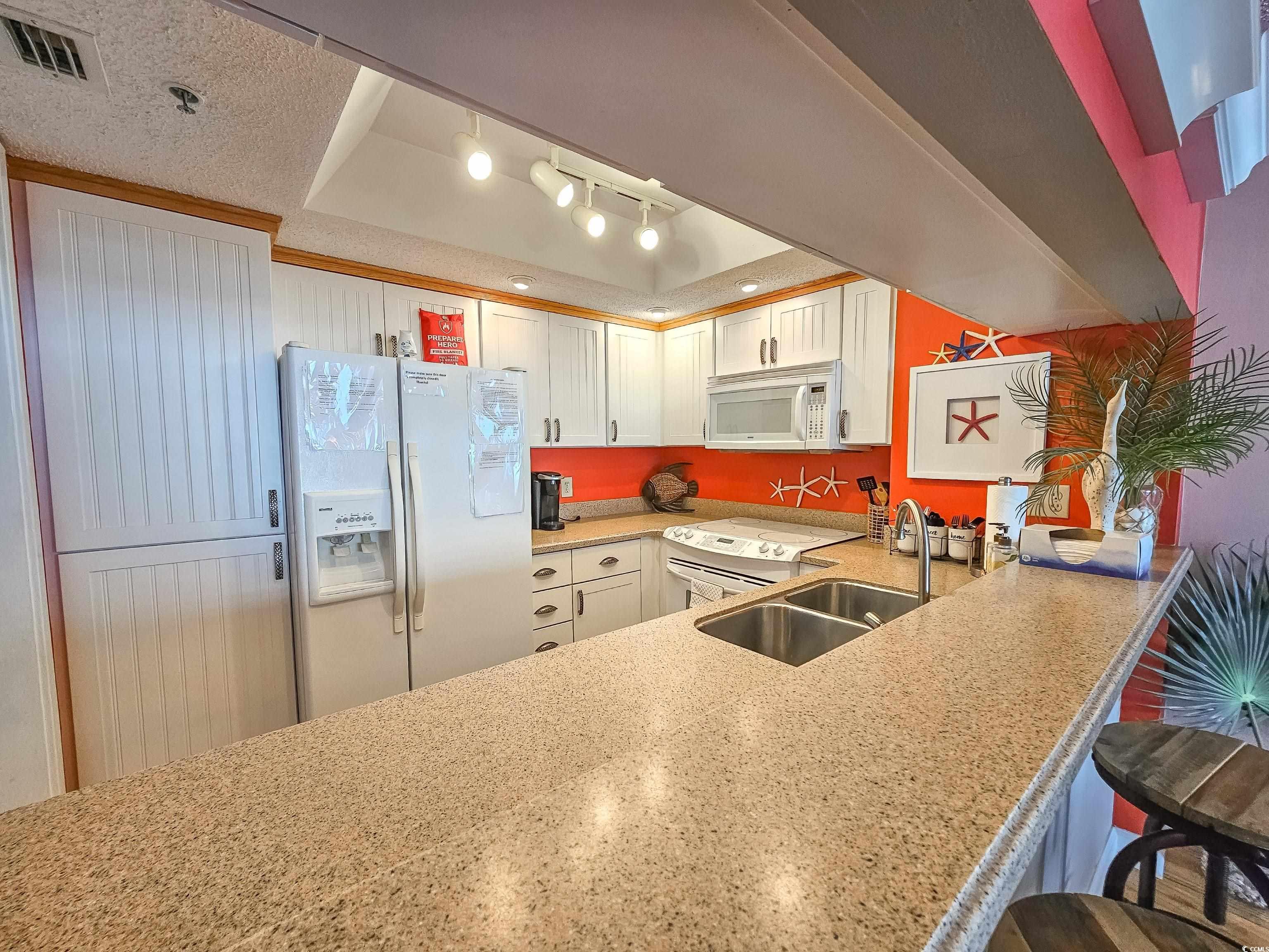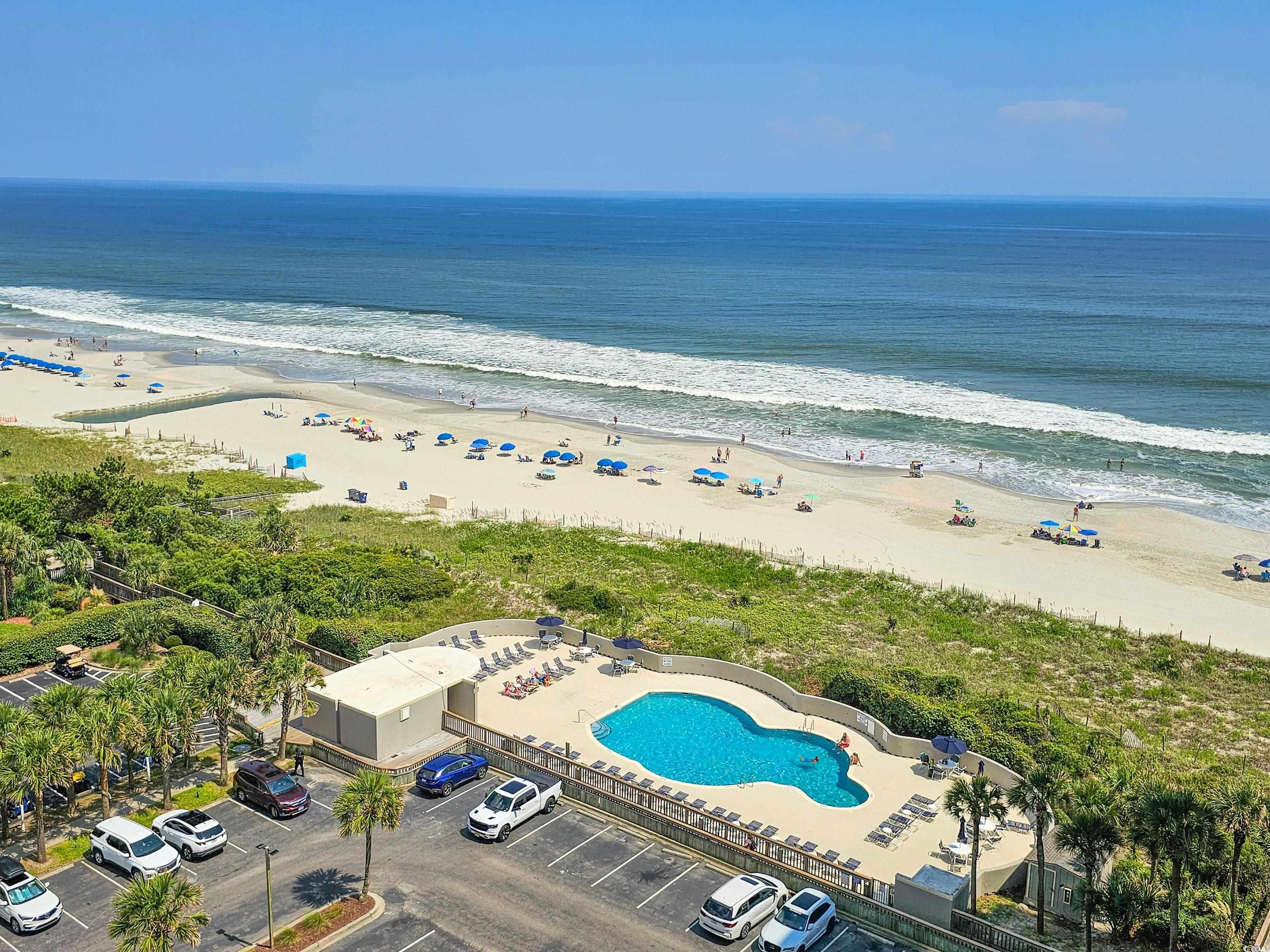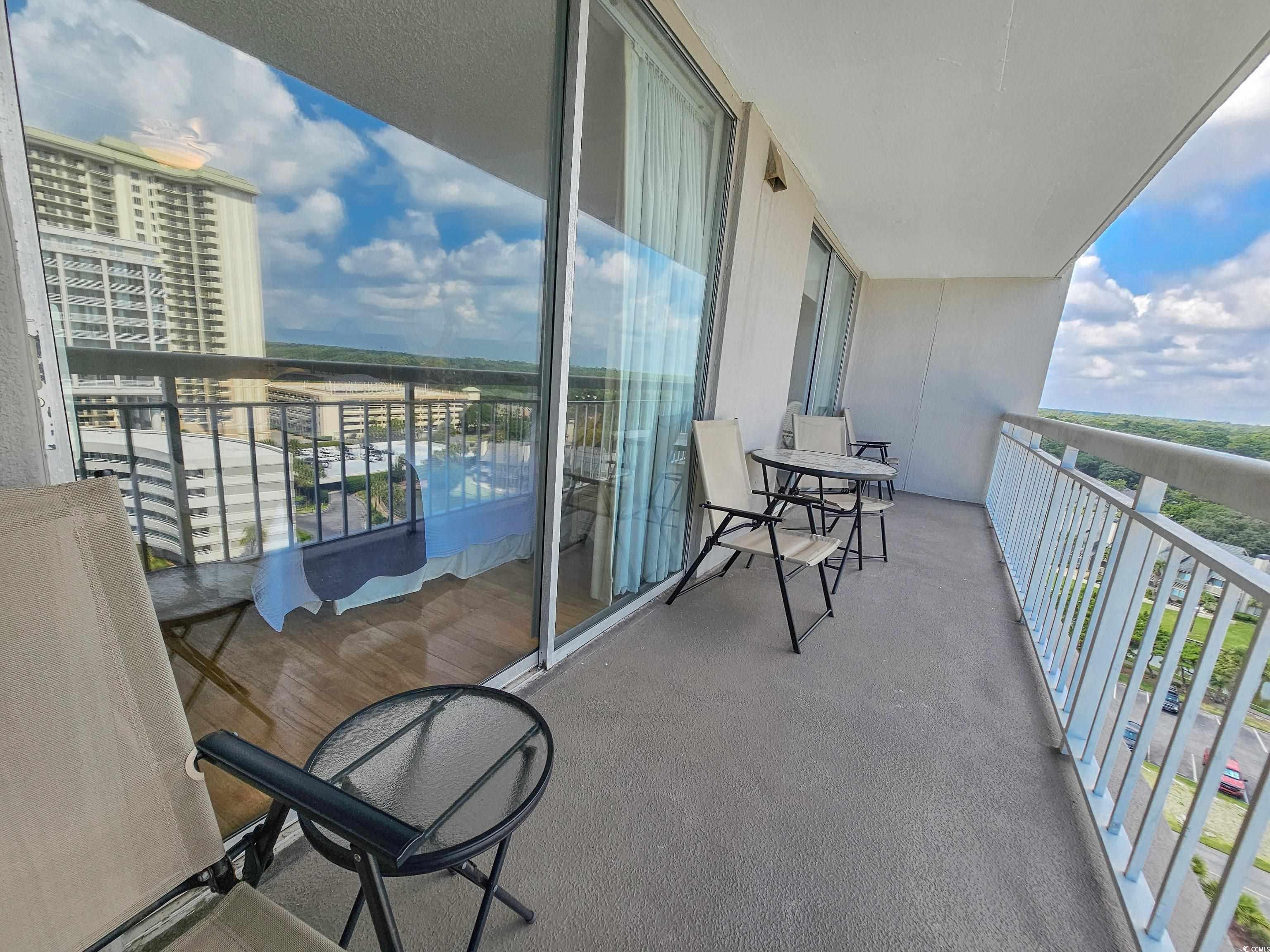 Indulge in unparalleled views from this charming two-bedroom, two-bath residence. The kitchen has been remodeled with custom cabinets, track lighting, solid surface counter tops, beautiful LVP flooring, and tile in both baths. Large primary suite with sitting area. Sold fully furnished. You will have endless ocean views from one of the three balconies! Perfect for primary residence, second home, or rental options. Newly remodeled lobby in this oceanfront tower. The Kingston Resort has a Spa & Fitness center (additional cost) with pickle ball, tennis courts, indoor pool, golf simulator, putting green, restaurants, a gated community with 24-hour security, multiple swimming pools, a 12-acre fresh water lake and the list goes on! Some resort amenities are only available through the Hilton on-site rental program.