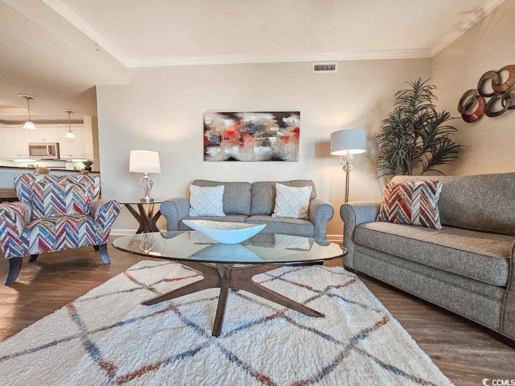 Amazing views await you from every corner of the living room and master bedroom of this three-bedroom, three-bathroom residence in Royale Palms! Located on the 16th floor, this is a very special, priced-to-sell property! Updated and appointed with LVP flooring, new paint, and furnishings. The expansive living and dining area boasts stunning ocean views, with direct access to a large balcony, perfect for enjoying the fresh ocean air. The dining area comfortably seats eight, while the kitchen features a black granite finish, stainless steel appliances, and a breakfast bar with three stools. The master bedroom offers a tray ceiling, balcony access, and mesmerizing ocean views from the bed. The attached private bath is a true retreat, featuring a whirlpool tub, a separate walk-in shower, and a double vanity with granite countertops. Enjoy spectacular inland views from this oversized bath. The guest bedrooms feature two double beds, offering plenty of space and stunning inland views. The second bedroom has a private bath with a tiled shower. Connected by a covered glass walkway to the Myrtle Beach Hilton Hotel, with access to several restaurants.