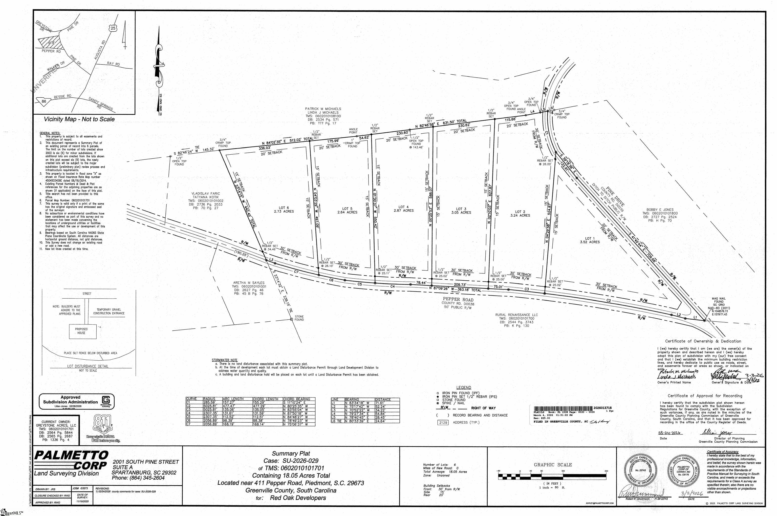 This property has been subdivided into 6 lots and has been approved by Greenville County as a minor subdivision. Individual tax map numbers and street addresses are being issued. Builder is responsible for stormwater and land disturbance permits. This rare 18.05-acre parcel in the growing Piedmont area is now available for a builder looking to create an exclusive custom home community. Property Highlights: Prime Development Opportunity – large parcel ready for subdividing. Site Plan completed by BlueWater Civil Design. Per site plan - 6 estate-sized lots (2.5+ acres each). Minor subdivision approval by Greenville County. Woodmont High School and Woodmont Middle School are +/- 5 miles away. Unzoned Land – Flexibility to design a premier residential enclave. Road Frontage on Pepper Drive and Pine Drive – Easy access for development Access to Public Water – water line on Pepper Road. Greenville Water Service Letter in documents. No sewer available. Mostly Level Terrain & Mature Trees – A scenic, natural setting perfect for luxury homes. Minutes from Highway 25 & Downtown Greenville – +/- 15 miles from Main Street Greenville and +/- 25 miles to downtown Anderson. Minutes from the newly announced Isuzu plant.