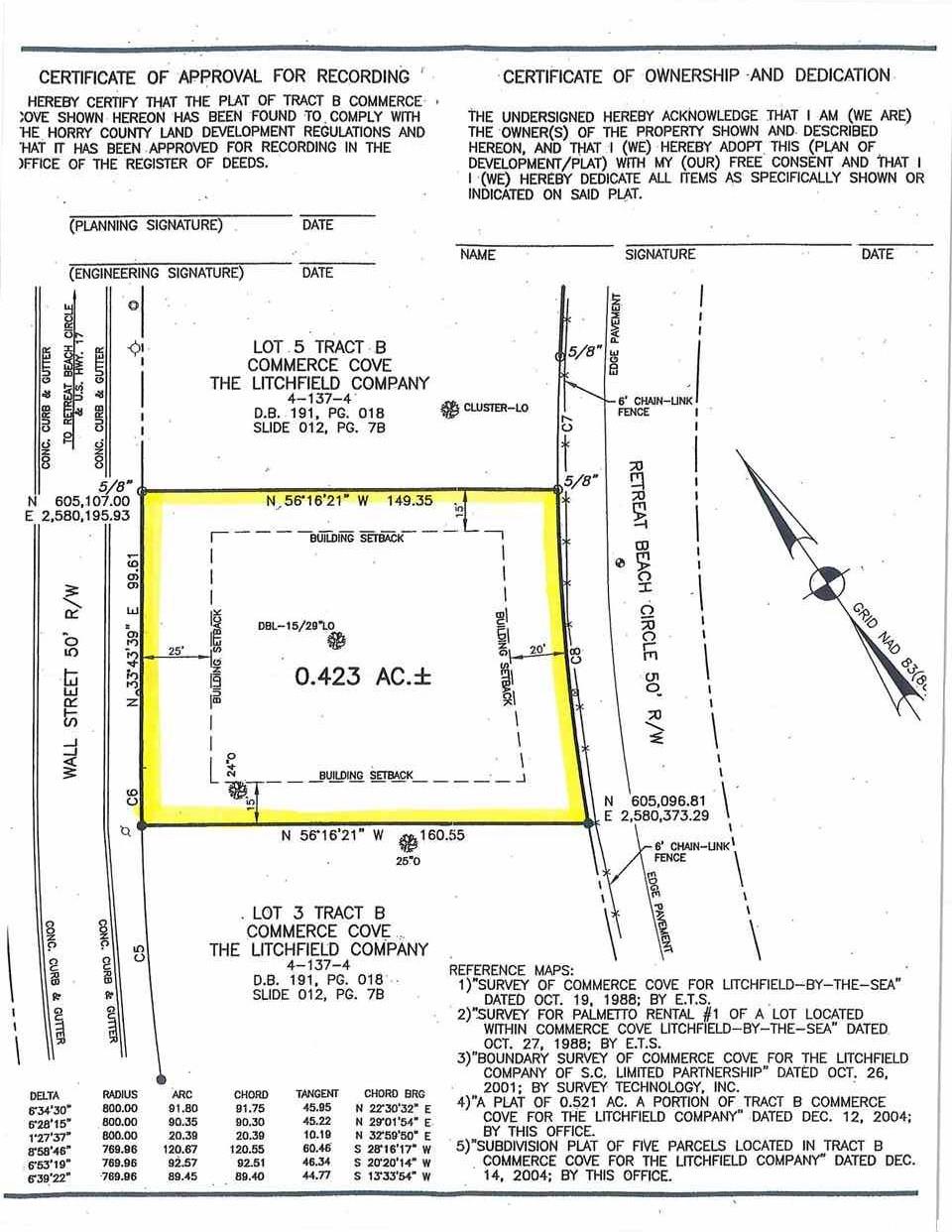 LOCATION! LOCATION! LOCATION! Prime commercial real estate on Wall Street, one block off of Highway 17 located seconds from the entrance to Litchfield By The Sea! BIG benefit here is the infrastructure is in place including master storm water retention and spine road saving on cost of construction. Excellent parcel for professional offices including medical doctors' offices, dental offices, clinics, etc., for health diagnosis, treatment, and consultation), lawyers, accountants, financial services (accountants, auditors, financial analysts, and investment bankers), architectural & engineering offices (architects, engineers including civil, mechanical, electrical, etc. and surveyors, consultants) other professional services (real estate brokers, insurance agents, therapists, etc.) and specialized business support including management, IT, and public relations expertise. *********************************************************** BONUS! With ownership of this parcel comes access to Litchfield By The Sea amenities (tennis, pickleball, gym, indoor pool, beach club, crabbing dock, fishing dock, walking and biking trails, public beach access with-in the resort. THIS IS THE LAST PARCEL AVAILABLE ON WALL STREET! Call and make your appointment today!