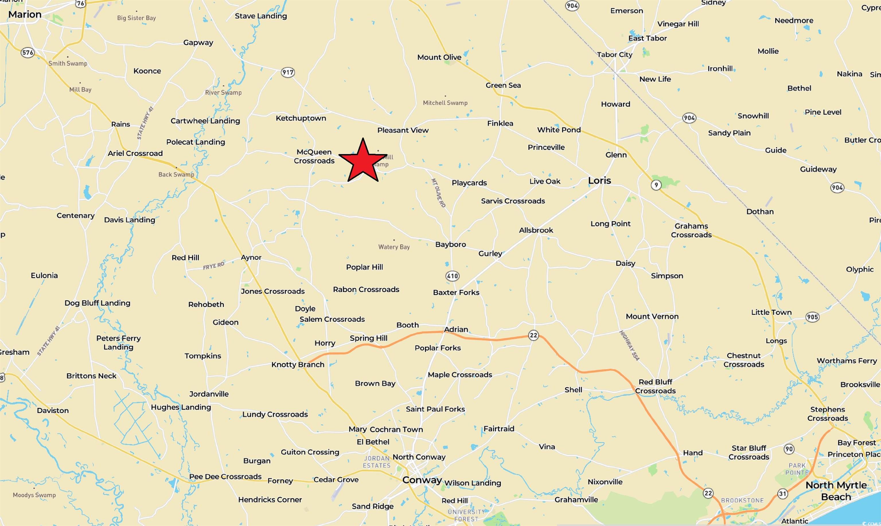 REDUCED!!! Located right in western Horry County lies "Gobbler's Roost" that consists of seven LARGE ESTATE ready for your new home! Lots range in size from 1.49 to over 6 acres. Three lots contain a mixture of mature forest and open field with more than adequate road frontage for endless possibilities! Perfect place to build a new home or mini-farm well within Horry County's rural countryside but well within reach of Conway and Myrtle Beach and within the AYNOR SCHOOL DISTRICT! Lot #2 (1.70 ac. – 160ft. along HWY 308ft. deep) This new neighborhood couldn't be more fitting for residents and non-residents of Horry County looking for a new homestead in the quiet community along HWY 308. Lots are nestled at the intersection of HWY 308 and Johnson Road between Galivant's Ferry and Green Sea. Perfect place to build your new home with plenty of room to stretch out and have everything you need to call this your new piece of heaven. "Gobbler's Roost" has seven lots that range in size from 1.49 acres to over 6 acres. Most of the parent tract was a former agriculture field that drains well and is high and sandy with ample room for home sites, pastures, garages, barns, fields, and really just about anything else you can dream up in your country farm plan. Three of the seven tracts contains mature forest filled with pine and hardwood trees that is excellent wildlife habitat and home to deer, turkey, and small game. If you have been looking for a building site with plenty of room and along public roadways, but in a quiet country setting away from the hustle and bustle, your time has come! And any one of these seven tracts will be perfect for creating new memories in your family. "Gobbler's Roost" is less than 30 minutes from Conway and just under 45 minutes from Myrtle and North Myrtle Beach. The adjacent lands contain small homesteads and several large agriculture operations located within the periphery. (No Deed Restrictions) Well and septic required.