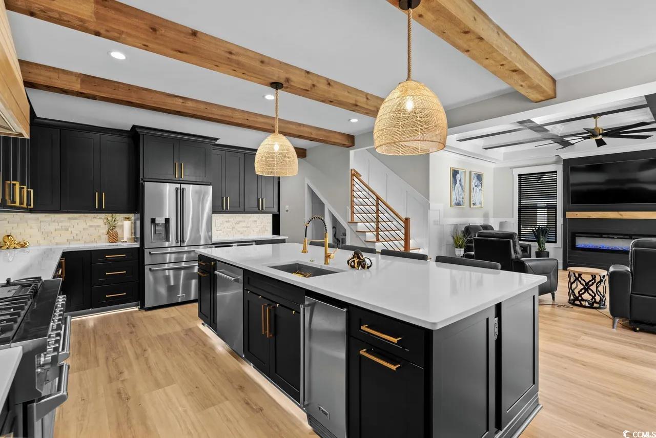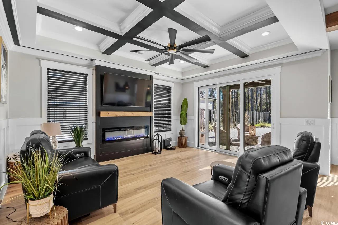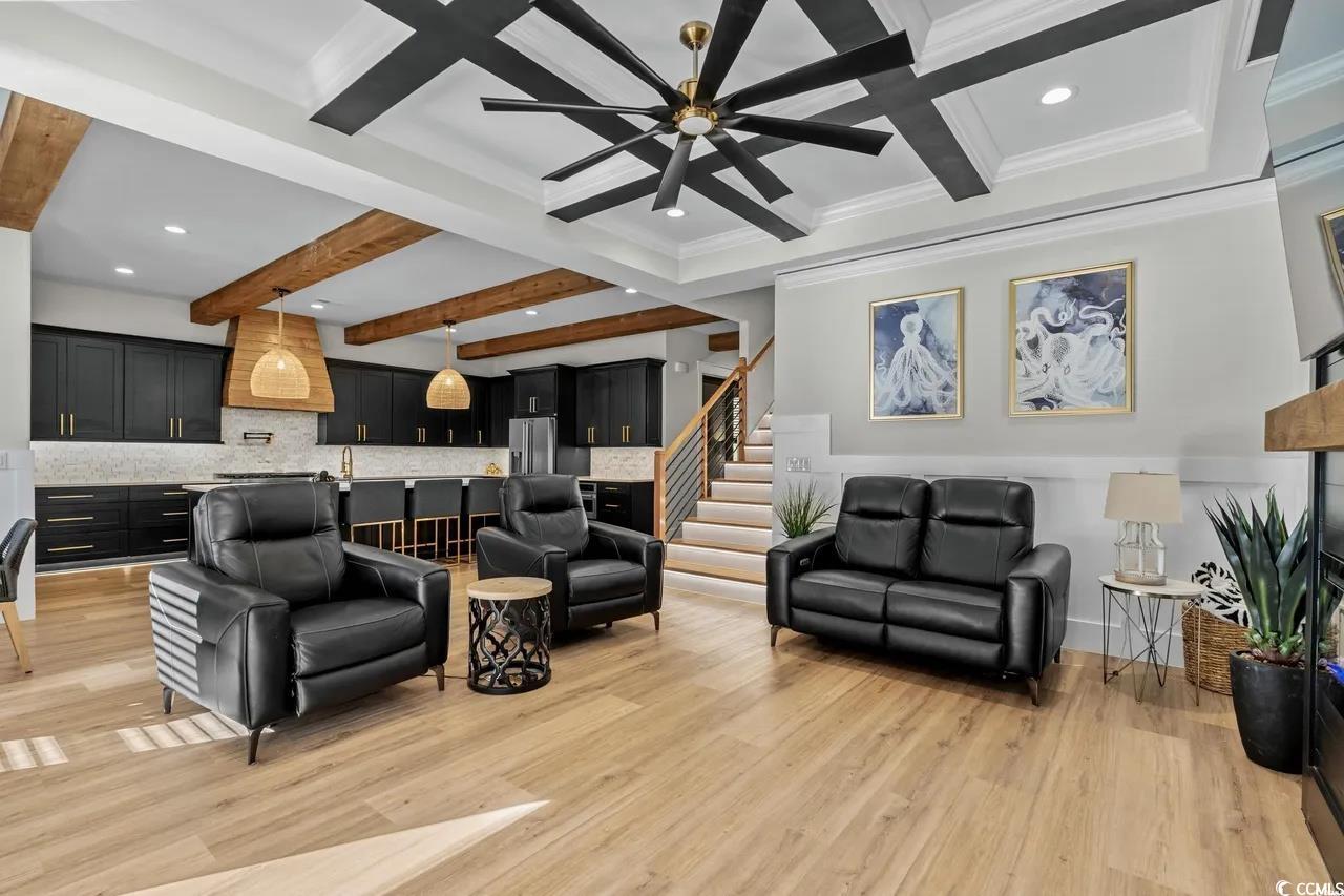 This NO HOA to be built property features an impressive 5 Bed / 6.5 Bath modern home with unique architectural details. The home itself features multiple windows with charming shutter details, and the welcoming porch includes a lovely columned entryway. The design blends both contemporary and rustic elements. Whether you're seeking privacy or a spacious layout, this home offers both—backed by a peaceful wooded backdrop. Perfect for those looking for a private yet stylish residence. The kitchen is a blend of sleek modern design and functional elegance, featuring dark cabinetry with gold hardware accents. The large island with a pristine white countertop is a standout feature, perfect for both cooking and entertaining. The high-end appliances, including a stainless steel fridge and range, are seamlessly integrated into the space. Pendant lighting with woven shades adds a touch of warmth, while exposed wooden beams above bring a natural, rustic element to the space. The living room exudes a contemporary feel featuring stylish coffered beams, and the open layout allows for plenty of natural light. Ideally situated near top-rated schools, you’re just minutes from the famous Murrells Inlet Marsh Walk, yet far enough out to enjoy peace, privacy, and the natural beauty of the area.